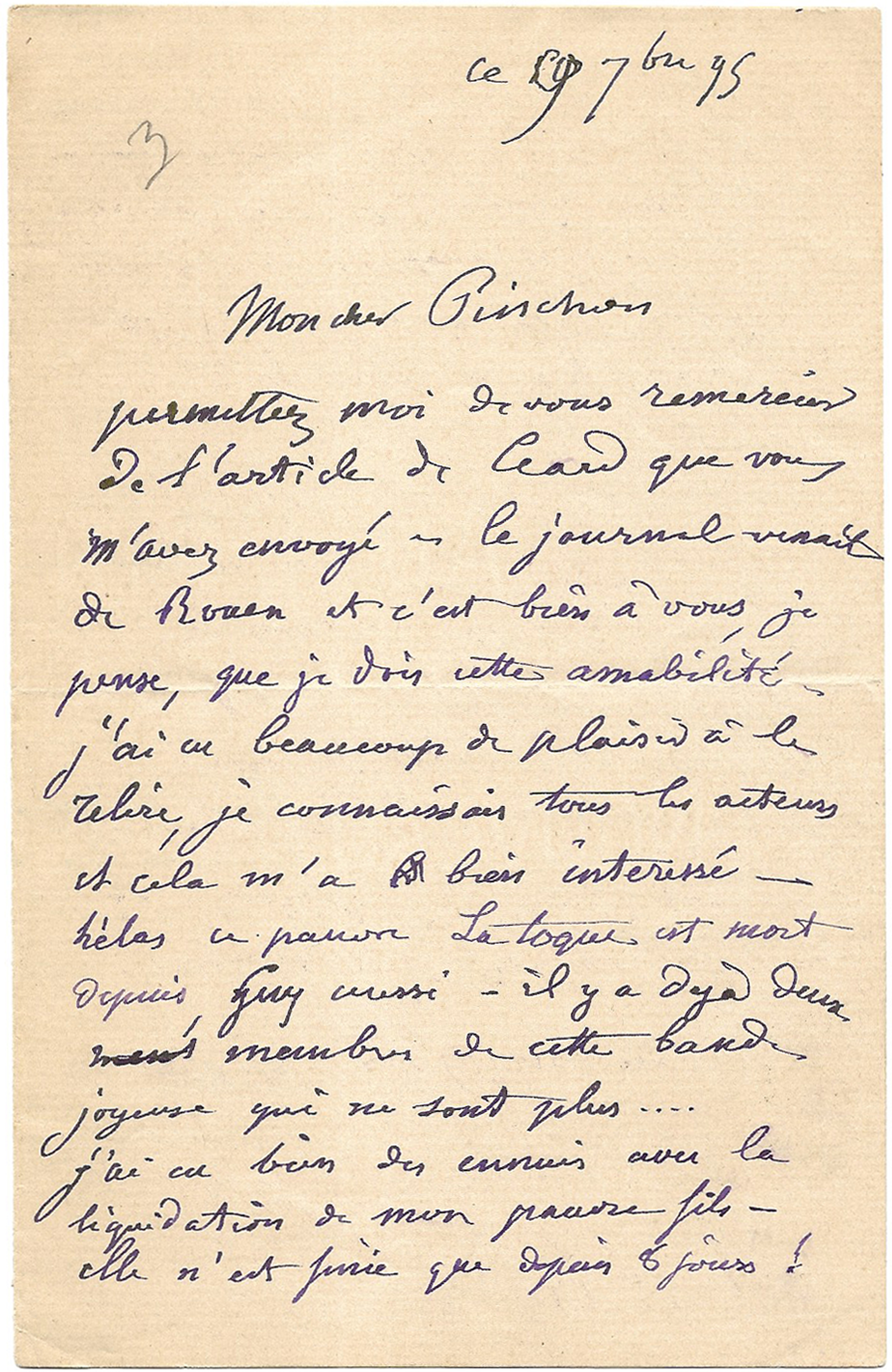 Permettez-moi de vous remercier de l’article de Céard [nous n’avons pas retrouvé l’article dont il est ici question] que vous m’avez envoyé. Je journal venait de Rouen et c’est bien à vous, je pense, que je dois cette amabilité. J’ai eu beaucoup de plaisir à le relire, je connaissais tous les acteurs et cela m’a bien interessé – hélas ce pauvre La Toque¹ est mort depuis, Guy aussi – il y a déjà deux membres de cette bande joyeuse qui ne sont plus…