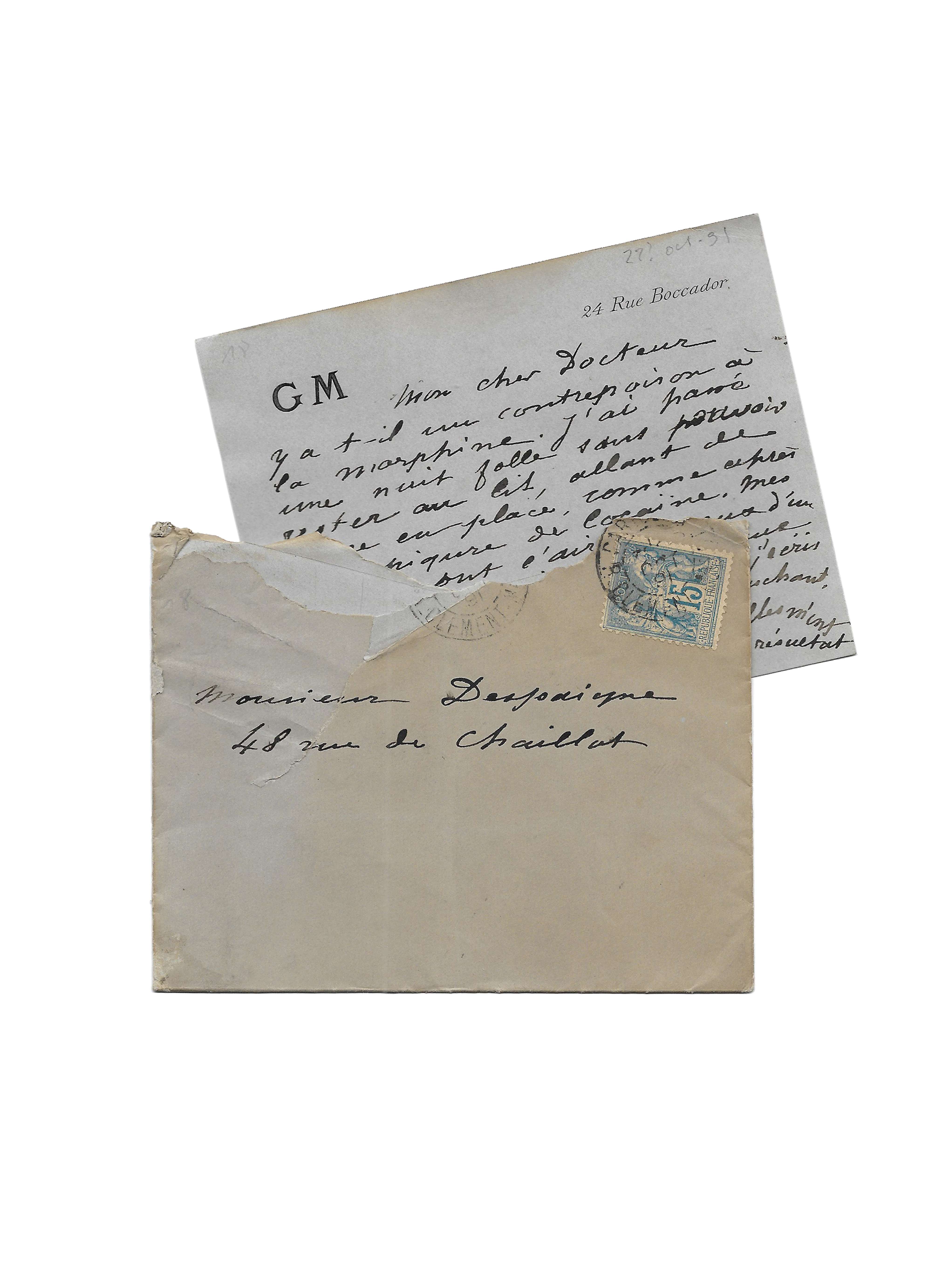 Les piqures de morphine que m’a ordonnées Dr Grancher me font dormir quelques heures, mais avec de telles crises rien n’a de pouvoir […] L’état où j’étais à Paris, vous l’avez vu. Il n’était rien auprès de celui d’ici […]