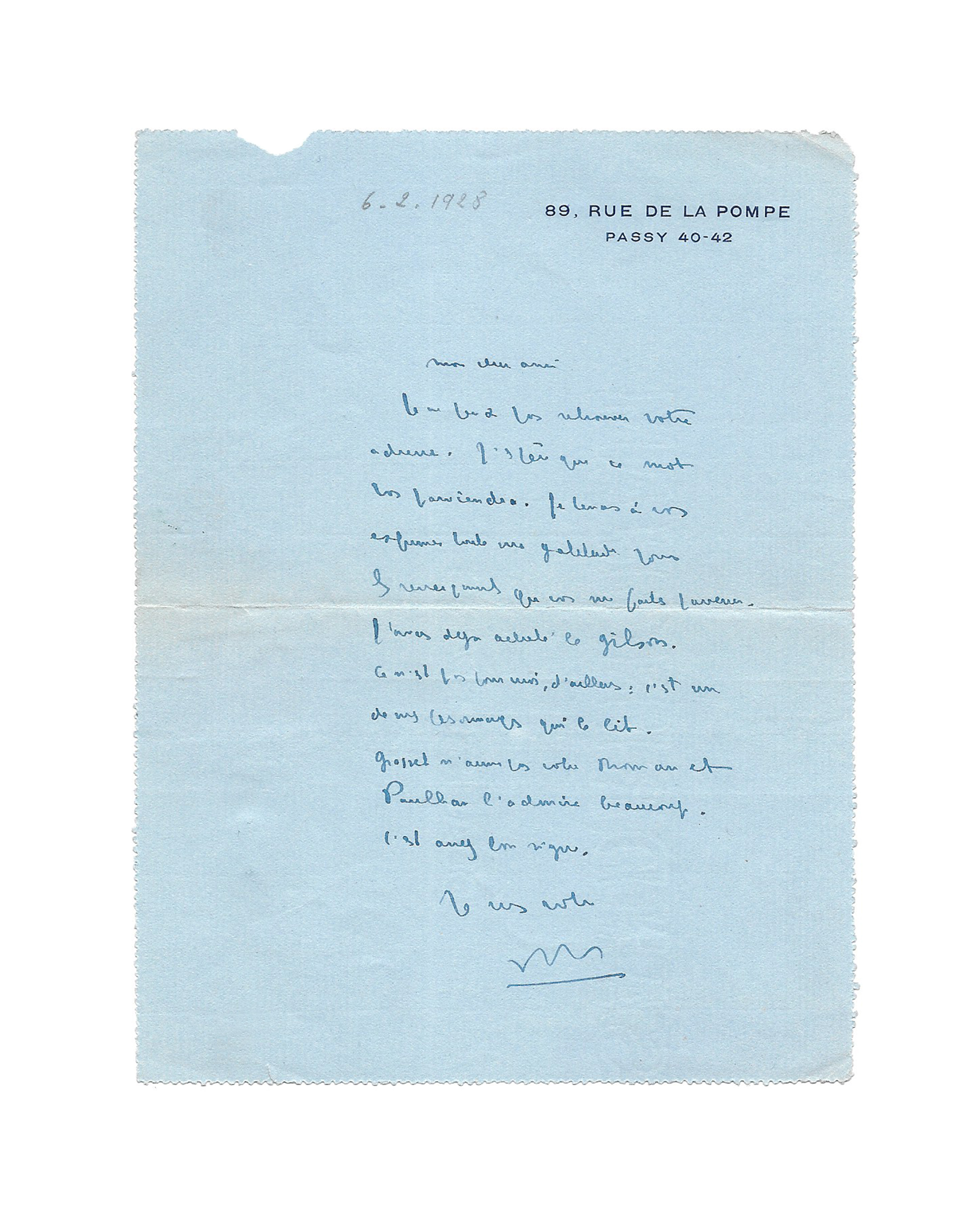 [Paris, 6th February 1928], 1 p. petit in-8°