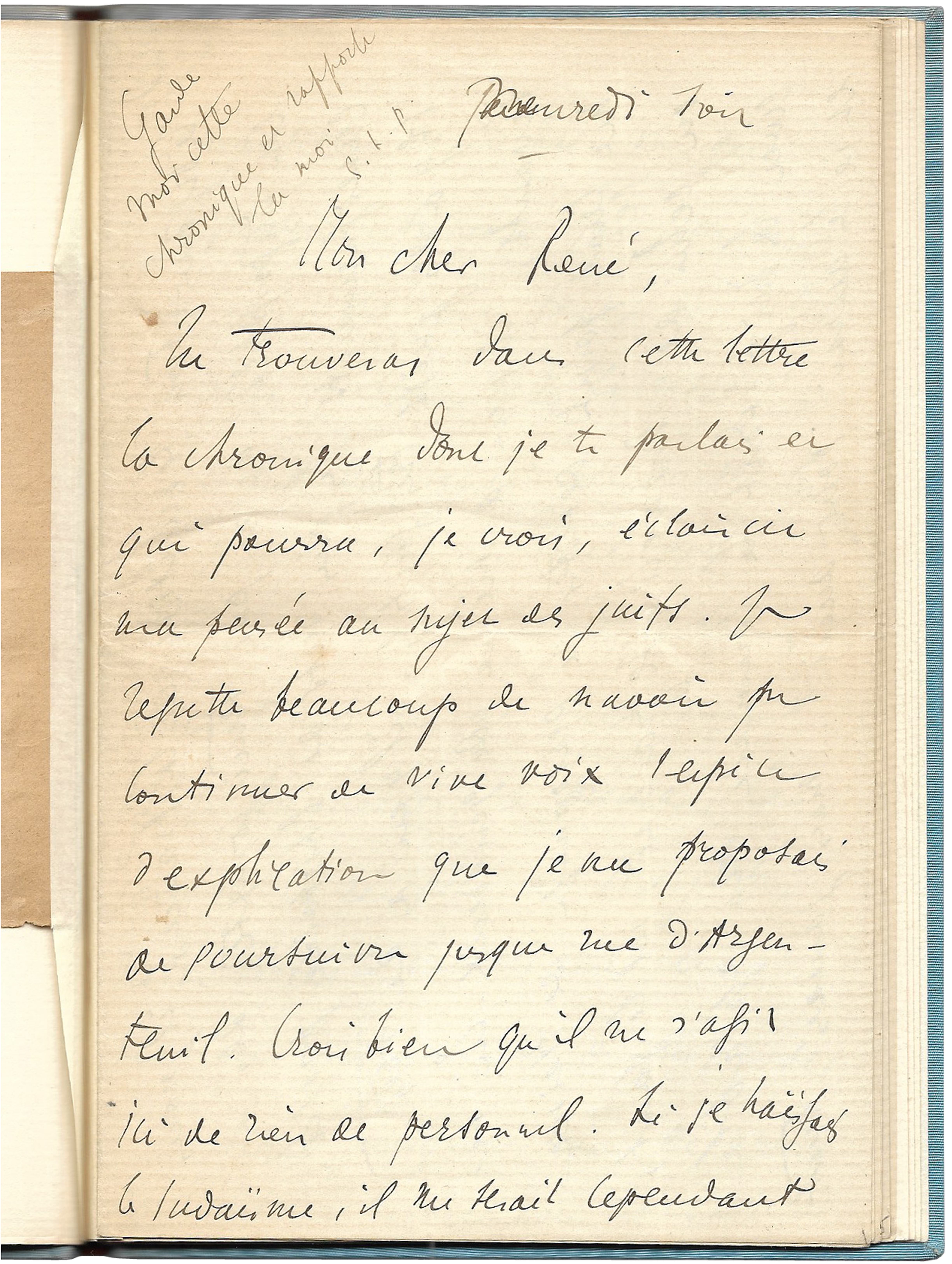 Tu trouveras dans cette lettre la chronique dont je te parlais et qui pourra, je crois, éclaircir ma pensée au sujet des juifs. […] Si je haïssais le judaïsme, il me serait cependant impossible de le haïr plus que le protestantisme, que j’ai en horreur plus que tout. : or, s’il y a deux protestants dans la société [l’Escolo Felibrenco], c’est moi qui les ai introduits : [Marcel] Coulon et [Jules] Ronjat m’ont tous deux demandé d’être leur parrain et c’est moi qui ai moralement obligé Amouretti à préciser, le jour de la réception de Roujat, notre parfaite indifférence en matière confessionnelle et religieuse.