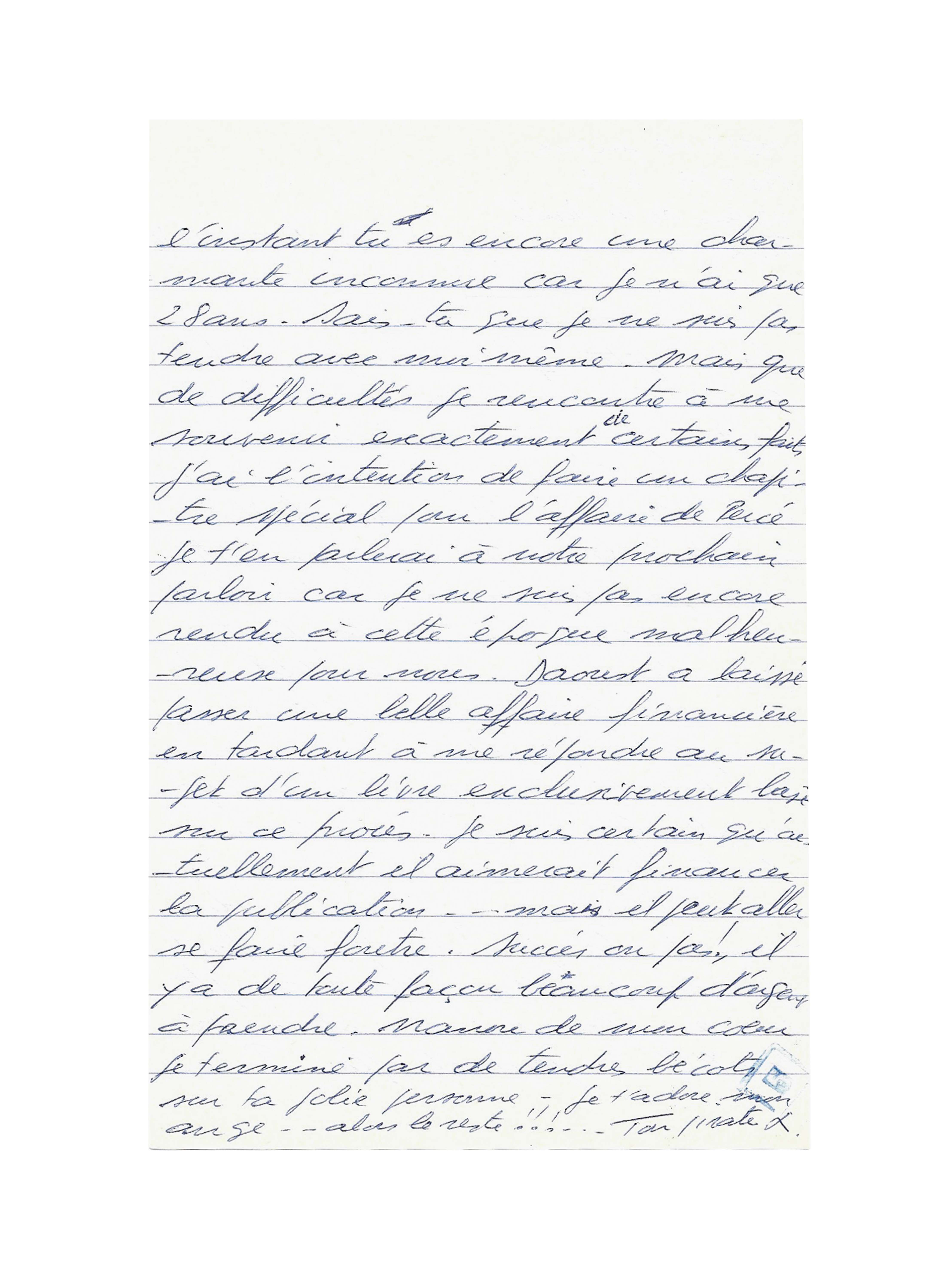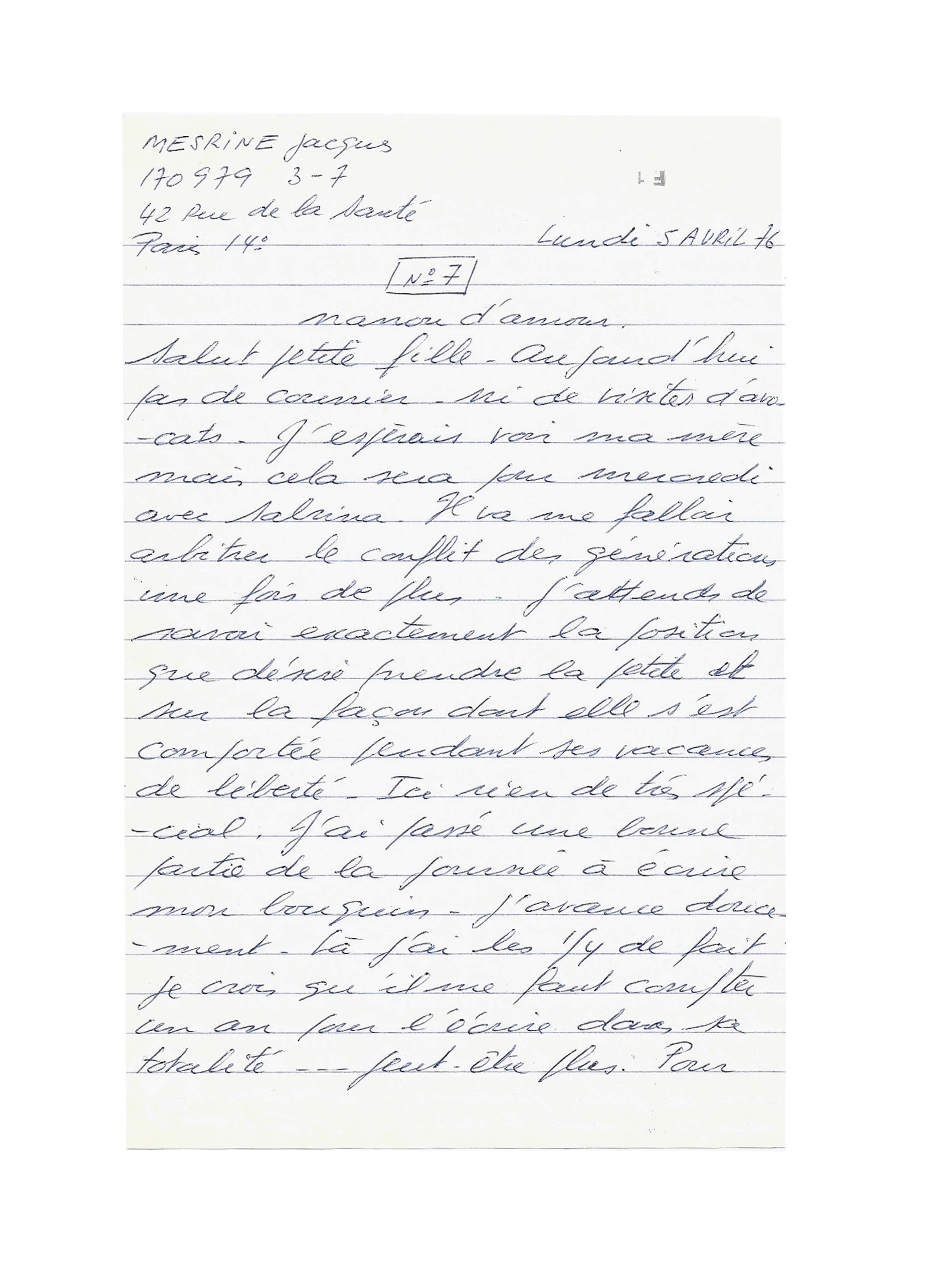 Salut petite fille. Aujourd’hui pas de courrier. ni de visites d’avocats. J’espérais voir ma mère mais cela sera pour mercredi avec Sabrina [la fille de Jacques Mesrine]. Il va me falloir arbitrer le conflit des générations une fois de plus. J’attends de savoir exactement la position que désire prendre la petite et sur la façon dont elle s’est comportée pendant ses vacances de liberté. Ici rien de très spécial. J’ai passé une bonne partie de la journée à écrire mon bouquin [L’Instinct de mort]. J’avance doucement. Là j’ai les 1/4 de fait, je crois qu’il me faut compter un an pour l’écrire dans sa totalité…. peut-être plus. Pour l’instant tu es encore une charmante inconnue car je n’ai que 28 ans… Sais-tu que je ne suis pas tendre avec moi-même. Mais que de difficultés je rencontre à me souvenir exactement de certains faits. J’ai l’intention de faire un chapitre spécial pour l’affaire de Percé. Je t’en parlerai à notre prochain parloir car je ne suis pas encore rendu à cette époque malheureuse pour nous. Daoust [avocat de Mesrine, le plus grand criminaliste de l’époque] a laissé passer une belle affaire financière en tardant à me répondre au sujet d’un livre exclusivement basé sur ce procès. Je suis certain qu’actuellement il aimerait financer la publication… mais il peut aller se faire foutre. succès ou pas ! il y a de toute façon beaucoup d’argent à prendre. Nanou de mon cœur je termine par de tendres bécots sur ta jolie personne – je t’adore mon ange… alors le reste !!! Ton pirate x »