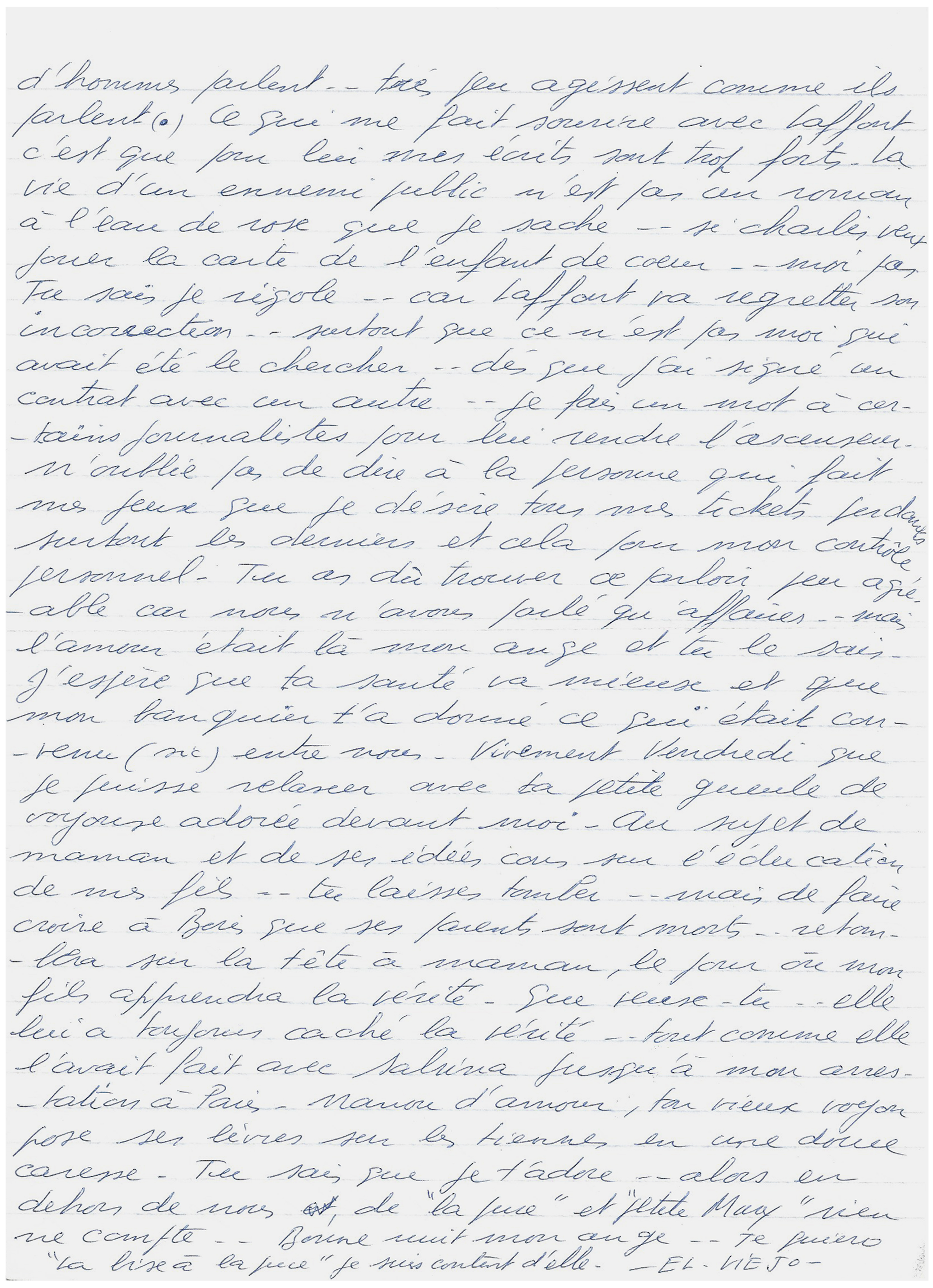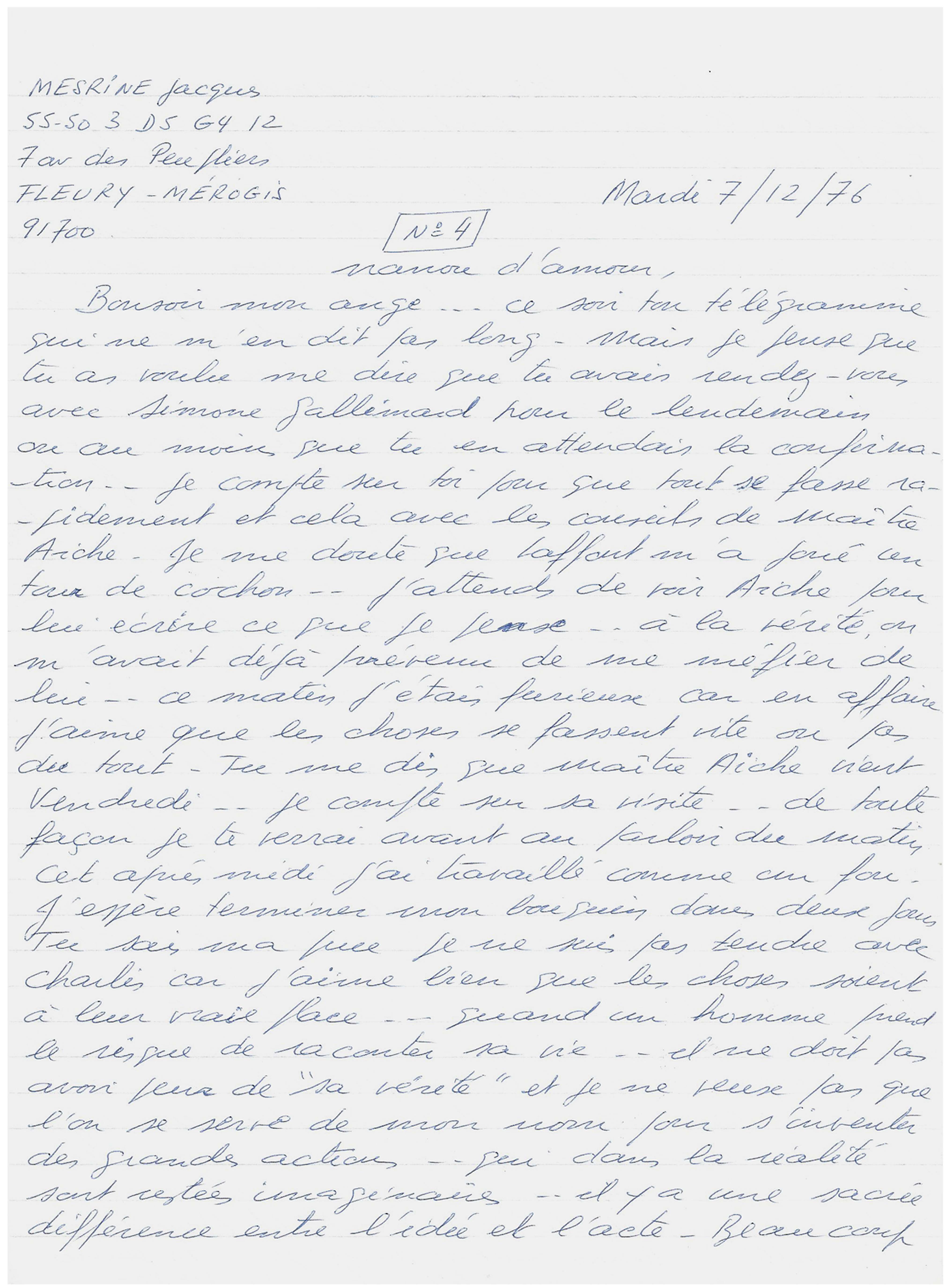 Tu sais je rigole… car Laffont va regretter son incorrection… surtout que ce n’est pas moi qui avait été le chercher, dès que j’ai signé un contrat avec un autre… je fais un mot à certains journalistes pour lui rendre l’ascenseur […] Vivement vendredi que je puisse relaxer avec ta petite gueule de voyouse adorée devant moi. Au sujet de maman et de ses idées cons sur l’éducation de mes fils… tu laisses tomber… mais de faire croire à Boris [l’un des deux fils de Mesrine] que ses parents sont morts… retombera sur la tête à maman, le jour où mon fils apprendra la vérité. Que veux tu… elle lui a toujours caché la vérité… tout comme elle l’avait fait avec Sabrina [la fille de Jacques Mesrine] jusqu’à mon arrestation à Paris. Nanou d’amour, ton vieux voyou pose ses lèvres sur les tiennes […] Tu sais que je t’adore […] Bonne nuit mon ange […] El Viejo »