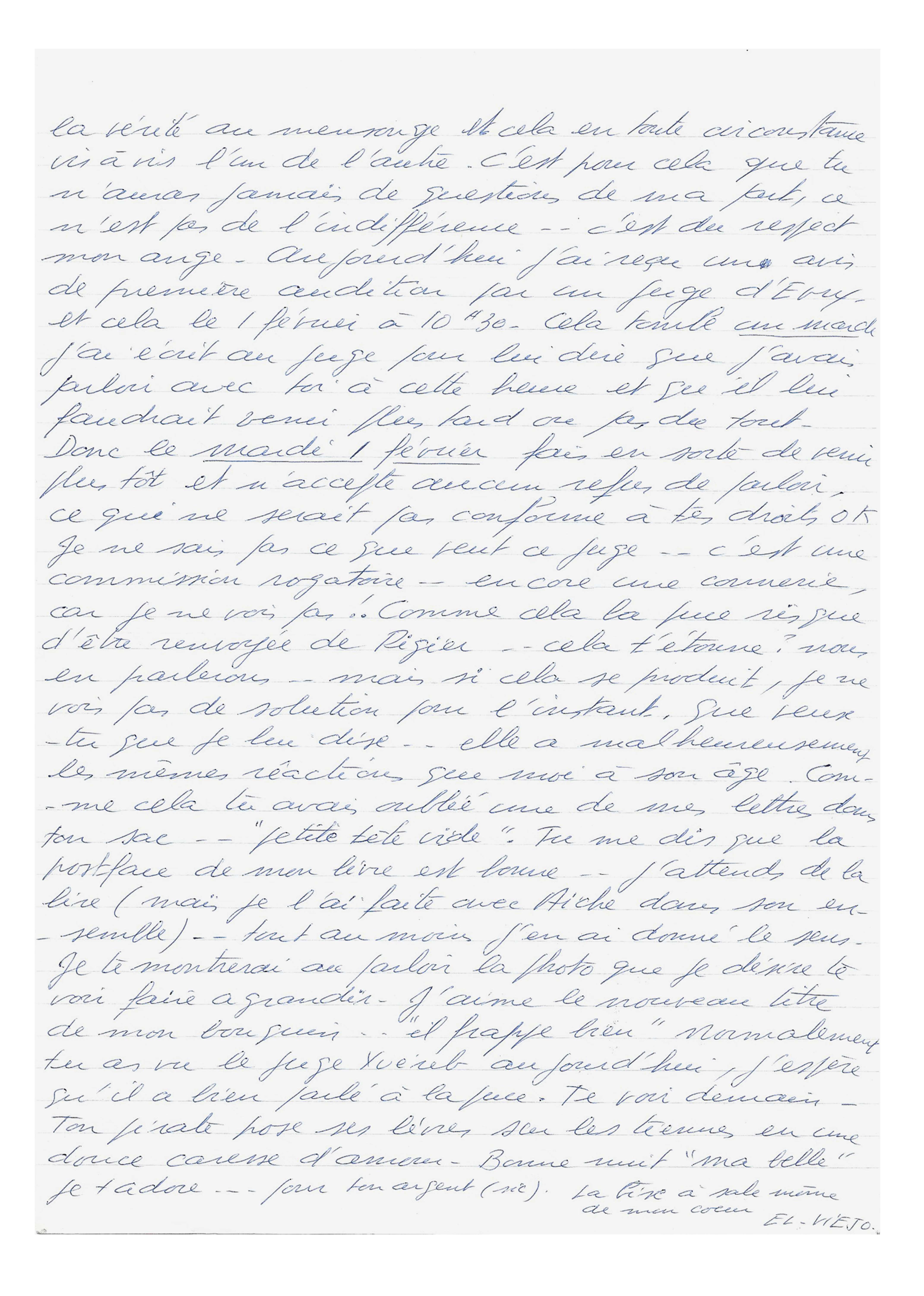 « Bonsoir chaton, ce soir deux lettres (lundi-mardi) et deux de la puce. Comme cela tu me retrouves “amoureux”… Je le suis toujours mon ange… mais il ne dépend que de toi pour que je l’exprime un peu plus. Tu sais petite fille, quand une lettre pass par bon nombre de mains… cela freine l’ardeur de ce que l’on aimerait écrire. Car on se sent violé dans ses pensées les plus intimes. Il est vrai que je retrouve unu amour plus prenant, car je te vois comme tu étais acant… il y a 7 ans 1/2… te je retrouve avec un rire franc… un rire libre.. pendant 7 ans 1/2 nous avons sauvegardé notre amour.. maintenant nous pouvons nous aimer… là est la différence. Et puis je te trouve désirable avec ta jolie petite gueule de voyouse et tes cheveux blancs qui te donnent énormément de charme […] Tu es de ces femmes qui font passer leur cœur avant leur ventre.. cela je le sais mon ange. Je te respecte et je t’aime, car je sais que tous les deux, cela sera toujours “blanc bleu”, nous préférons la vérité au mensonge […] Aujourd’hui j’ai reçu un avis de première audition par un juge d’Évry et cela le 1er février à 10h30. Cela tombe un mardi et j’ai écrit au juge pour lui dire que j’avais parloir avec toi à cette heure et qu’il lui faudrait venir plus tard ou pas du tout.