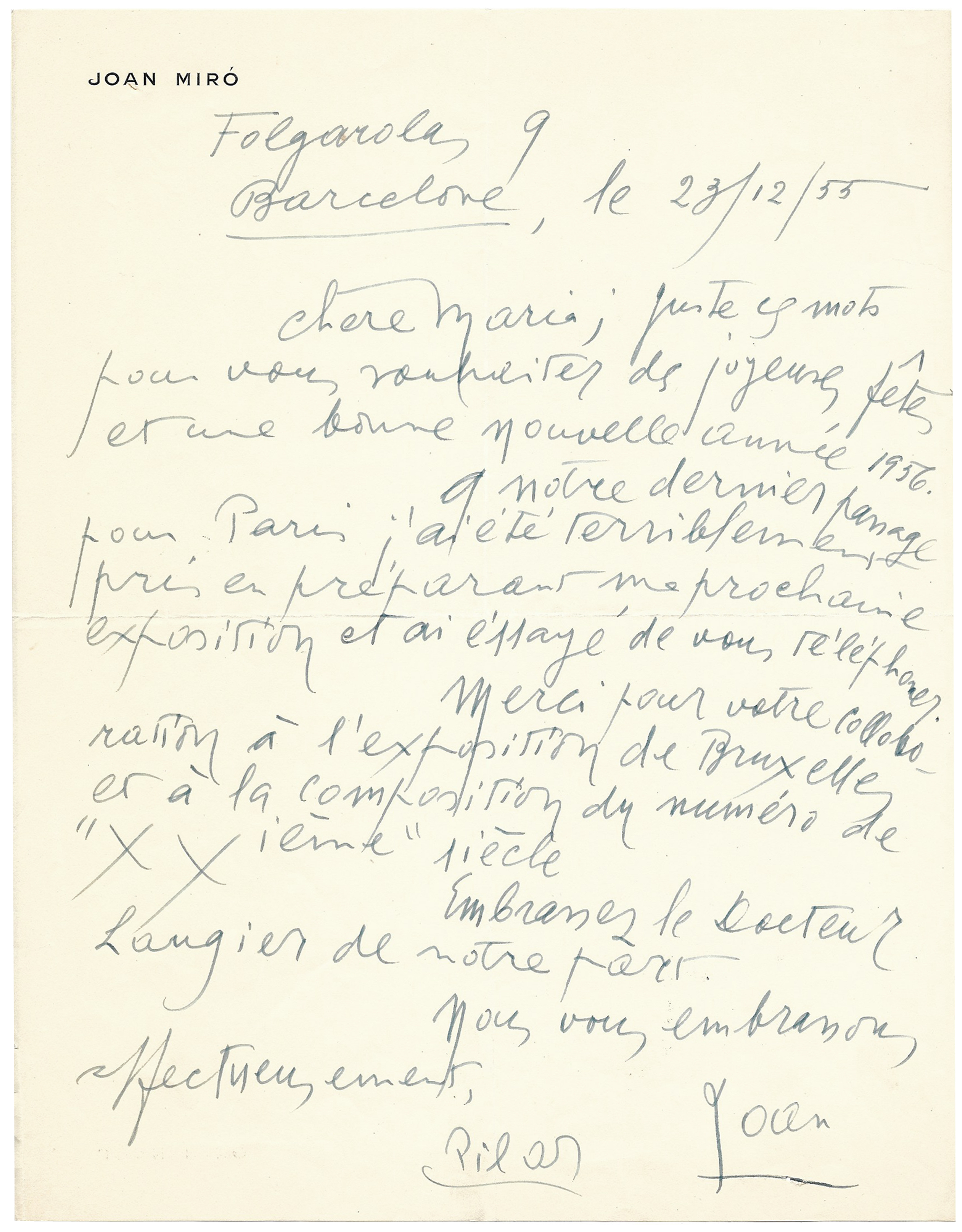 Nice letter from Miró, then in the middle of work for his next exhibition at the Palais des Beaux-Arts in Brussels