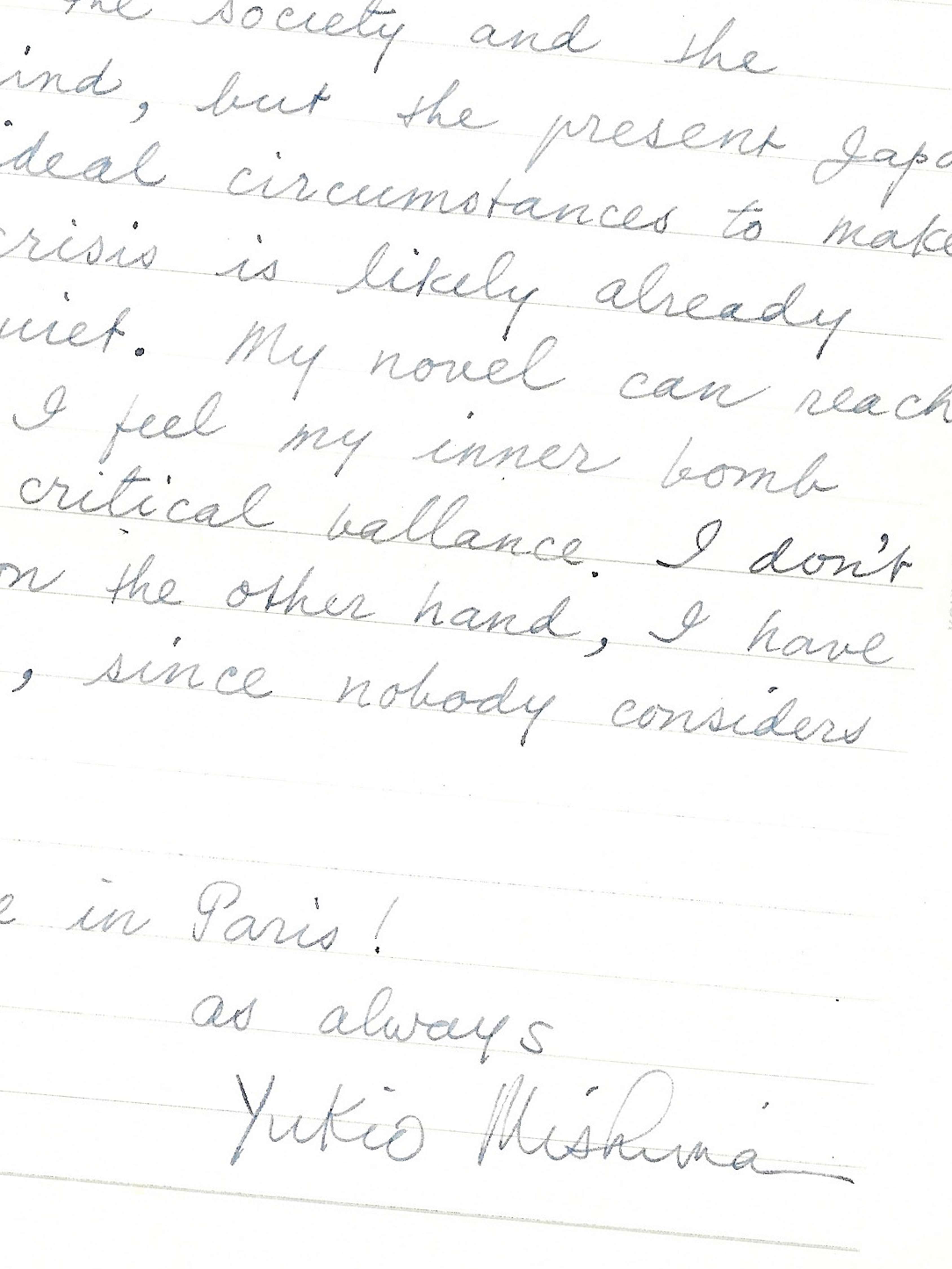 A disturbing letter from Mishima, written less than a year before his suicide by seppuku. He is delighted with the good critical reception of his novel Patriotism in France and wishes to inquire in particular about André Malraux’s opinion. He then speaks of his past and upcoming novels and develops on the explosive balance he seeks to inspire his mind. He ends with an equivocal allusion about his dark fate.