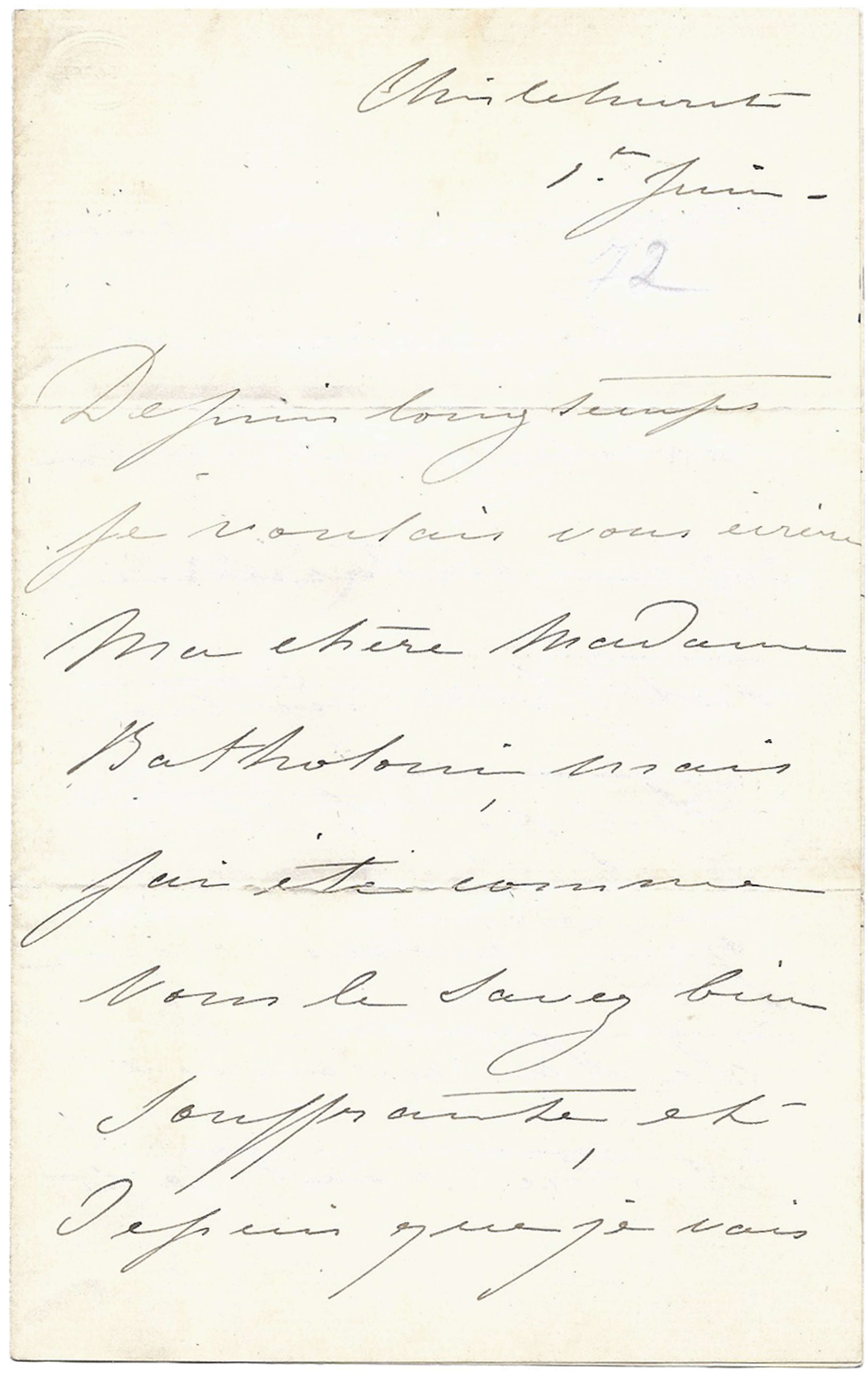 [Camden Place], Chislehurst, 1st June [1872], 4 pp. petit in-8°