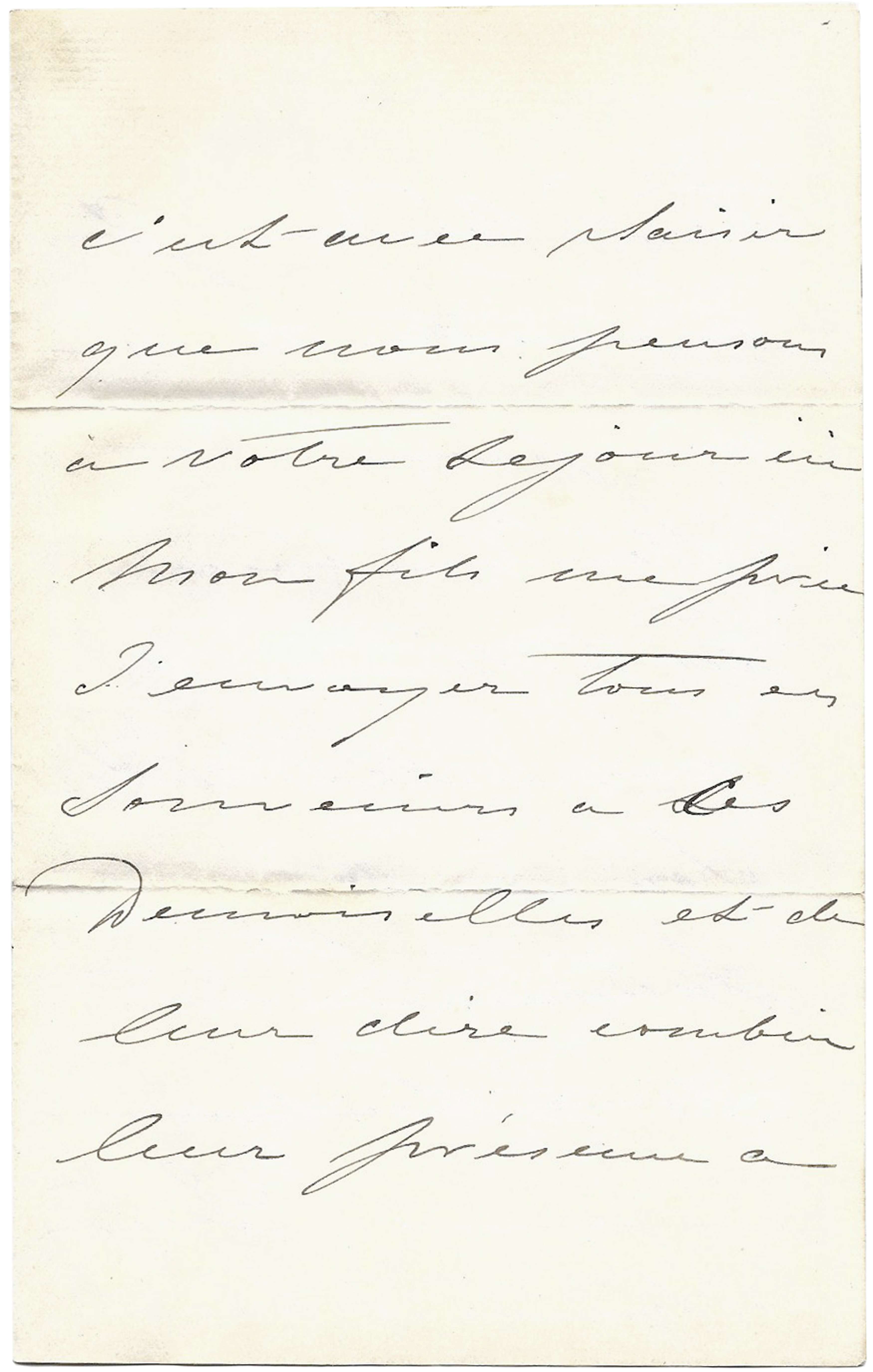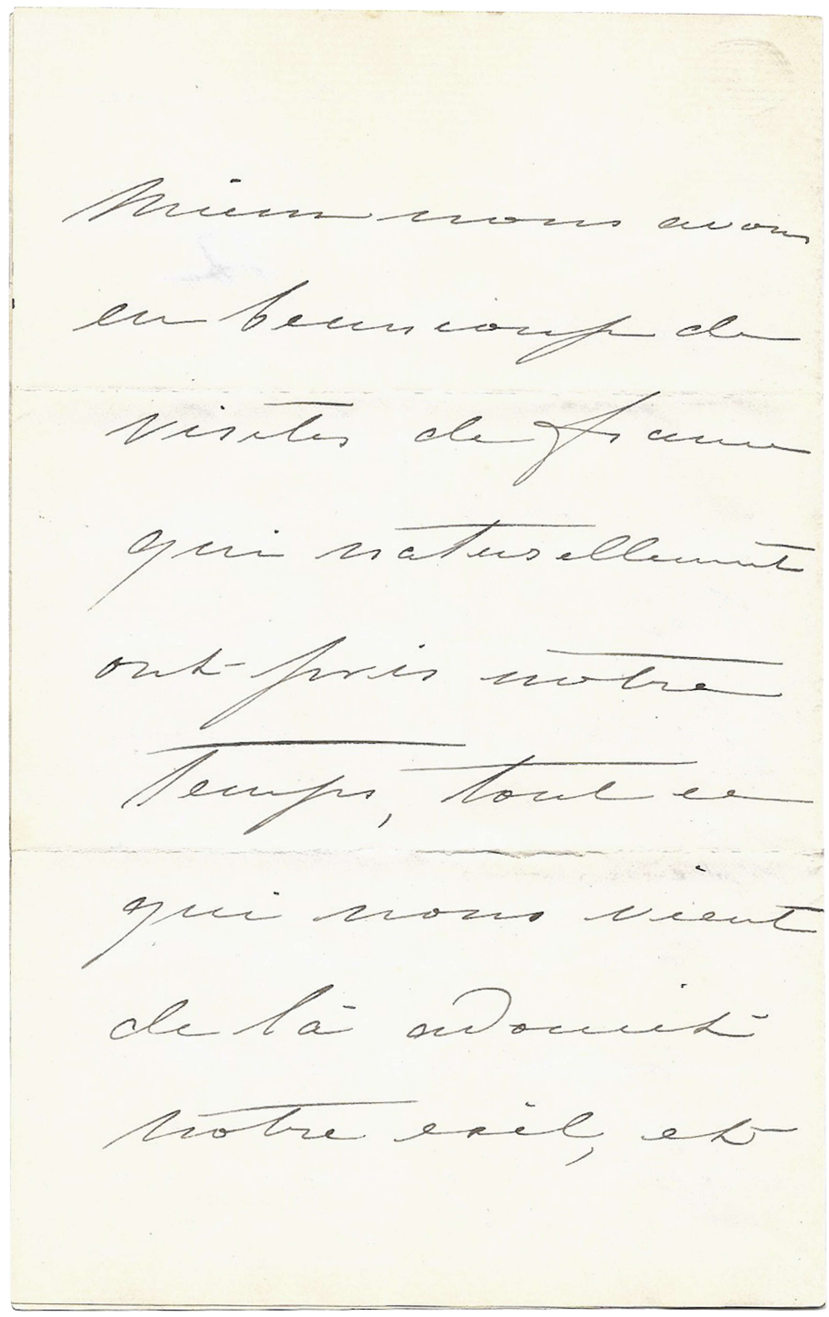 « Depuis longtemps je voulais vous écrire, ma chère Madame Bartholoni, mais j’ai été comme vous le savez bien souffrante, et depuis que je vais mieux nous avons eu beaucoup de visites de France qui naturellement ont pris notre temps. Tout ce qui nous vient de là adoucit notre exil et c’est avec plaisir que nous pensons à votre séjour ici.