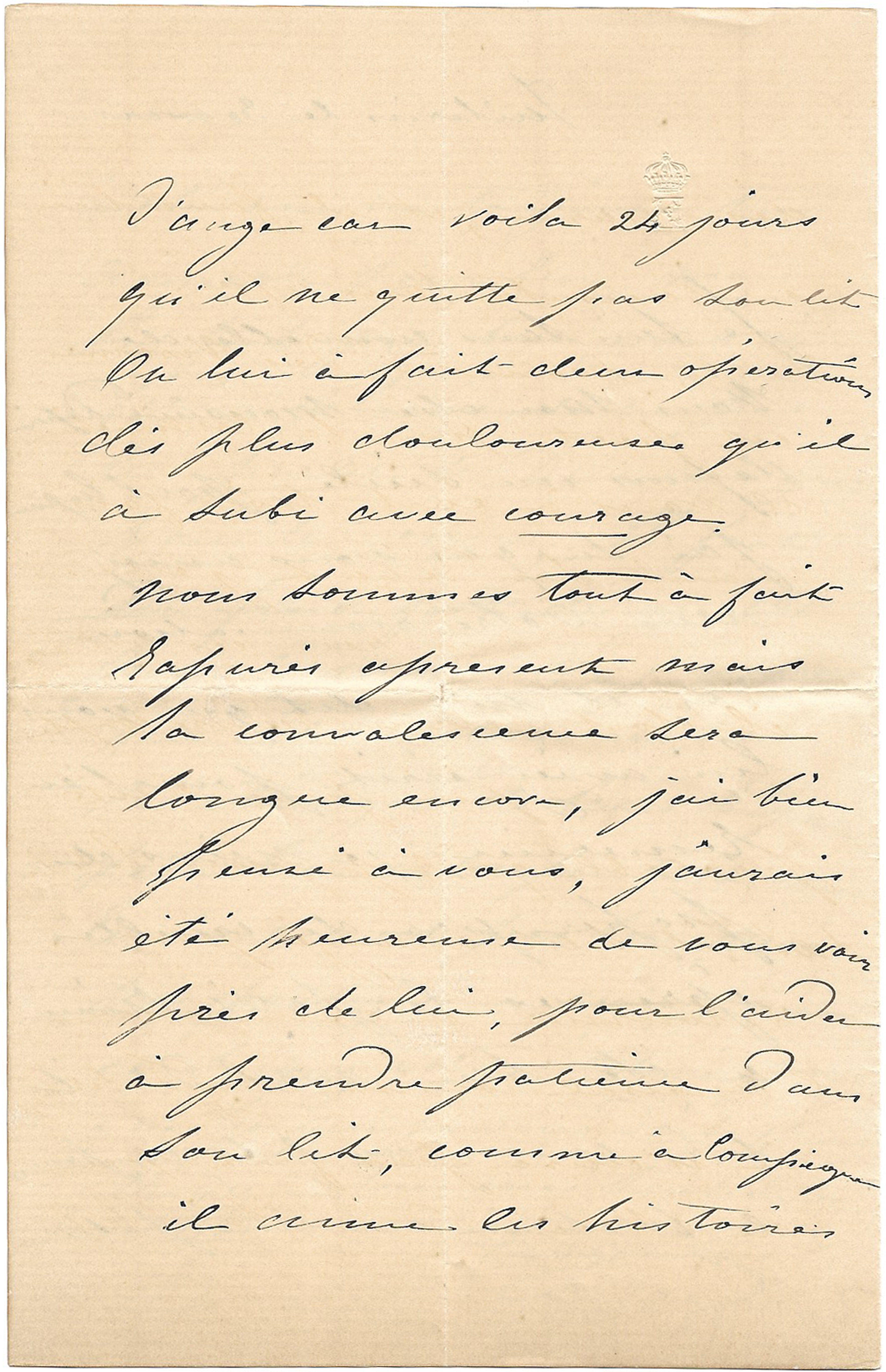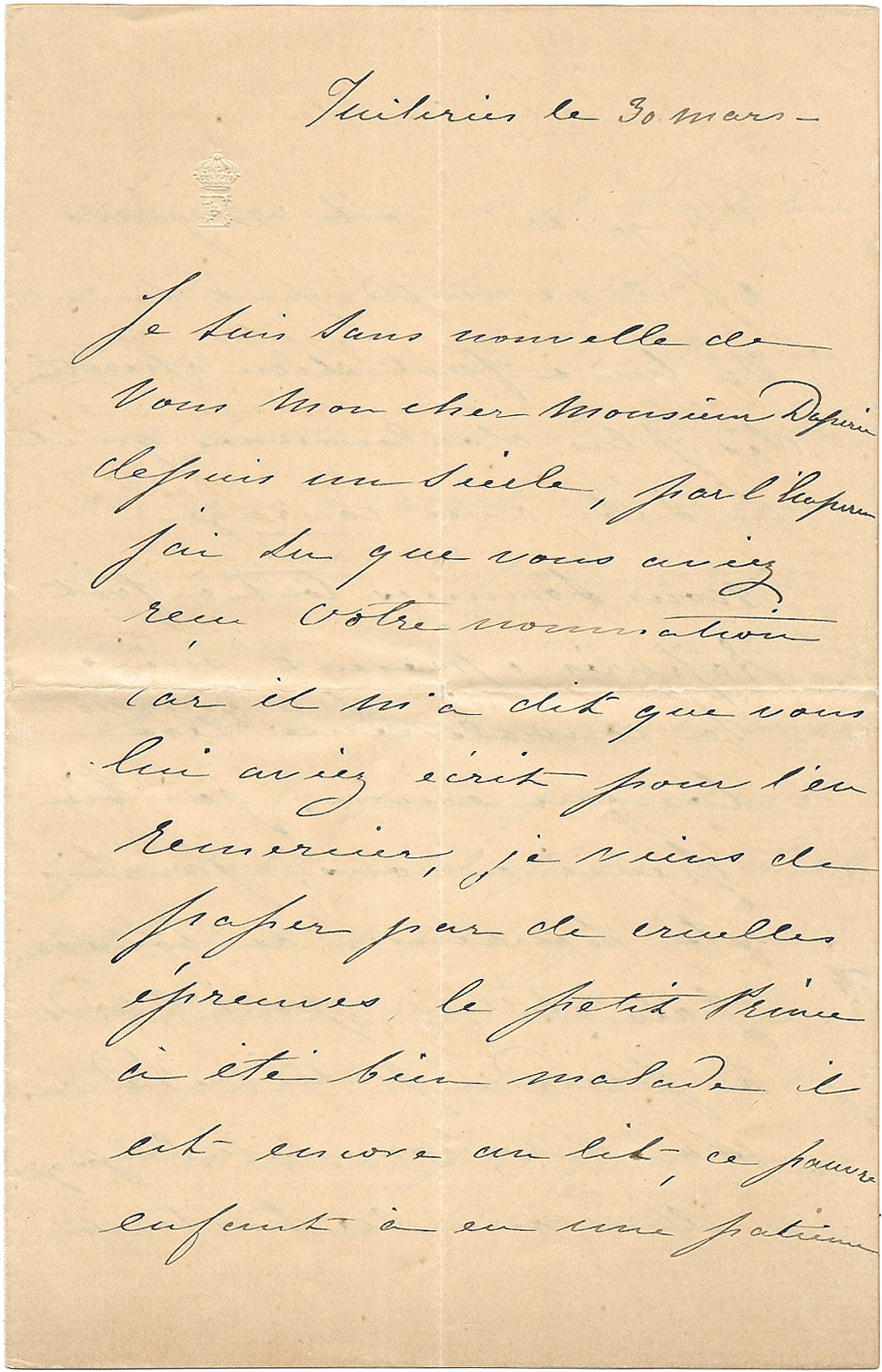 « Je suis sans nouvelles de vous mon cher Monsieur Duperré depuis un siècle, par l’Empereur j’ai su que vous aviez reçu votre nomination car il m’a dit que vous lui aviez écrit pour l’en remercier, je viens de passer par de cruelles épreuves, le petit Prince a été bien malade, il est encore au lit ; ce pauvre enfant a eu une patience d’ange car voilà 24 jours qu’il ne quitte pas son lit. On lui a fait deux opérations des plus douloureuses qu’il a subi[es] avec courage.