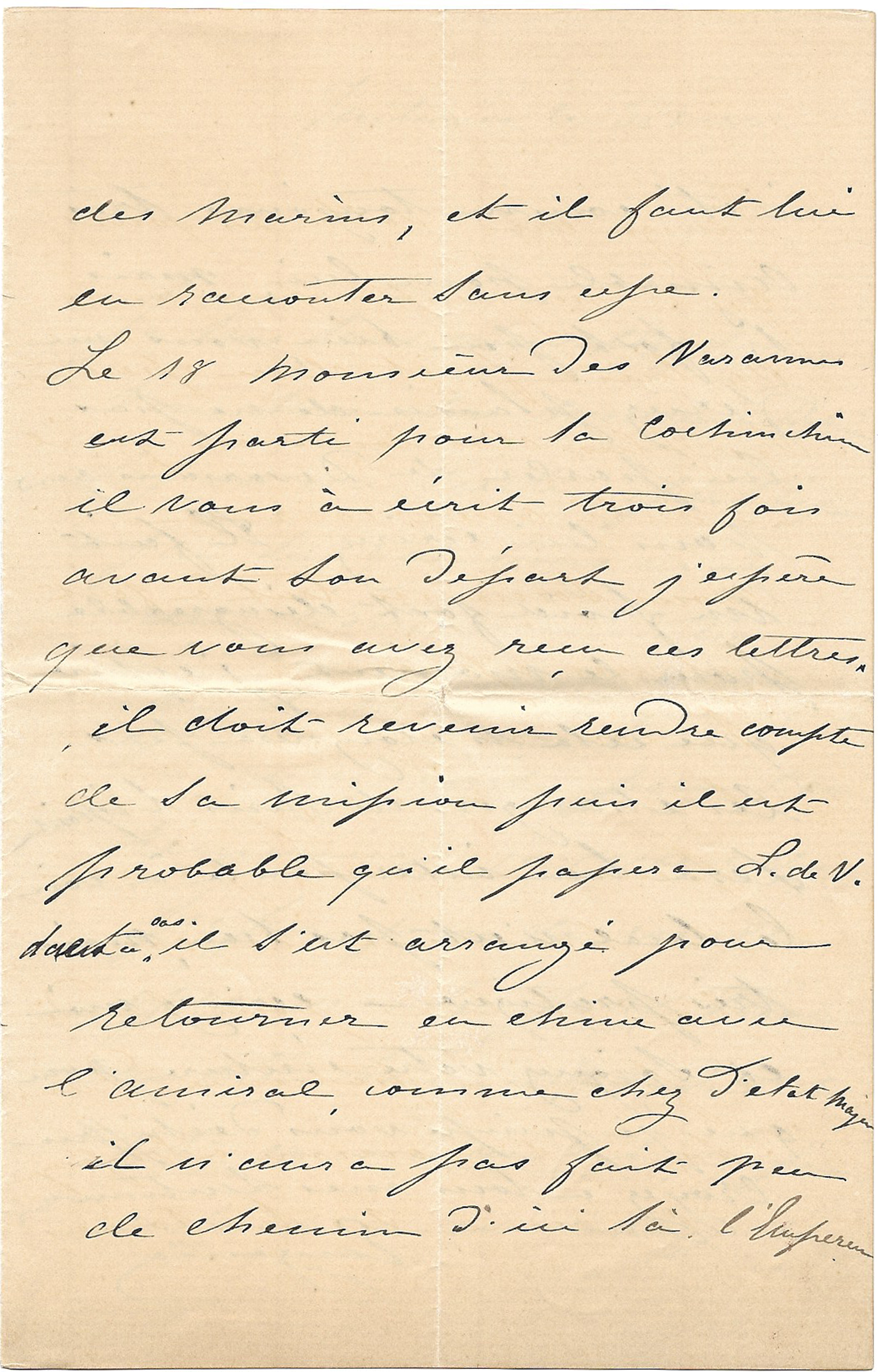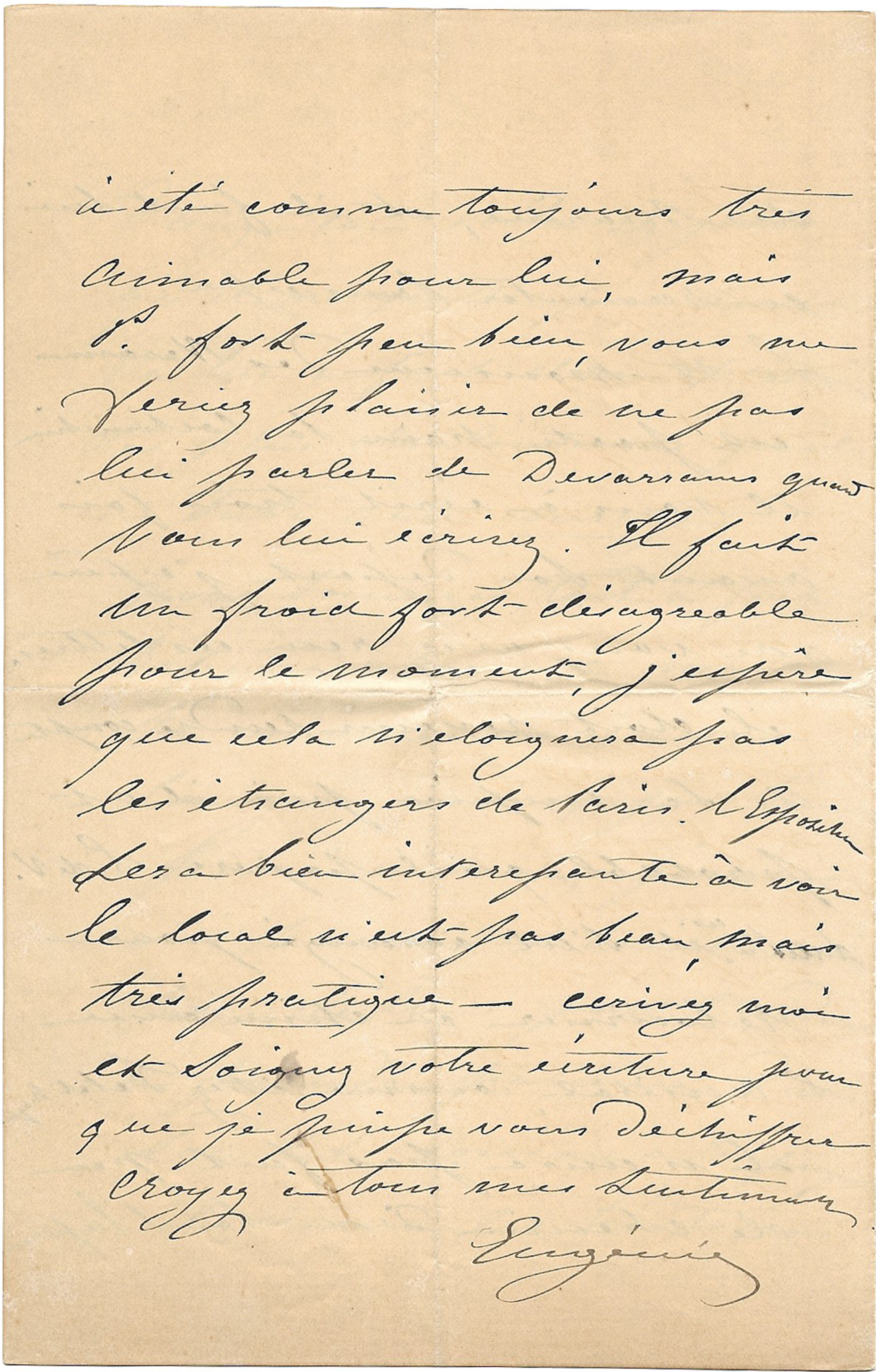 Le 18, Monsieur des Varannes est parti pout la Cochinchine [The naval officer Ambroise Levesque Des Varannes, aide-de-camp to Napoleon III, was publicly known to have harbored feelings for Empress Eugénie]. Il doit revenir rendre compte de sa mission […] L’Empereur a été comme toujours très aimable avec lui, mais P. [probably the Minister of the Navy Prosper de Chasseloup-Laubat] fort peu bien, vous me feriez plaisir de ne pas lui parler de Des Varannes quand vous lui écrirez. Il fait un froid fort désagréable pour le moment, j’espère que cela n’éloignera pas les étrangers de paris. L’exposition [Universelle of 1867] sera bien intéressante à voir ; le local n’est pas beau, mais très pratique – écrivez-moi et soignez votre écriture pour que je puisse vous déchiffrer.