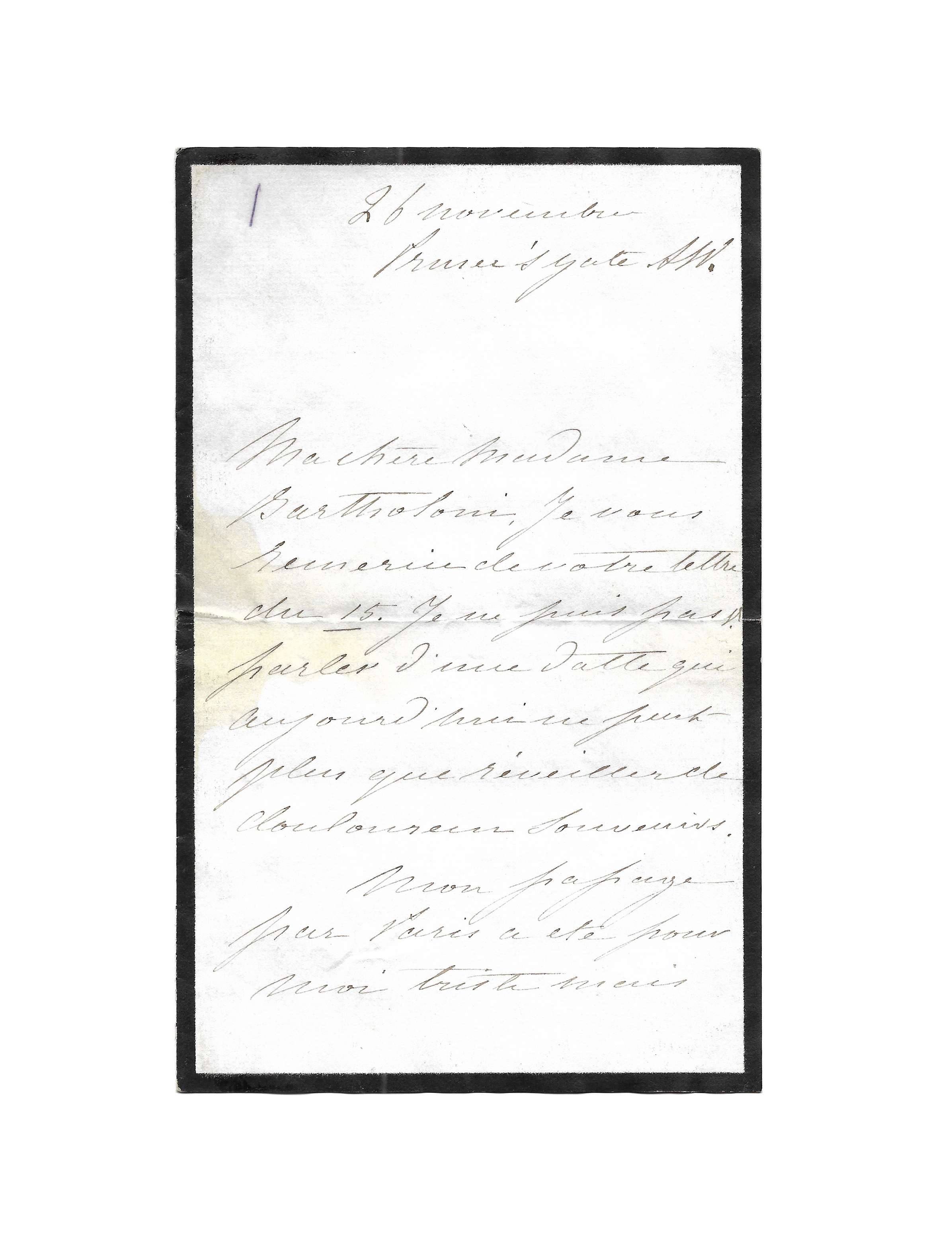 Prince’s gate SW [London], 26 November [1881], 5 p. in-8 on mourning paper