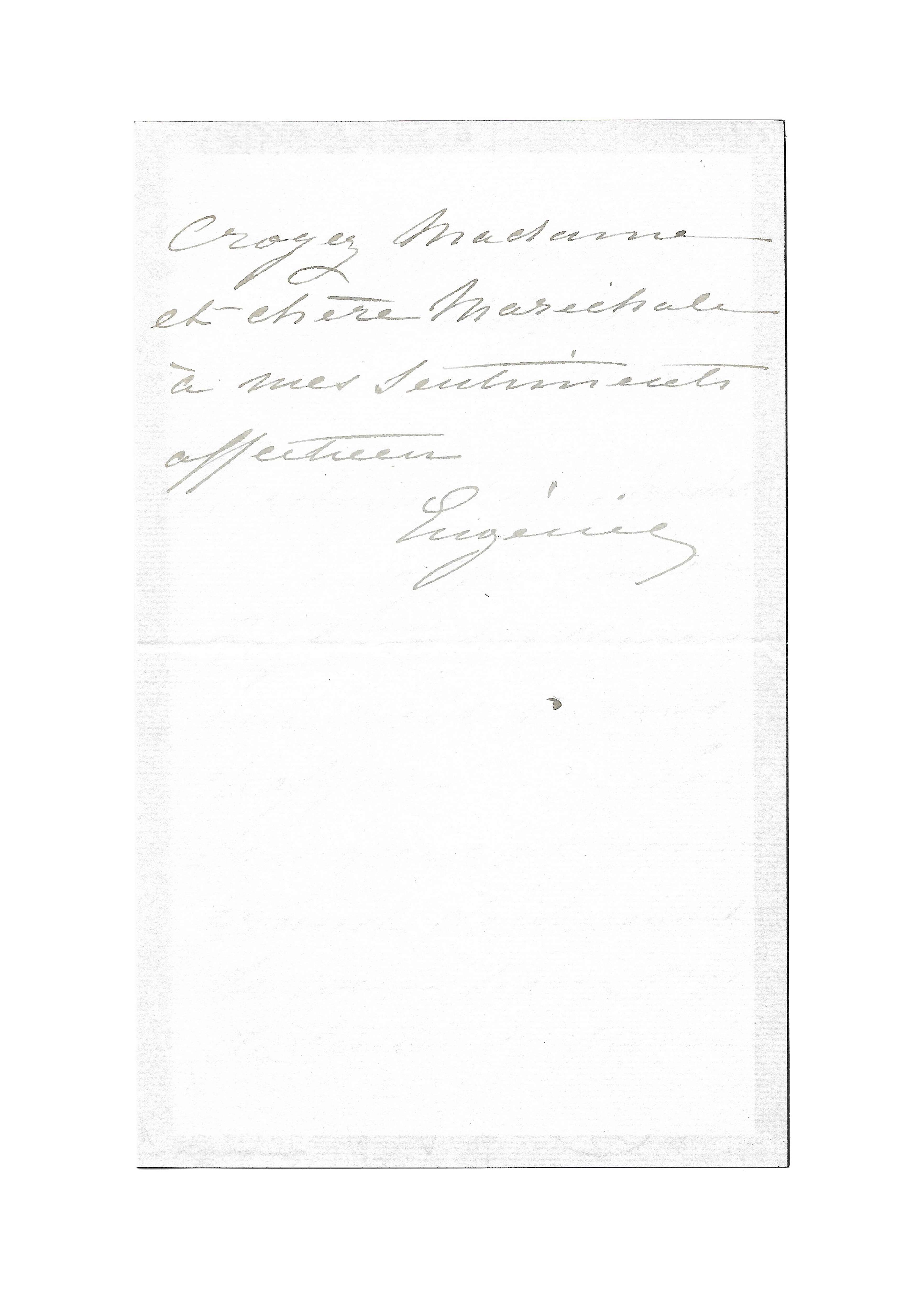 Autograph letter signed « Eugénie » to Elisabeth de la Croix de Castries (widow of Patrice de Mac-Mahon)