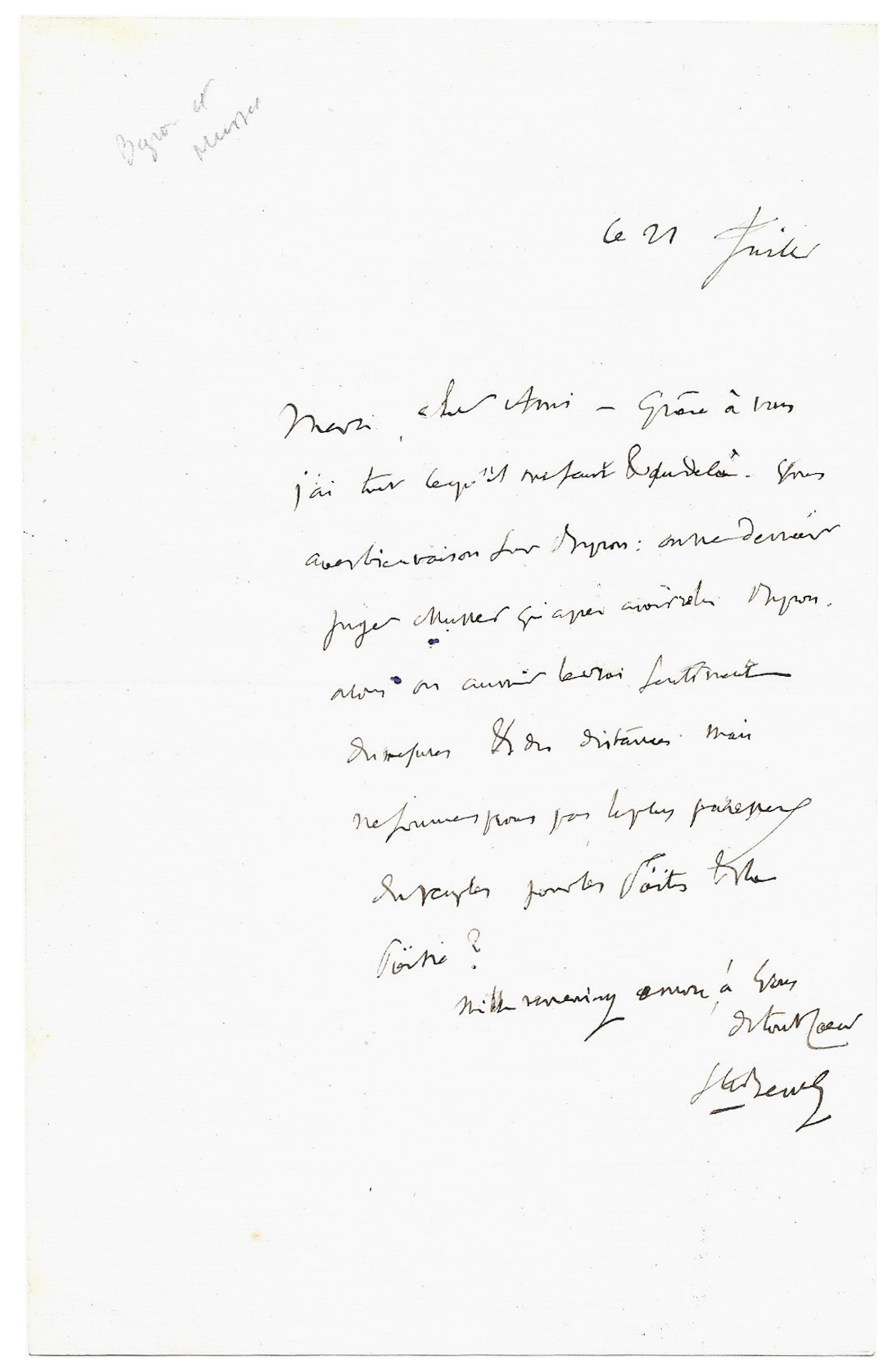 « Merci, cher Ami – Grâce à vous j’ai tout ce qu’il me faut & au delà. Vous avez bien raison sur Byron : on ne devrait juger Musset qu’après avoir relu Byron. Alors on aurait le vrai sentiment des injures et des distances, mais ne sommes-nous pas le plus paresseux des peuples pour les poètes et la poésie ? Mille remerciements encore à vous.