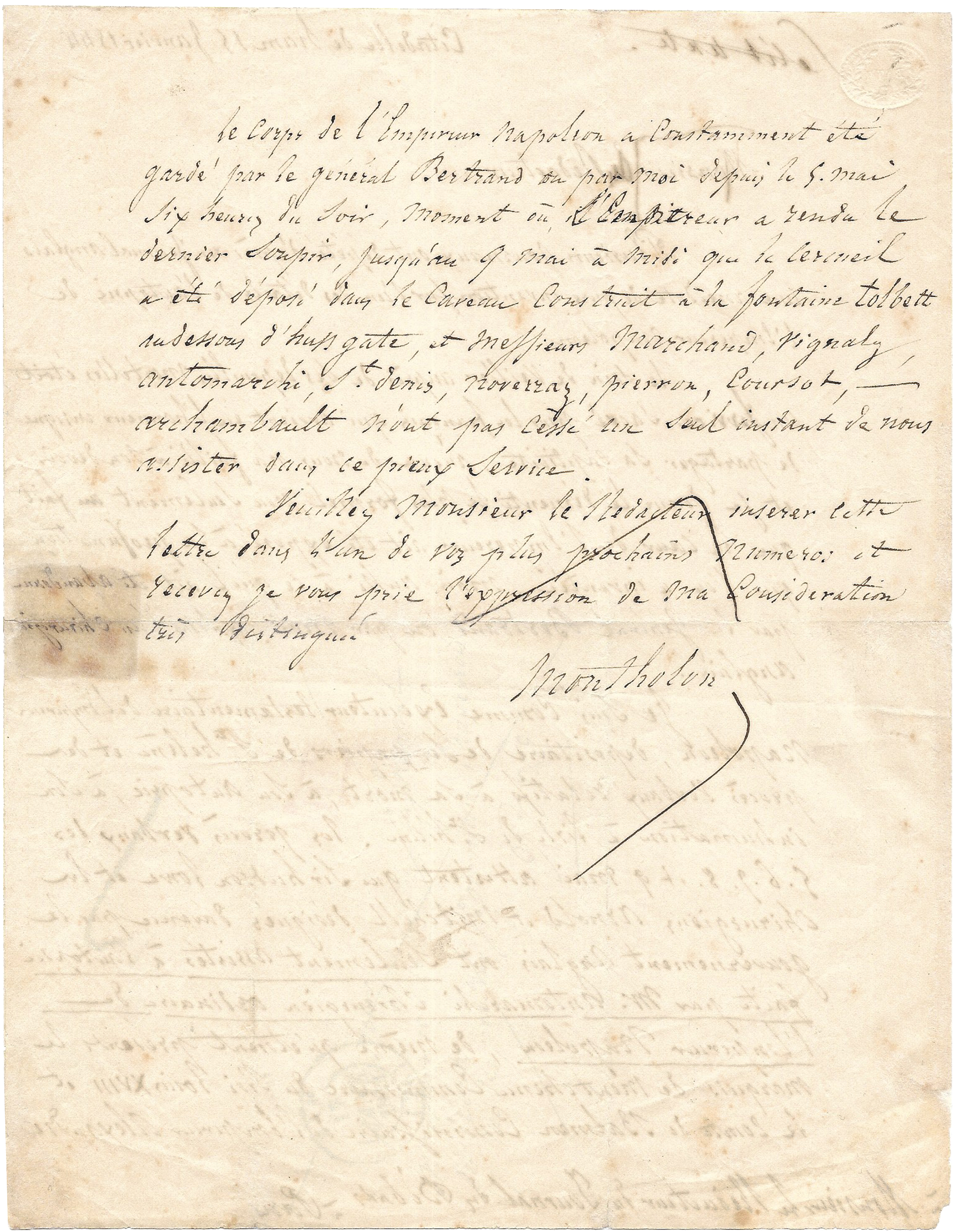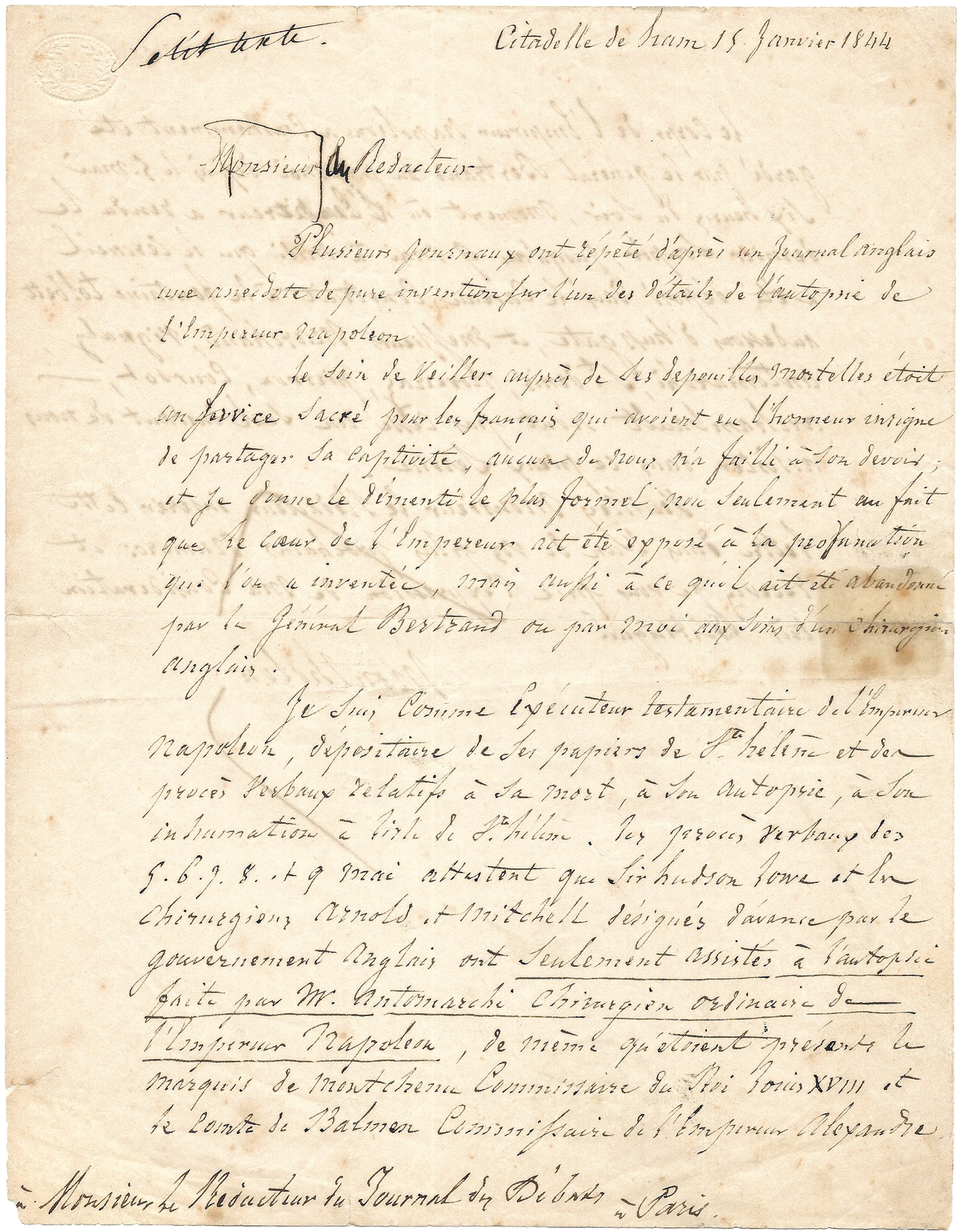 Je suis comme exécuteur testamentaire de l’Empereur Napoléon, dépositaire de ses papiers de Ste Hélène et des procès-verbaux relatifs à sa mort, à son autopsie, à son inhumation, à l’Ile de Ste Hélène. Les procès-verbaux des 5.6.7.8. et 9 mai attestent que Sir Hudson Lowe et les chirurgiens Arnold [sic] et Mitchell désignés d’avance par le gouvernement Anglais ont seulement assistés à l’autopsie faite par M. Antommarchi , chirurgien ordinaire de l’Empereur Napoléon, de même qu’étoient présents le marquis de Montchenu Commissaire du Roi Louis XVIII et le comte de Balmen [sic] Commissaire de l’Empereur Alexandre.