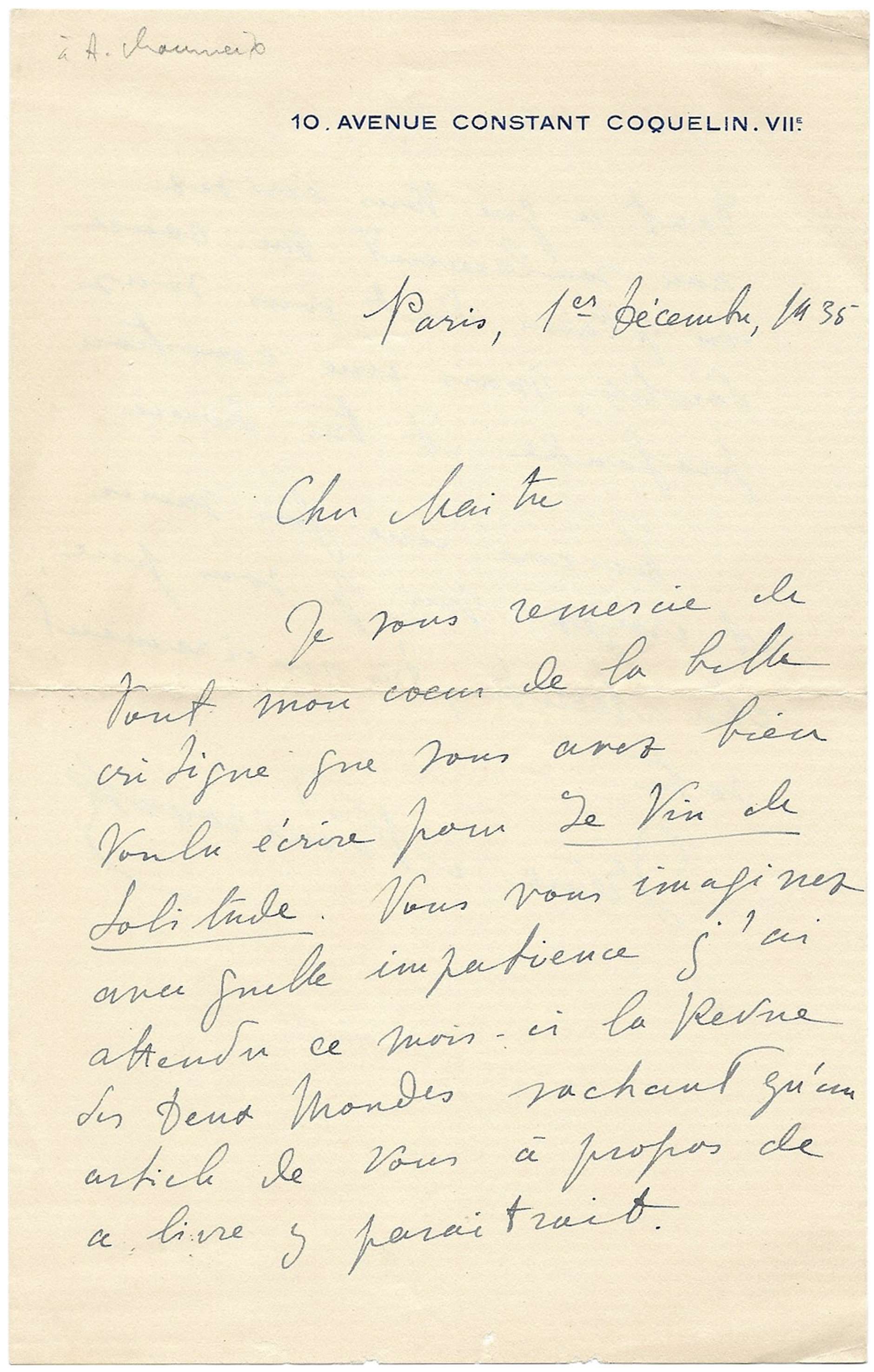 This letter was written in thanks to journalist and academician André Chaumeix for his laudatory review of the novel, at a time when he was in charge of the literary column of Revue des Deux Mondes (and would go on to assume its general directorship two years later).