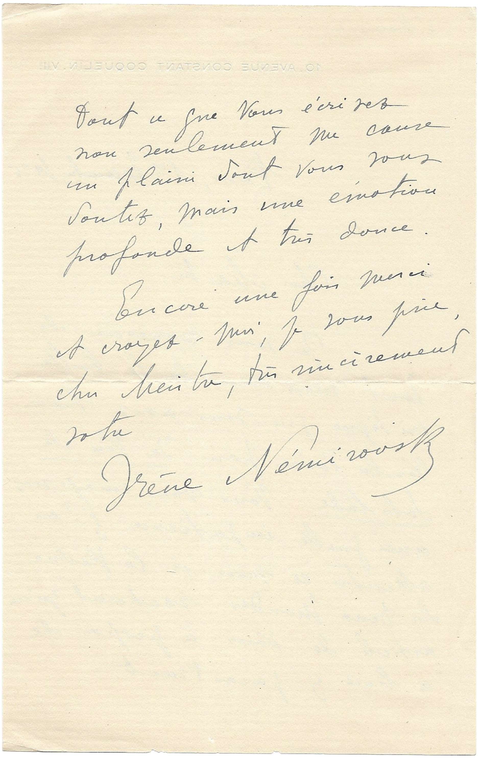 Autograph letter signed « Irène Némirovsky » [to André Chaumeix]