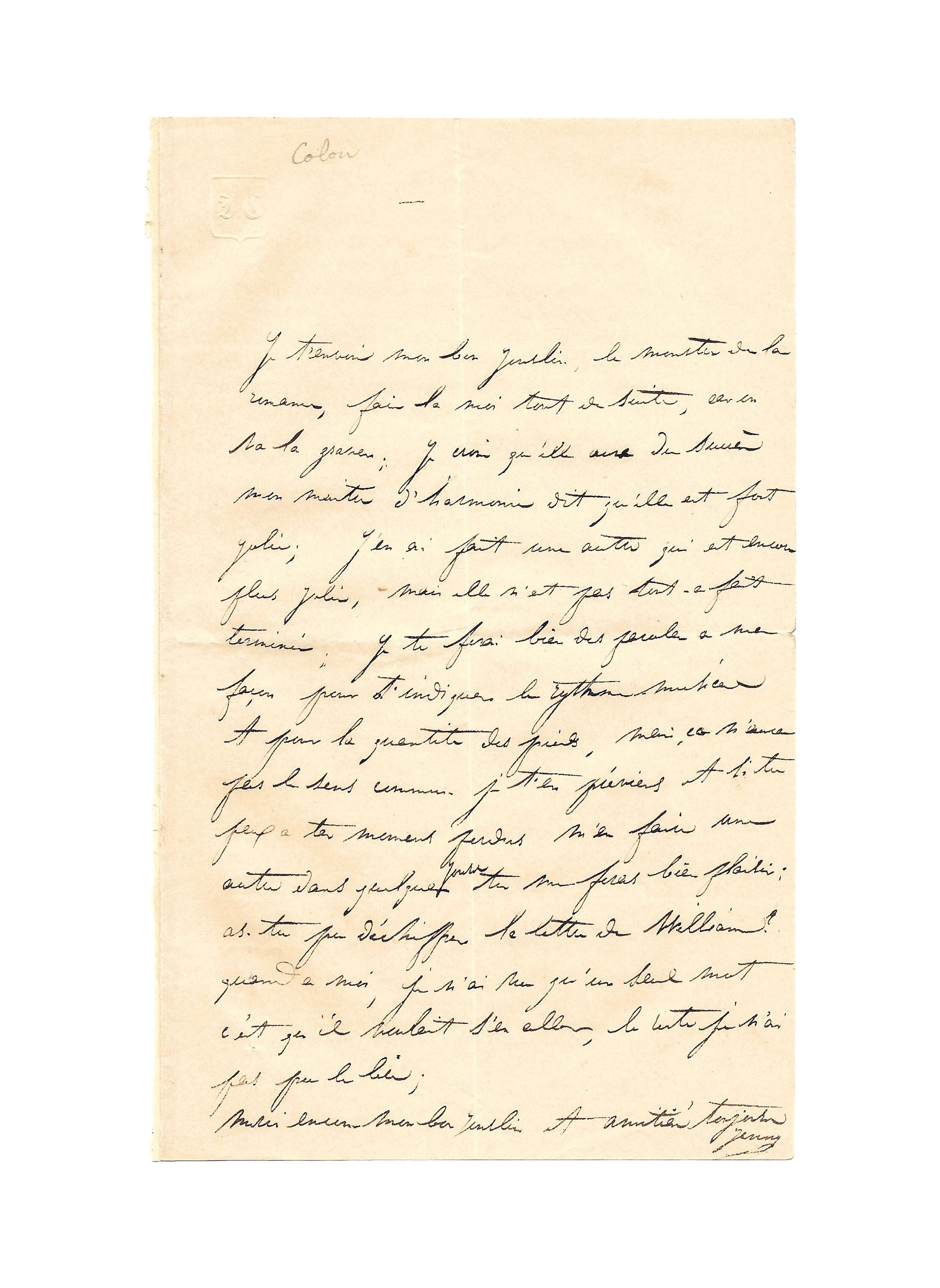 « Je t’envoie mon bon Jouslin […] la romance, fais-la-moi tout de suite, car on va la graver. Je crois qu’elle aura du succès. Mon maitre d’harmonie dit qu’elle est fort jolie ; j’en ai fait une autre qui est encore plus jolie, mais elle n’est pas tout à fait terminée. Je te ferai bien des paroles à ma façon pour t’indiquer le rythme musical. A part la quantité des pieds, rien, ça n’aura pas le sens commun. Je t’en préviens et si tu peux à tes moments perdus m’en faire une autre dans quelques jours tu me ferais bien plaisir ; as-tu pu déchiffrer la lettre de William [Hope] ? Quant à moi, je n’ai rien qu’un seul mot c’est qu’il voulait s’en aller, le reste je n’ai pas pu le lire. Merci encore mon bon Jouslin Amitié toujours. Jenny »