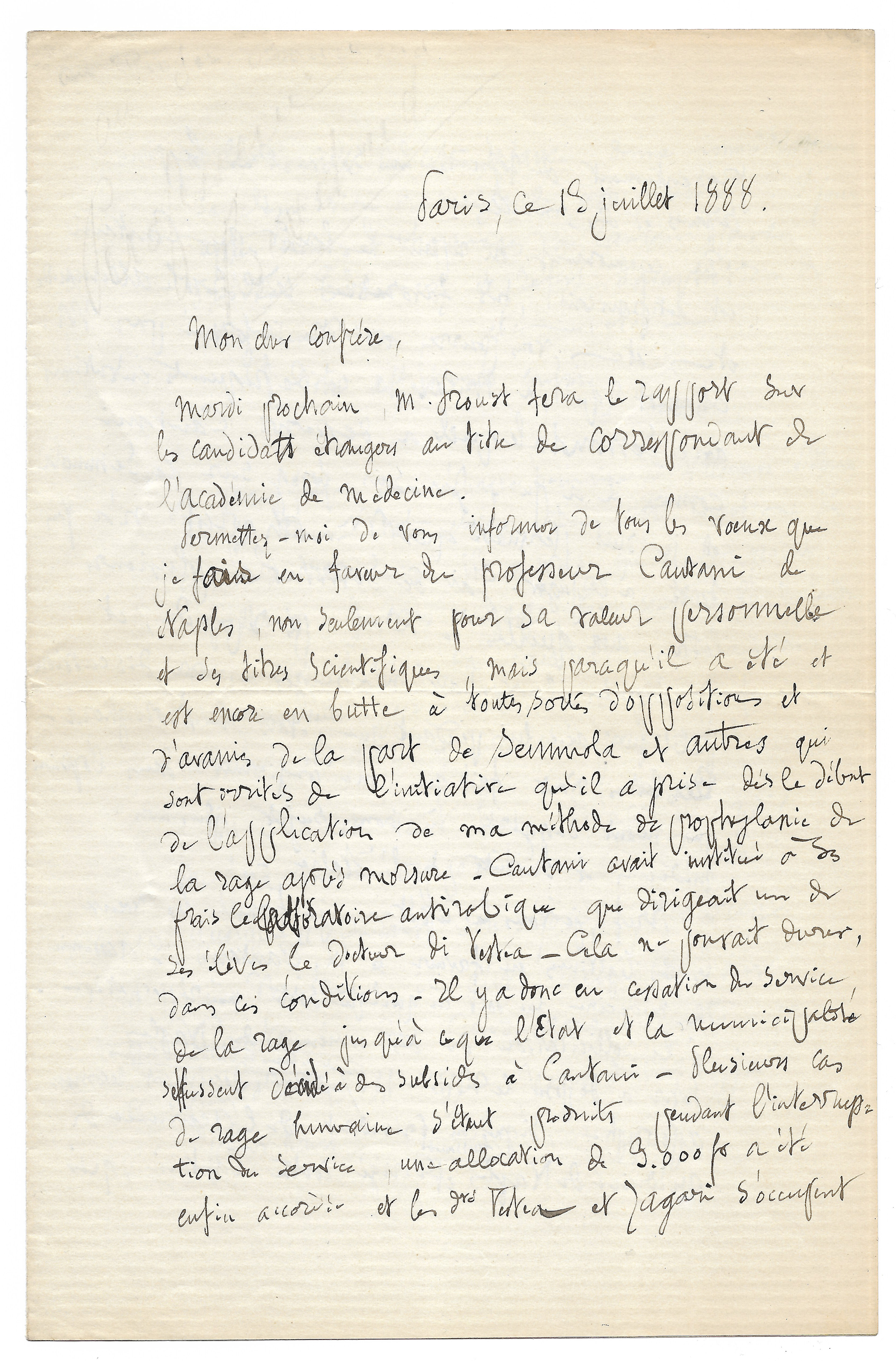 [2] Italian physician and politician Arnaldo Cantani (1837-1893) undertook research that led to significant advances in the pathogenesis of infectious diseases. As evidenced by this letter, Cantani, a fervent supporter of Pasteur’s work, created a microbiology laboratory in Naples, recognized as the first Italian institute of therapy against rabies.