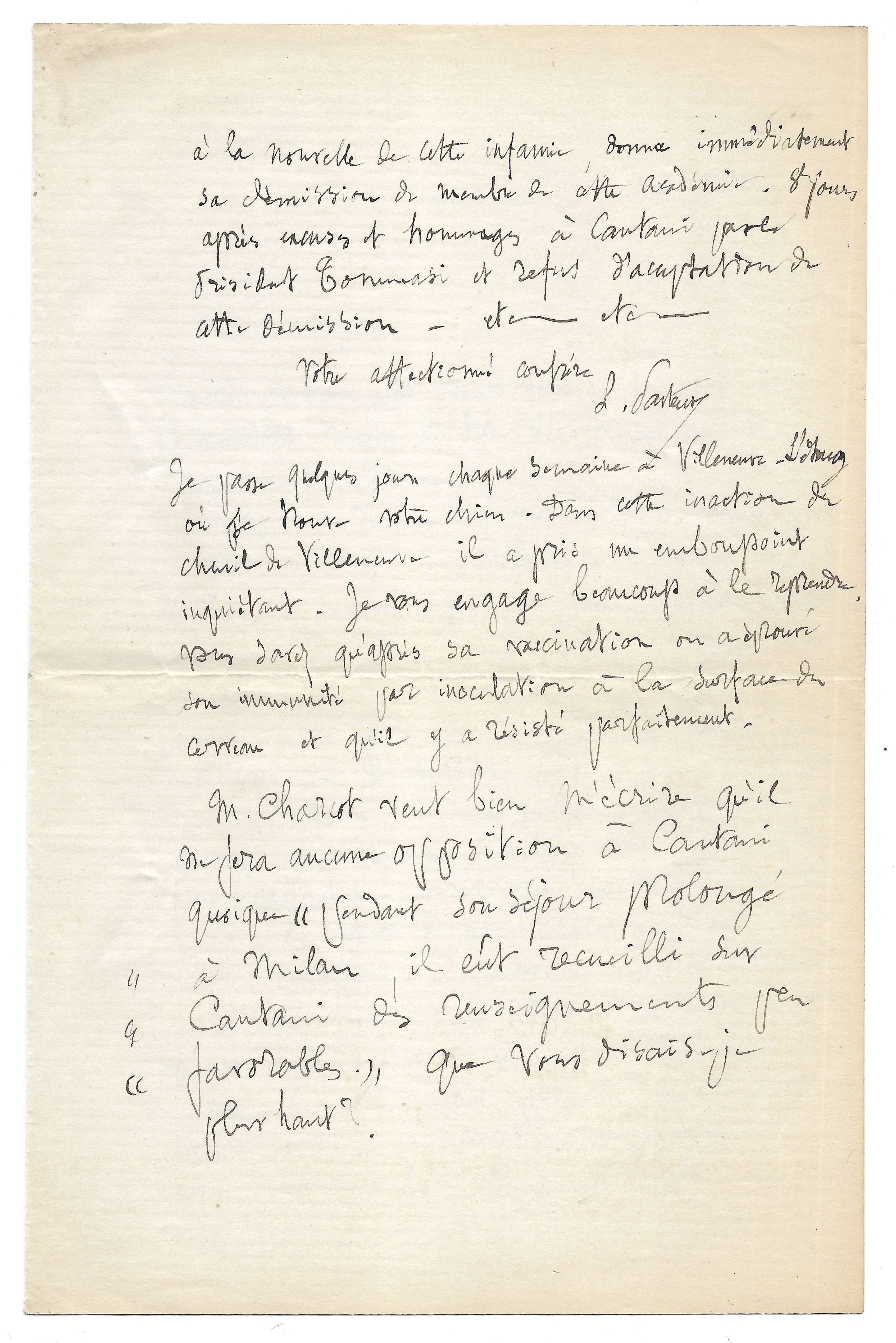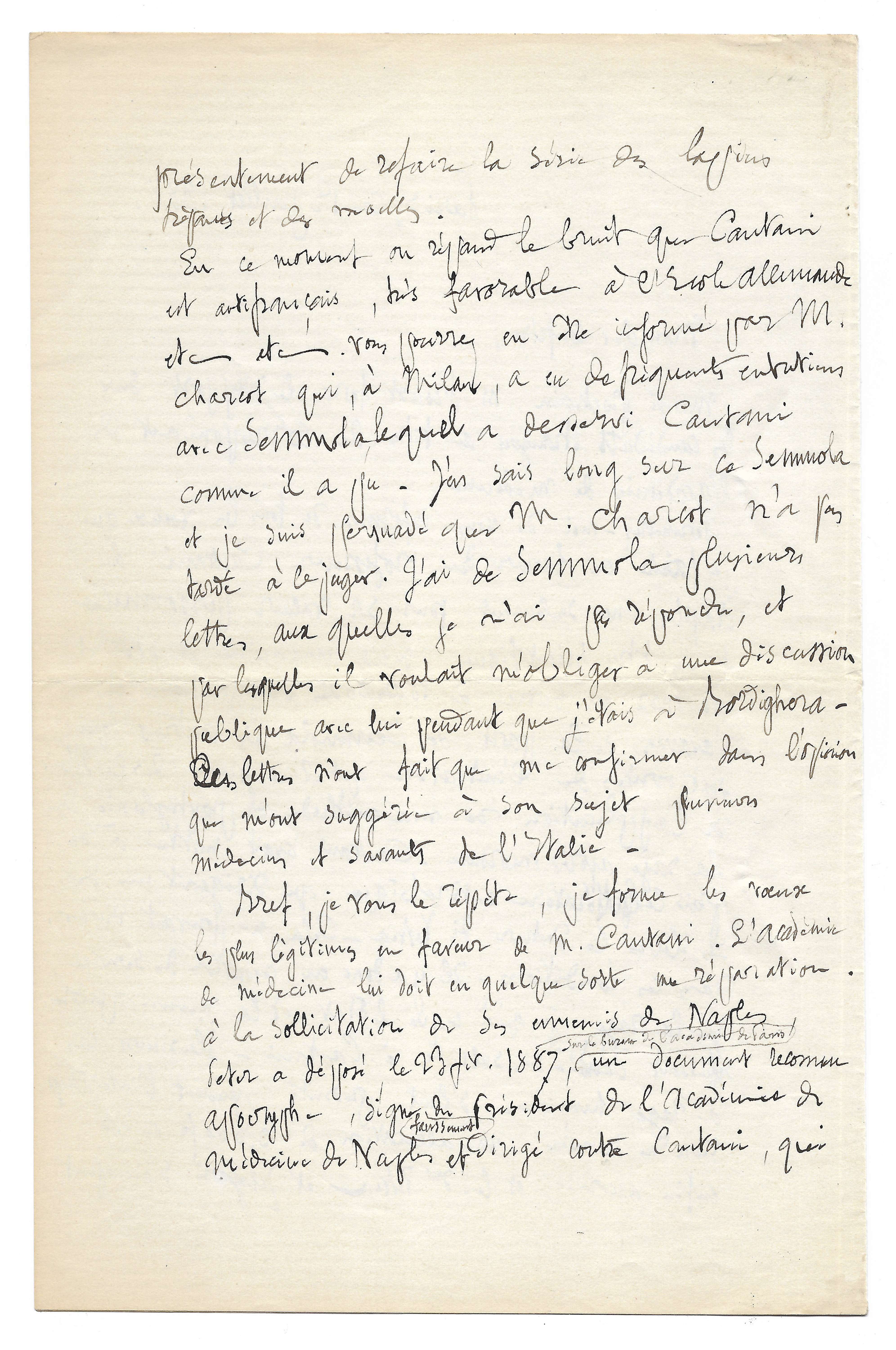 En ce moment on répand le bruit que Cantani et anti français, très favorable à l’école allemande etc etc. Vous pourrez en être informé par M. [Jean-Martin] Charcot qui, à Milan, a eu de piquants entretiens avec Semmola lequel a desservi Cantani comme il a pu. J’en sais long sur ce Semmola et je suis persuadé que M. Charcot n’a pas tardé à le juger. J’ai de Semmola plusieurs lettres, auxquelles je n’ai pas répondu, et par lesquelles il voulait m’obliger à une discussion publique avec lui pendant que j’étais à Bordighera. Ces lettres n’ont fait que me confirmer dans l’opinion que m’ont suggéré à son sujet plusieurs médecins et savants de l’Italie.