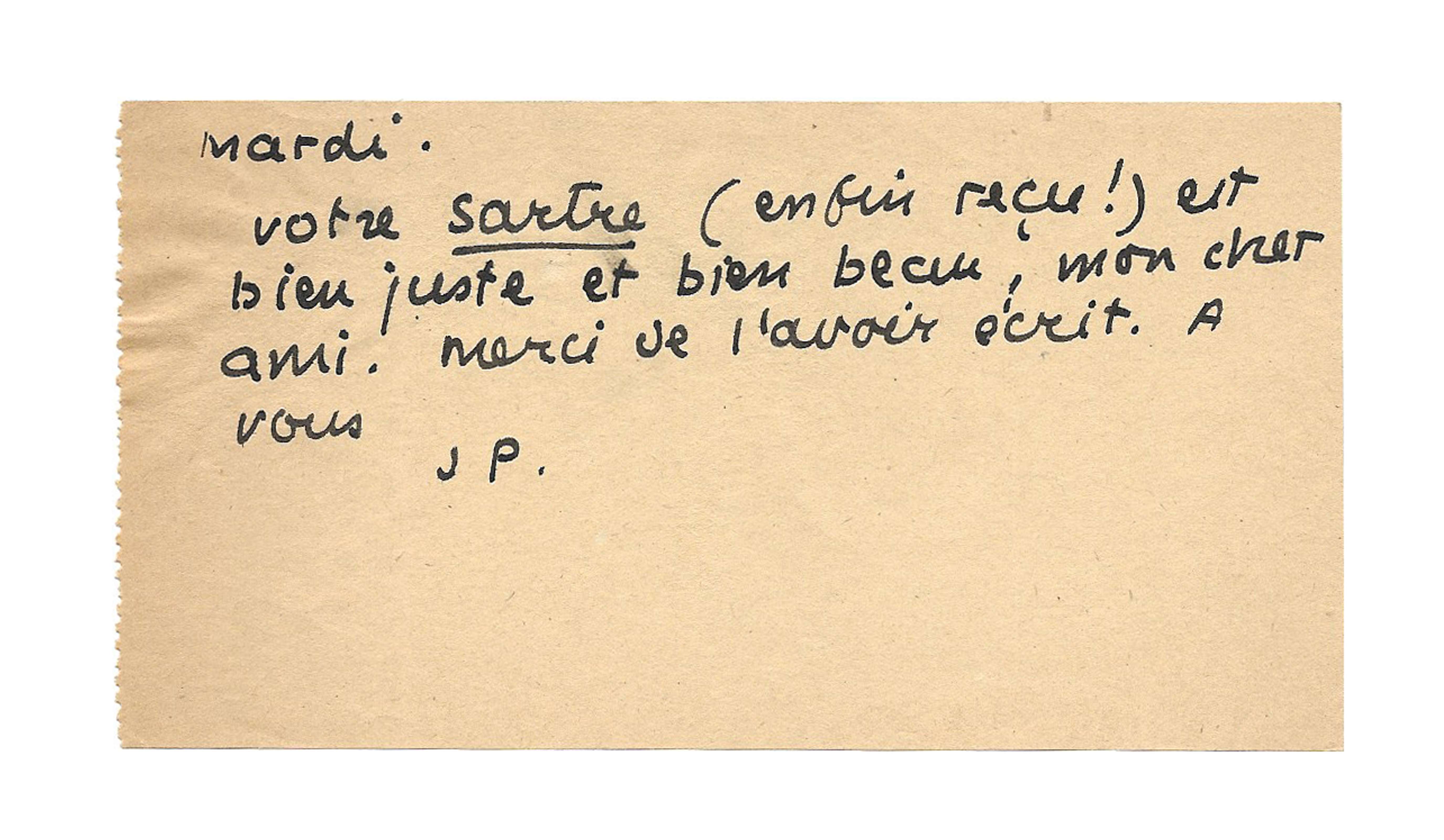 « Votre Sartre (enfin reçu !) est bien juste et bien beau, mon cher ami ! Merci de l’avoir écrit. A vous,