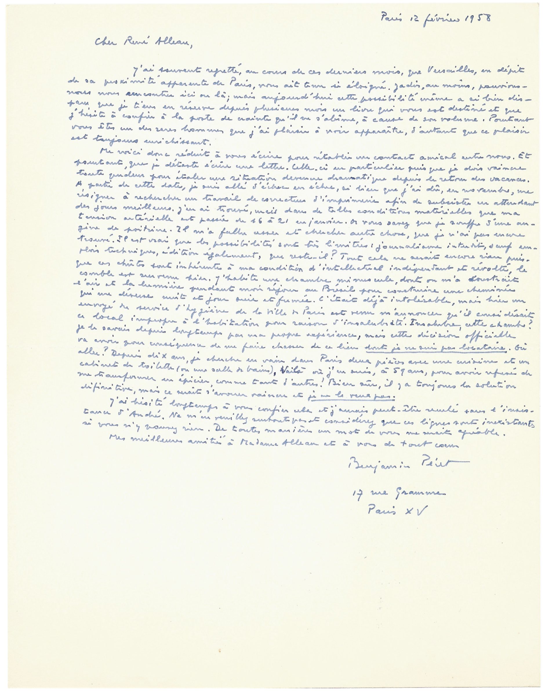 Me voici donc réduit à vous écrire pour rétablir un contact amical entre nous. Et pourtant, que je déteste écrire une lettre. Celle-ci en particulier puisque je dois vaincre toute pudeur pour étaler une situation devenue dramatique depuis le retour des vacances. A partir de cette date, je suis allé d’échec en échec, si bien que j’ai dû, en novembre, me résigner à rechercher un travail de correcteur d’imprimerie afin de subsister en attendant des jours meilleurs. J’en ai trouvé, mais dans de telles conditions matérielles que ma tension artérielle est passée de 16 a 21 en janvier. Or vous savez que je souffre d’une angine de poitrine. Il m’a fallu cesser et chercher autre chose que je n’ai pas encore trouvé. Il est vrai que les possibilités sont très limitées : journalisme interdit. Sauf emplois techniques, édition également, que reste-t-il ? Tout cela ne serait encore rien puisque ces chutes sont inhérentes à ma condition d’intellectuel indépendant et révolté, le comble est survenu hier. J’habite une chambre minuscule, dont on m’a soustrait l’air et la lumière pendant mon séjour au Brésil pour construire une cheminée qui me déverse nuit et jour suie et fumée. C’était déjà intolérable, mais hier un envoyé du service d’hygiène de la ville de Paris est venu m’annoncer qu’il considérait ce local impropre à l’habitation pour raison d’insalubrité. Insalubre, cette chambre ? Je le savais depuis longtemps par ma propre expérience, mais cette décision officielle va avoir pour conséquence de me faire chasser de ce lieu dont je ne suis que locataire. Où aller ? Depuis dix ans, je cherche en vain dans Paris deux pièces avec une cuisine et un cabinet de toilette (ou une salle de bain), voilà où j’en suis, à 59 ans, pour avoir refusé de me transformer en épicier, comme tant d’autres ! Bien sûr, il y a toujours la solution définitive, mais ce serait s’avouer vaincu, et je ne le veux pas.