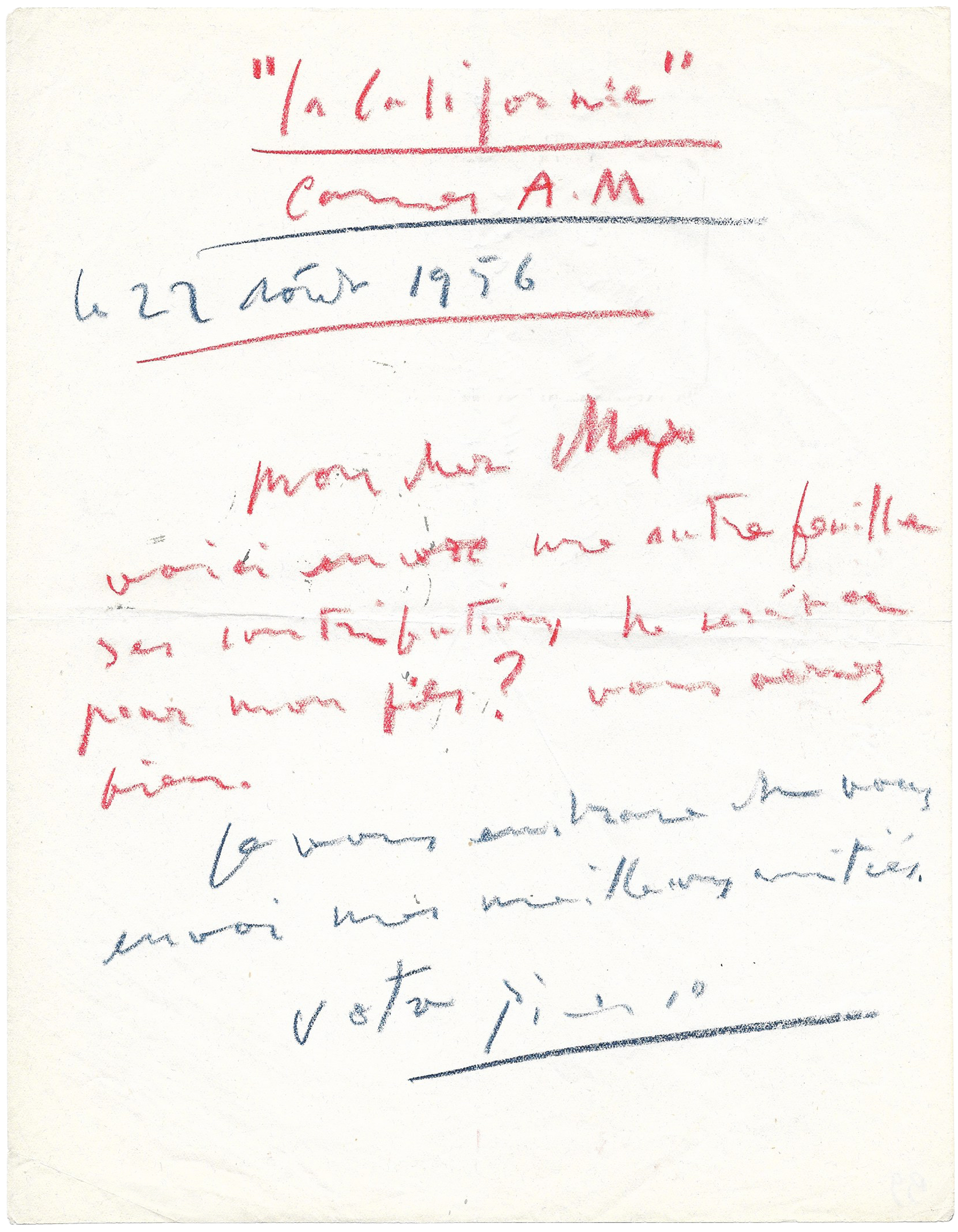 Settled at La Californie, on the heights above Cannes, Picasso benefited from the assistance of his secretary Jaume Sabartés in drafting the bulk of his correspondence. Max Pellequer, a close friend of the painter, was, however, among the rare privileged recipients of letters entirely written by Picasso himself. With oil pastels in hand, the artist played with his flowing handwriting, alternating colors like graphic elements that respond to and harmonize elegantly within the space of the sheet—when the prosaic task of a short epistle is elevated to the level of a letter-work of art.