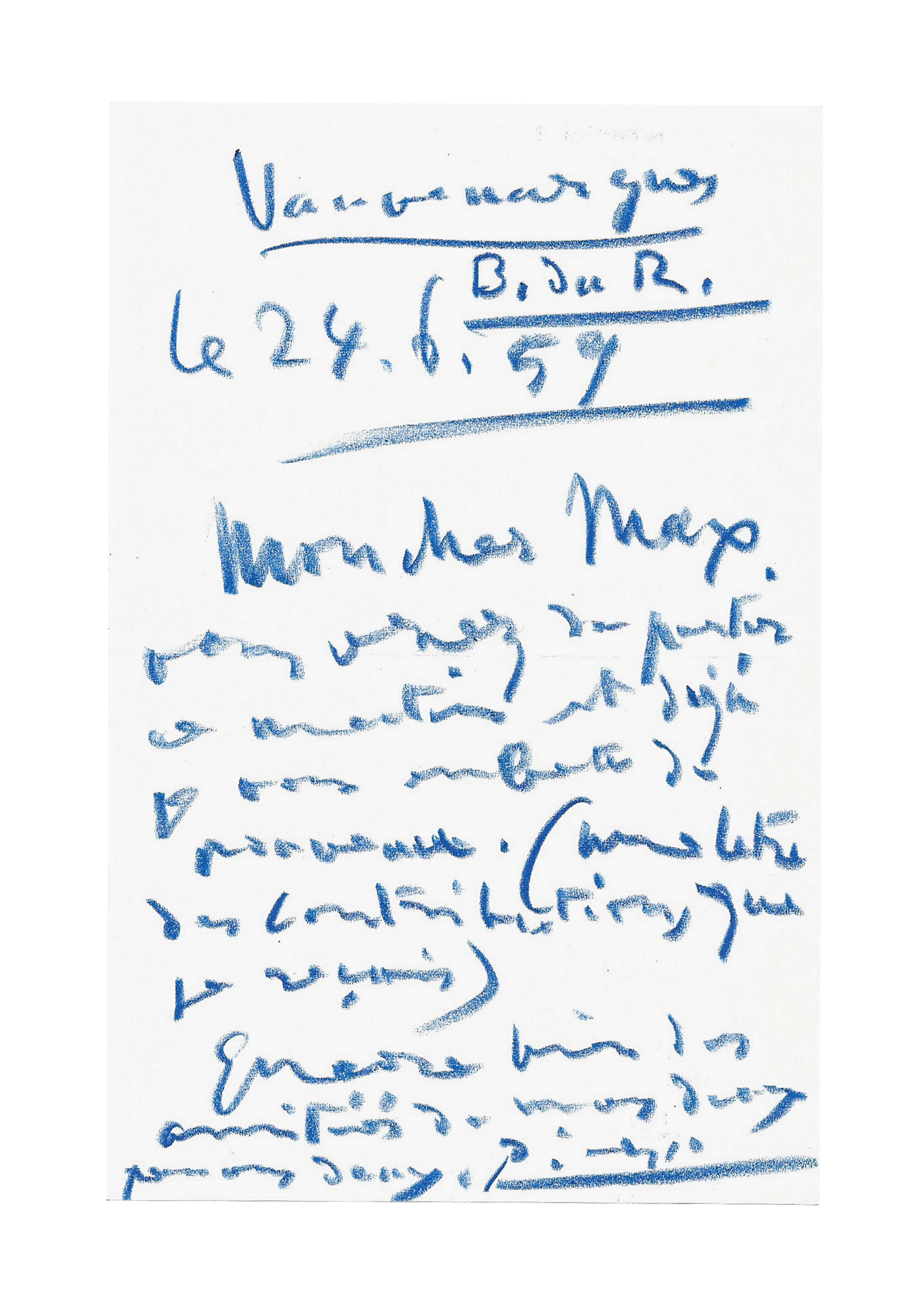Vous venez de partir ce matin et déjà je vous embête de nouveau (voir ma lettre des contributions que je reçois). Encore bien des amitiés de nous deux [allusion à sa compagne Jacqueline Roque qu’il épouse en 1961] pour vous deux. Picasso »