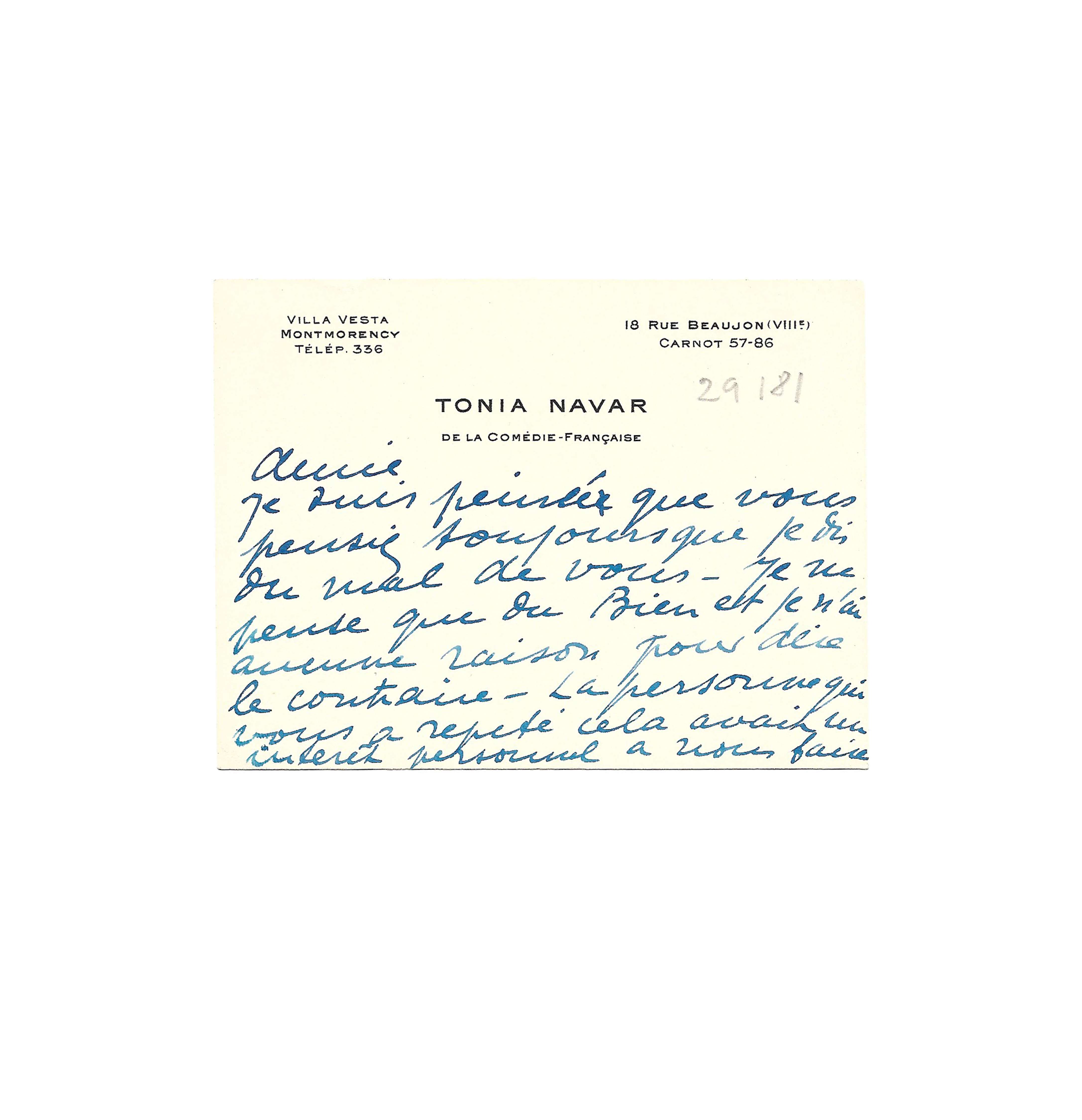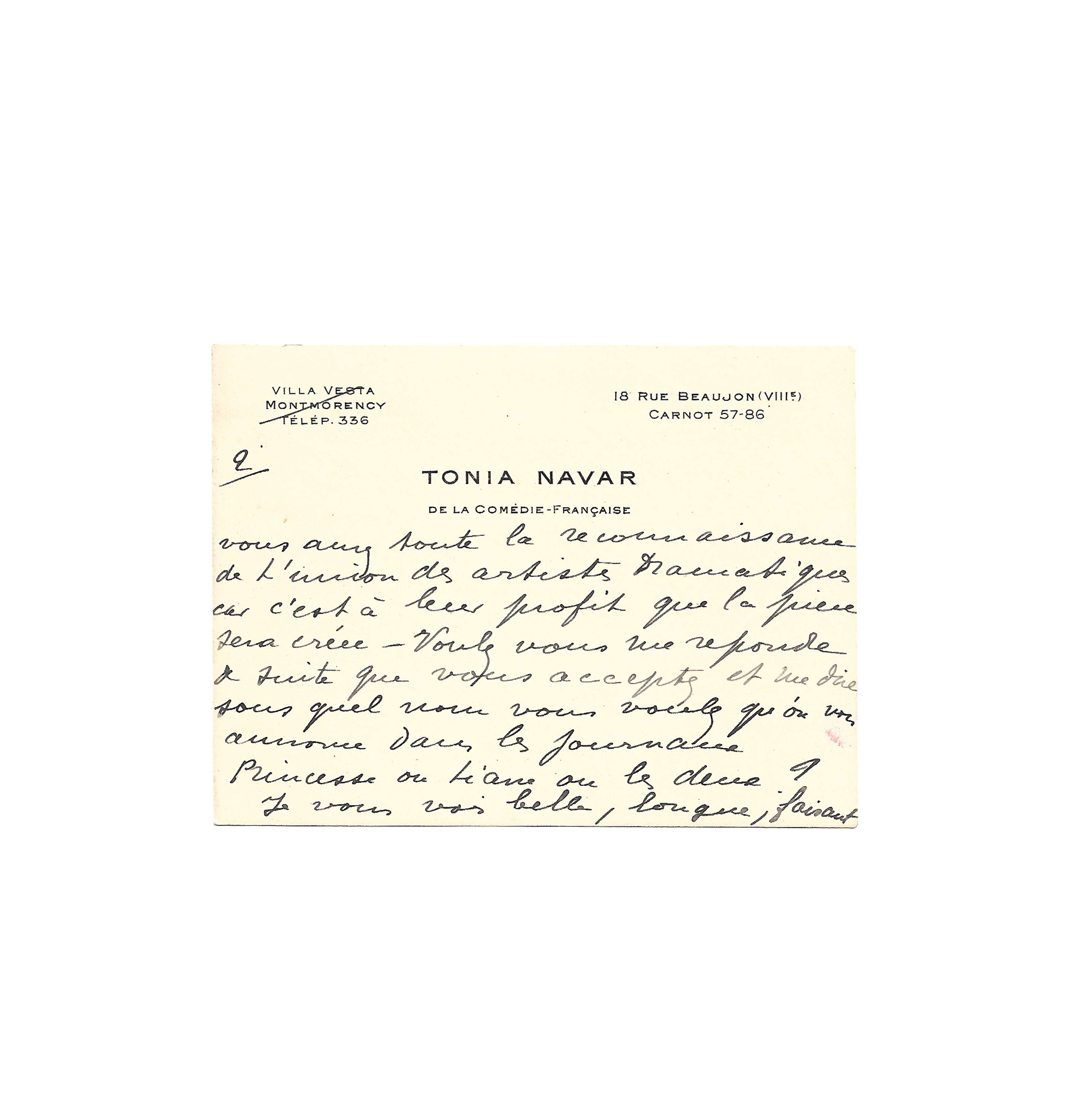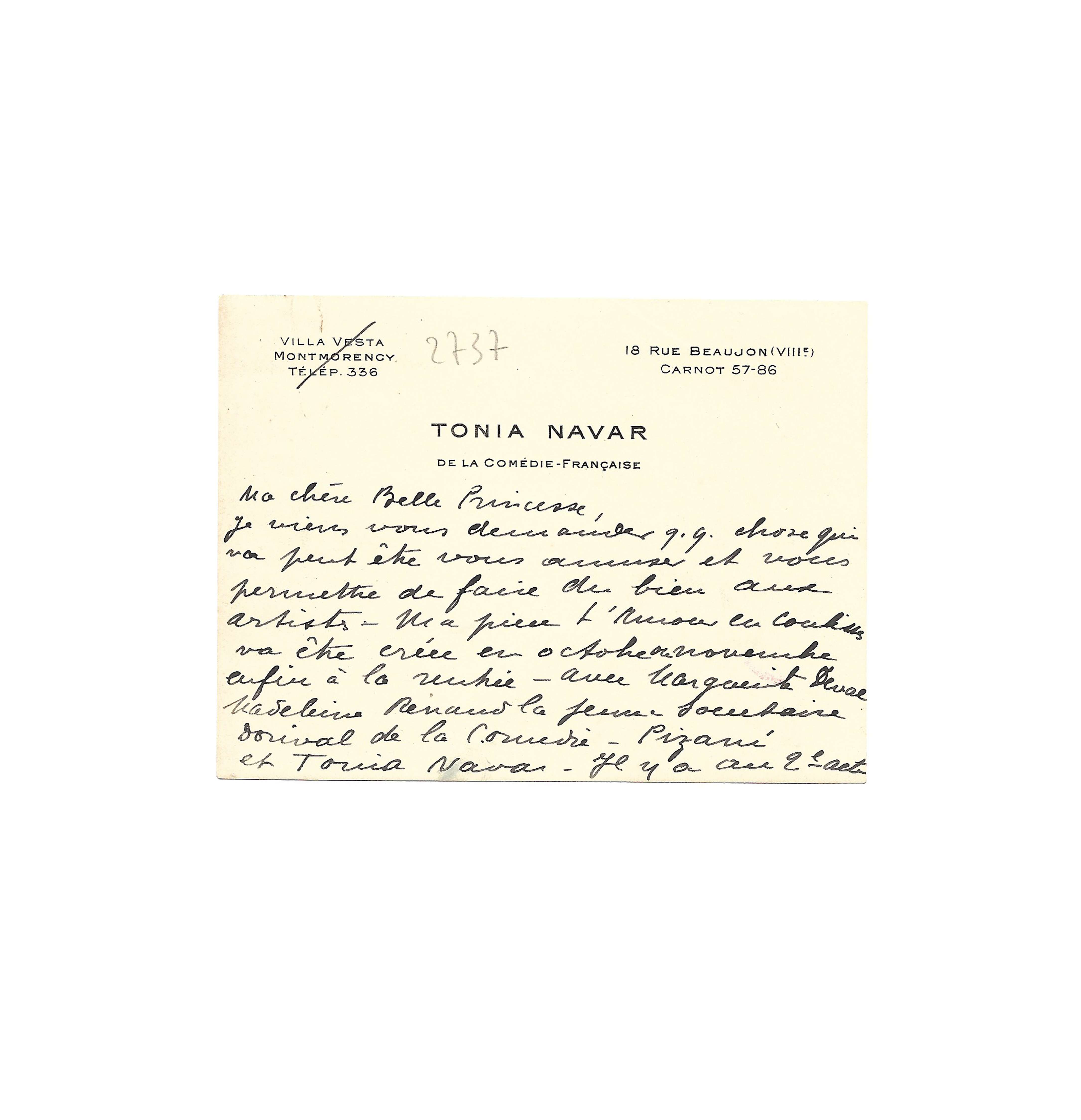 Tonia Navar is an actress and member of the Comédie Française. She forged a very strong relationship with Liane de Pougy and many other pre-war personalities.