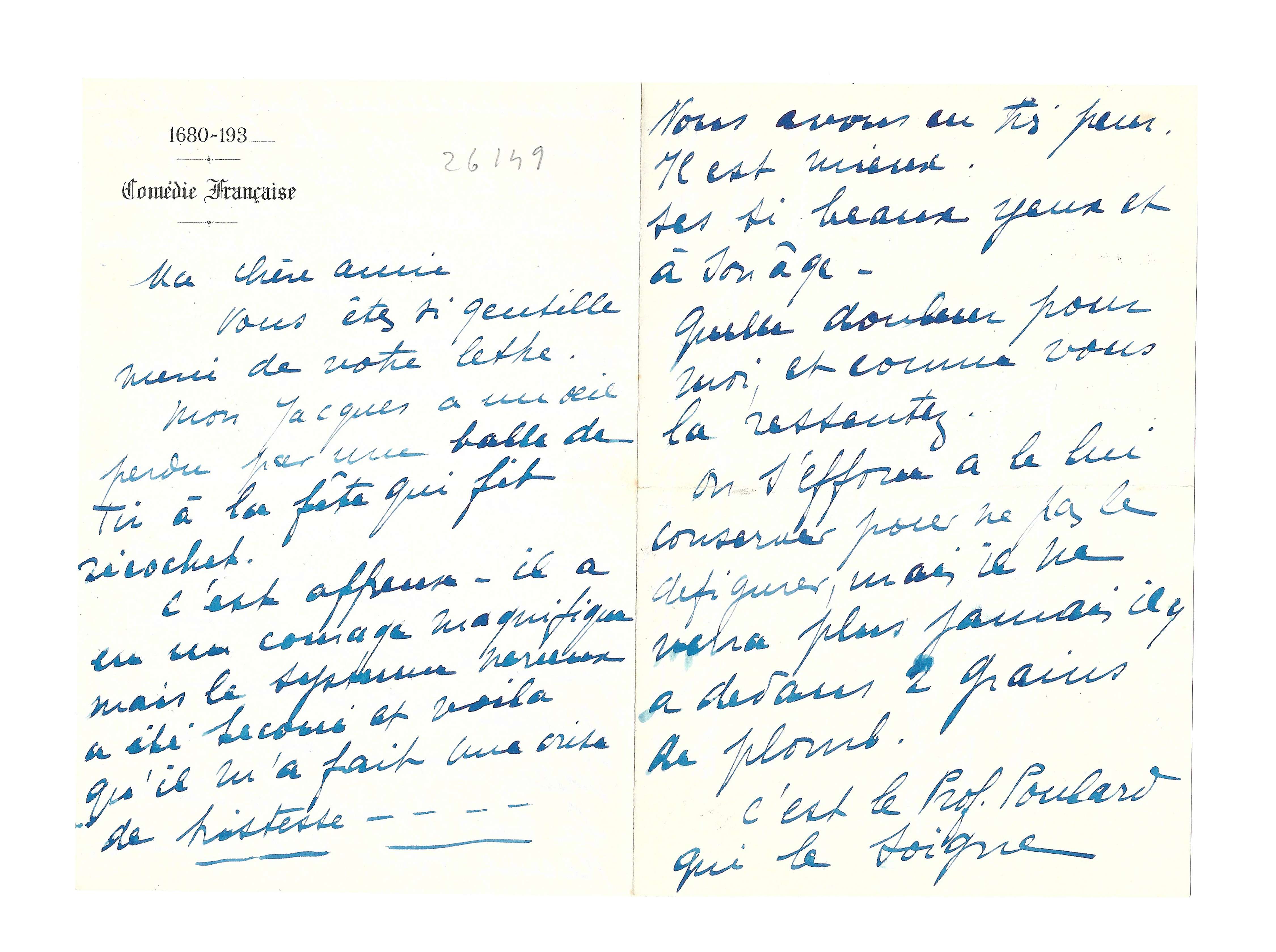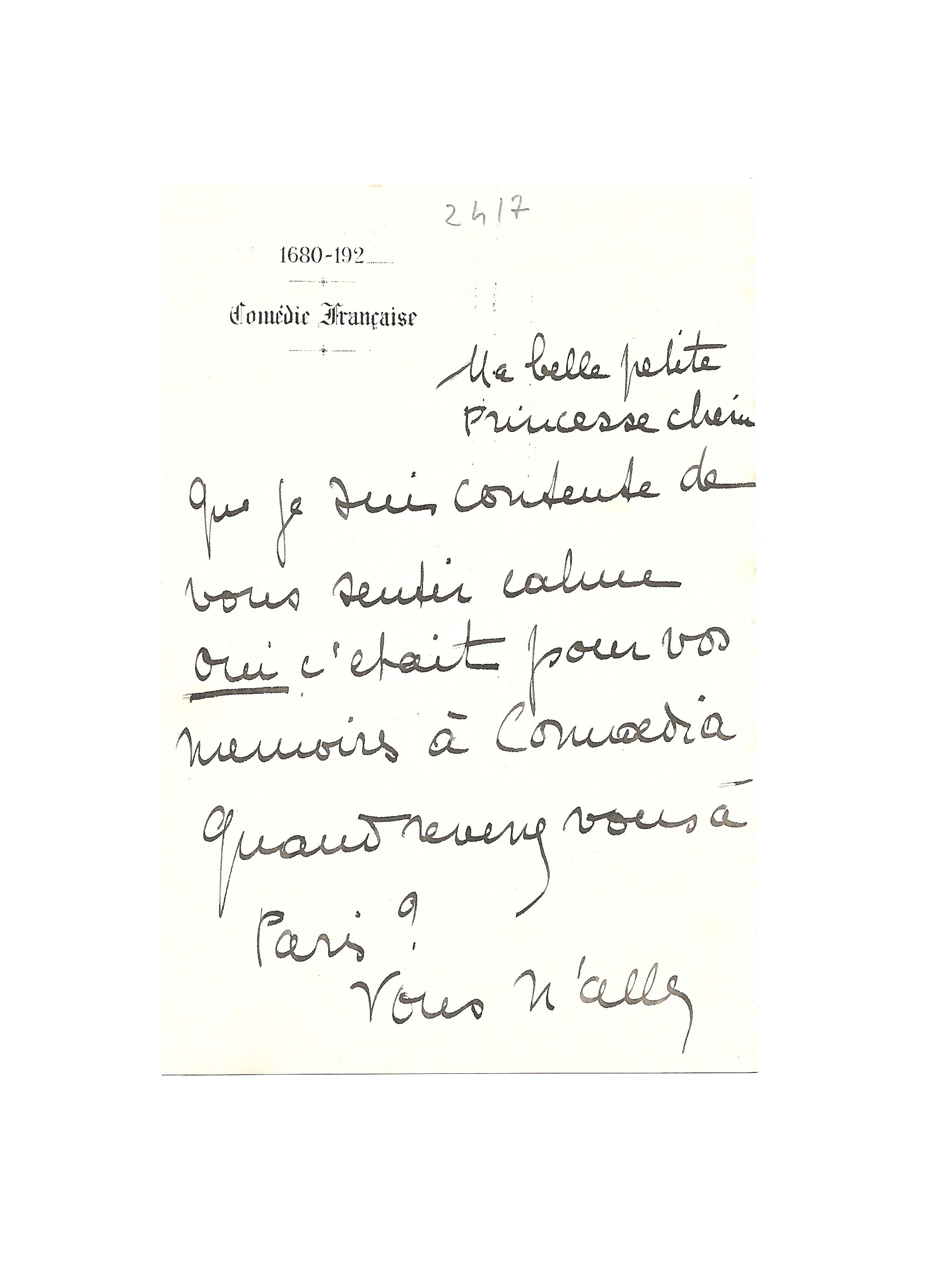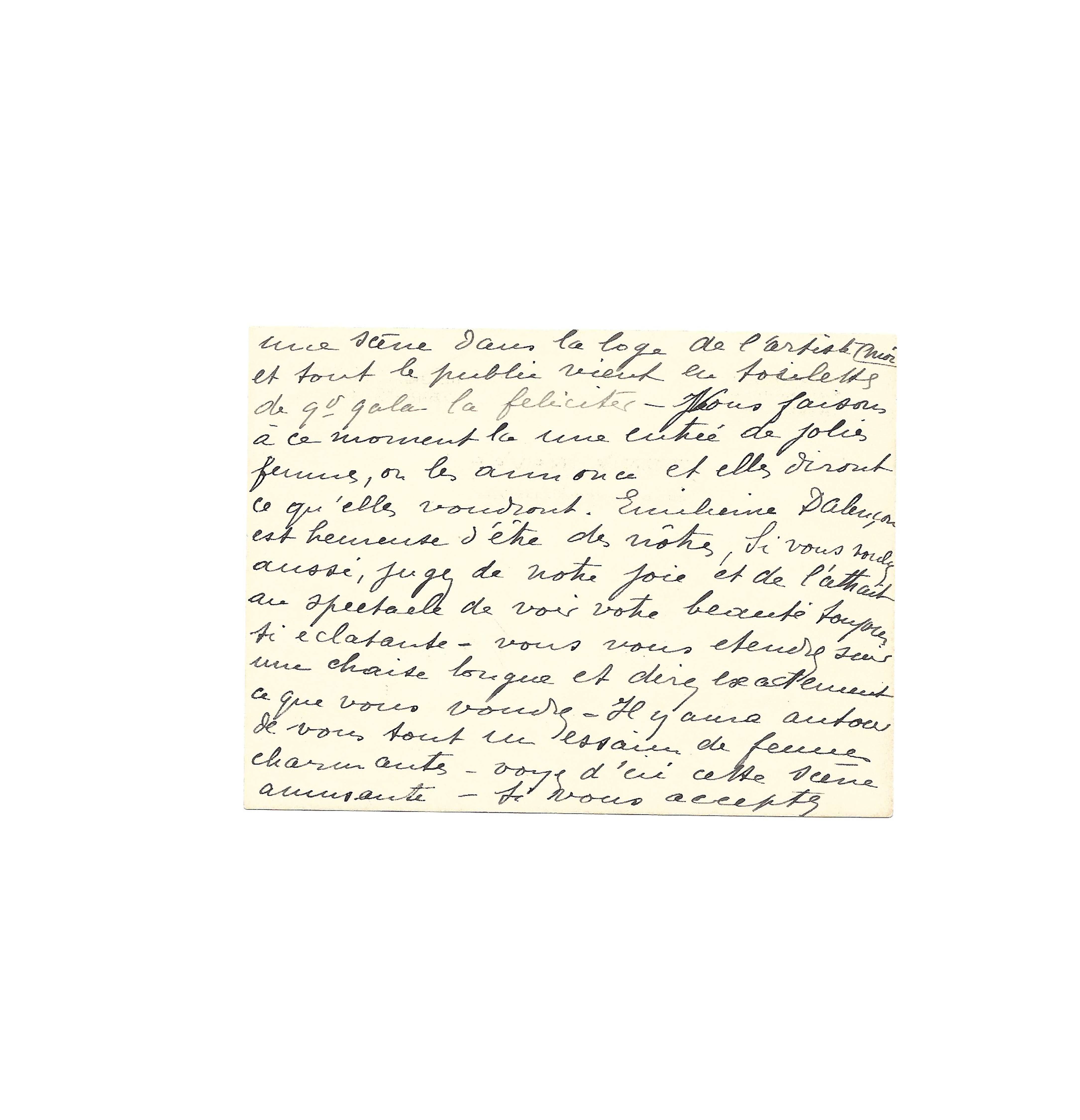 “Ma pièce L’Amour en coulisses va être crée en octobre ou novembre enfin à la rentrée […] Notre joie et l’attrait au spectacle de voir votre beauté toujours si éclatante […] Il y aura autour de vous tout un essaim de femmes charmantes […] Je vous vois belle, longue, faisant une entrée sensationnelle […]”