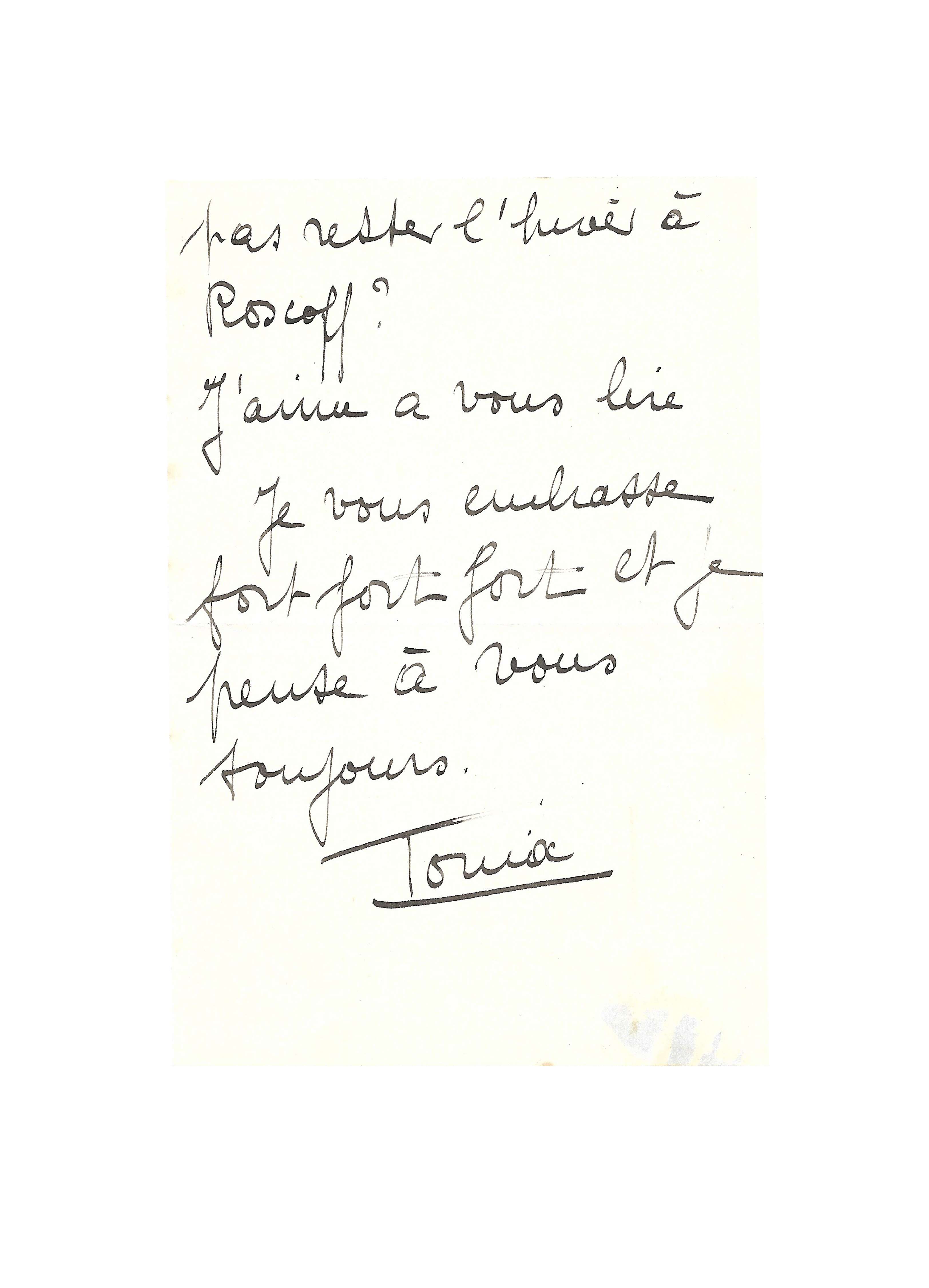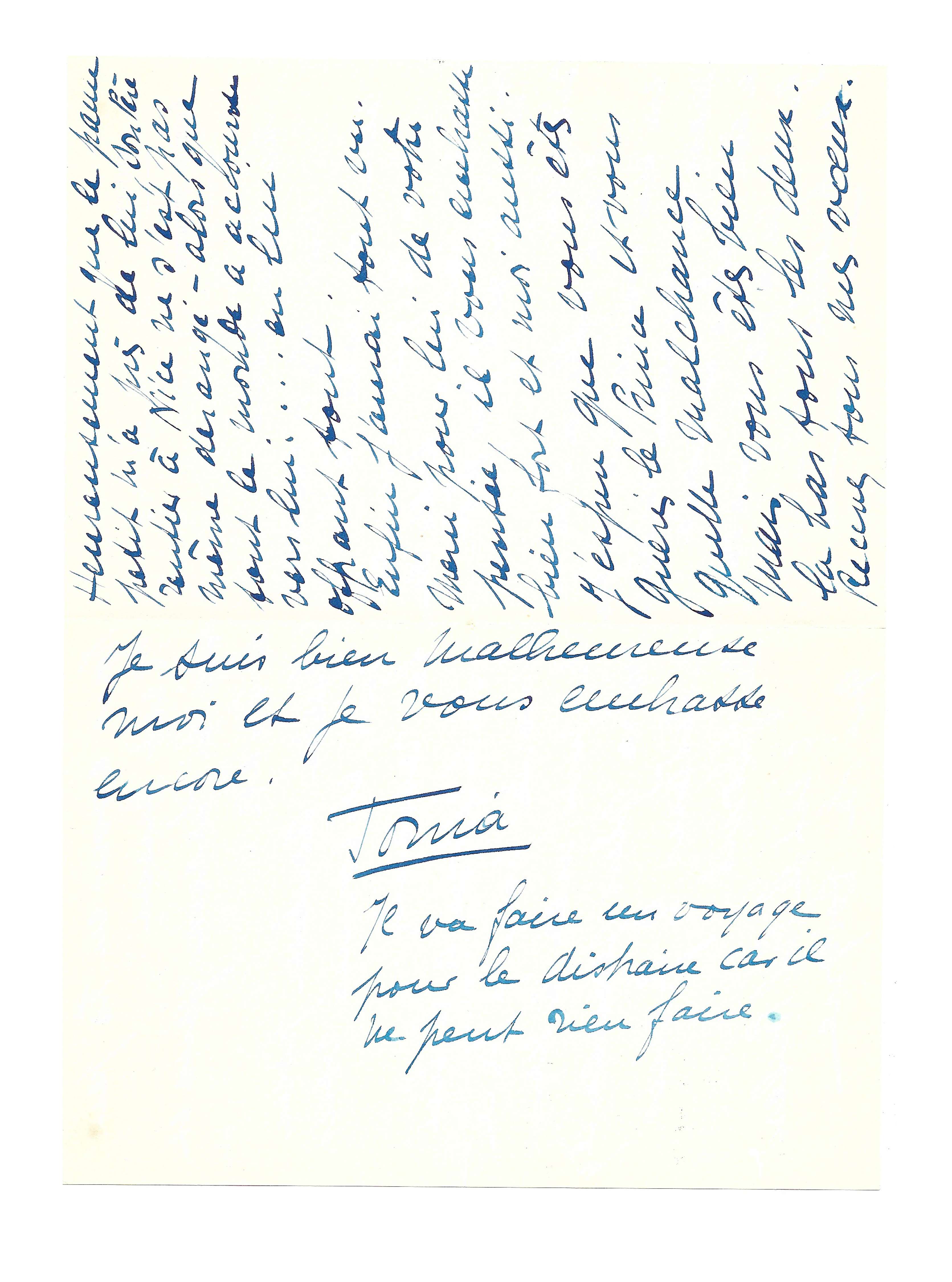 “Je suis peinée que vous pensiez toujours que je dis du mal de vous – je ne pense que du bien et je n’ai aucune raison pour dire le contraire. La personne qui vous répète cela avait un intérêt personnel à vous faire fâcher […] Je vous en supplie ne pensez plus cela.
