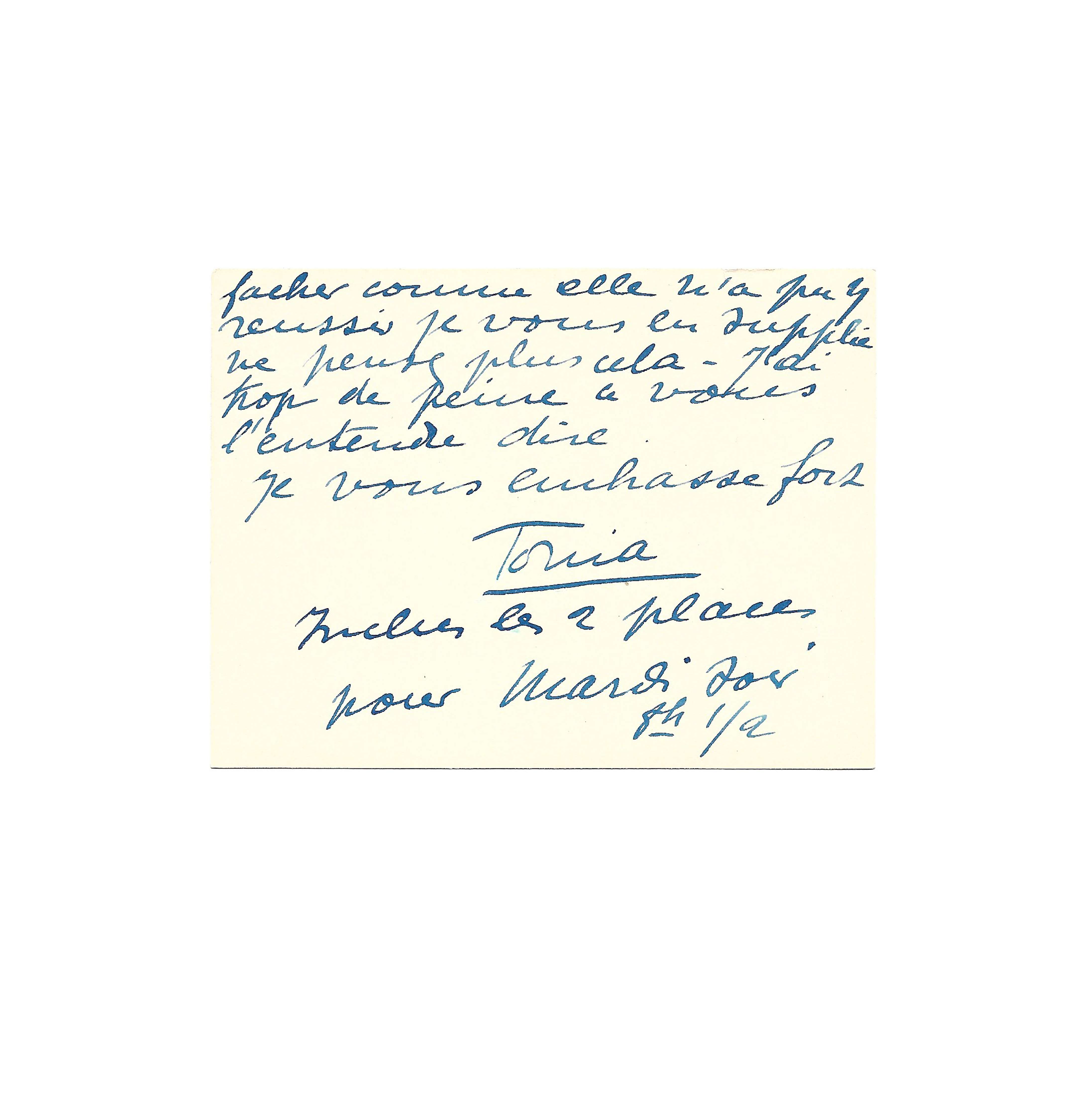 Inclus les deux places pour mardi soir [probablement pour une représentation théâtrale de Tonia Navar]”