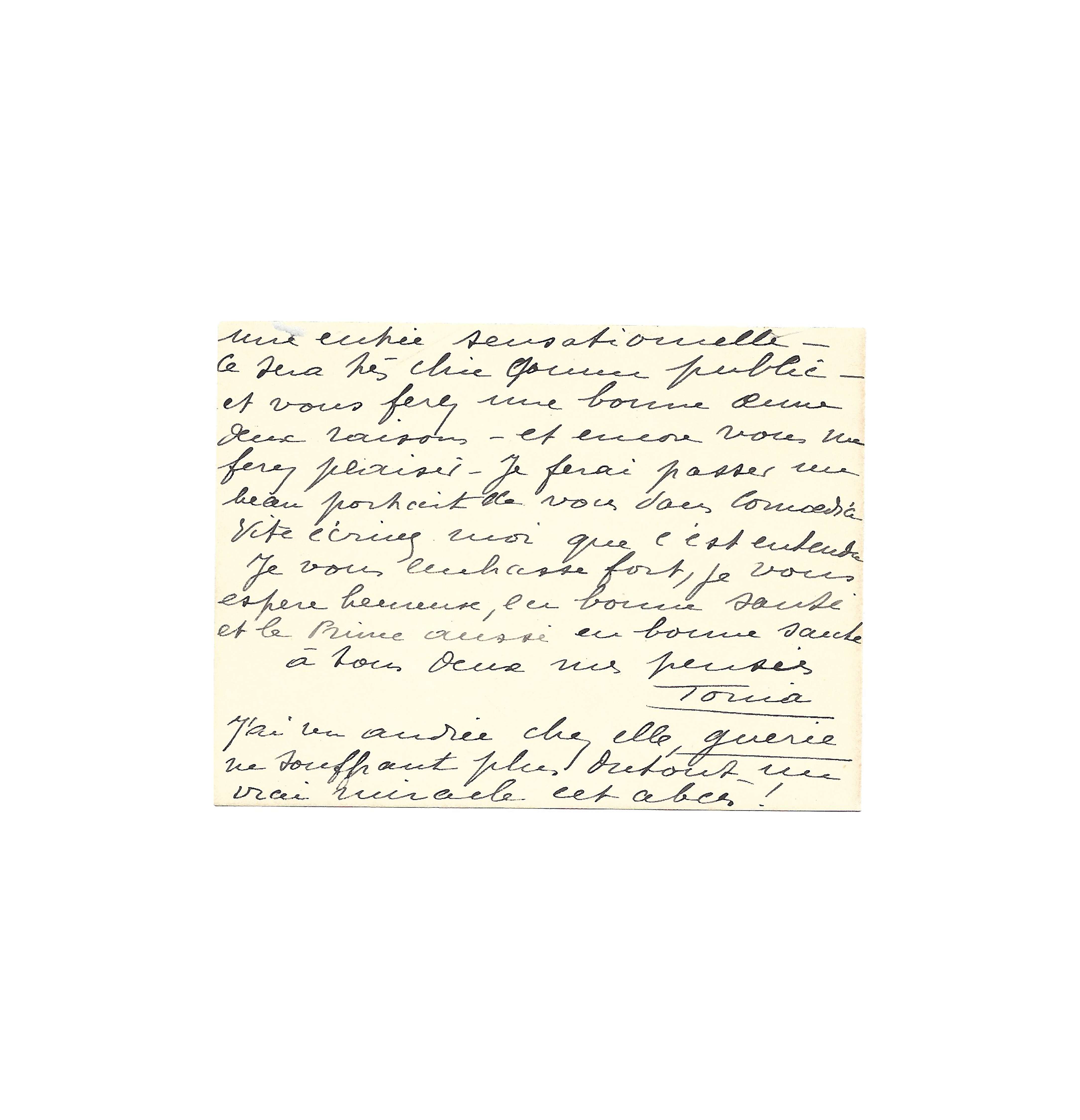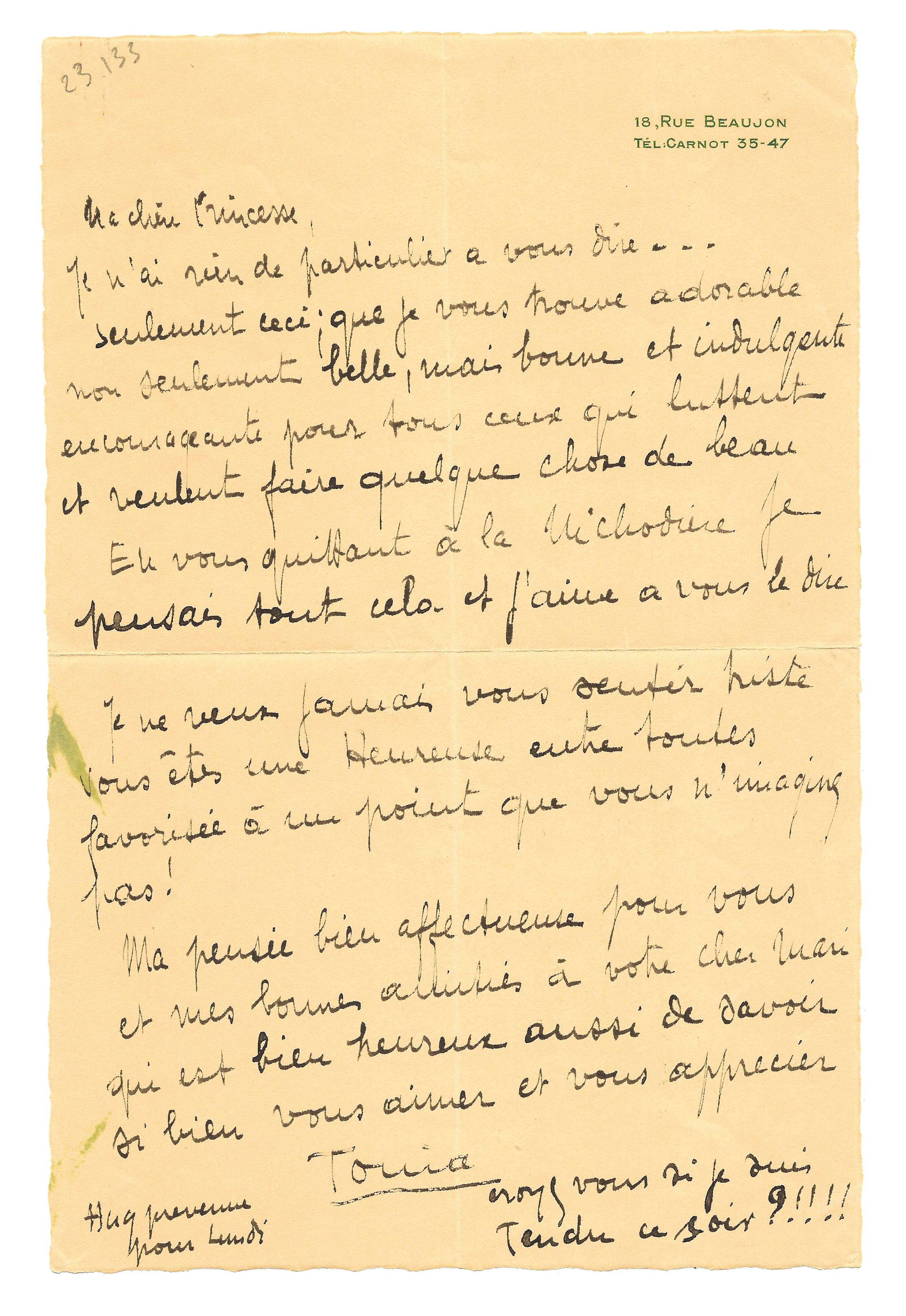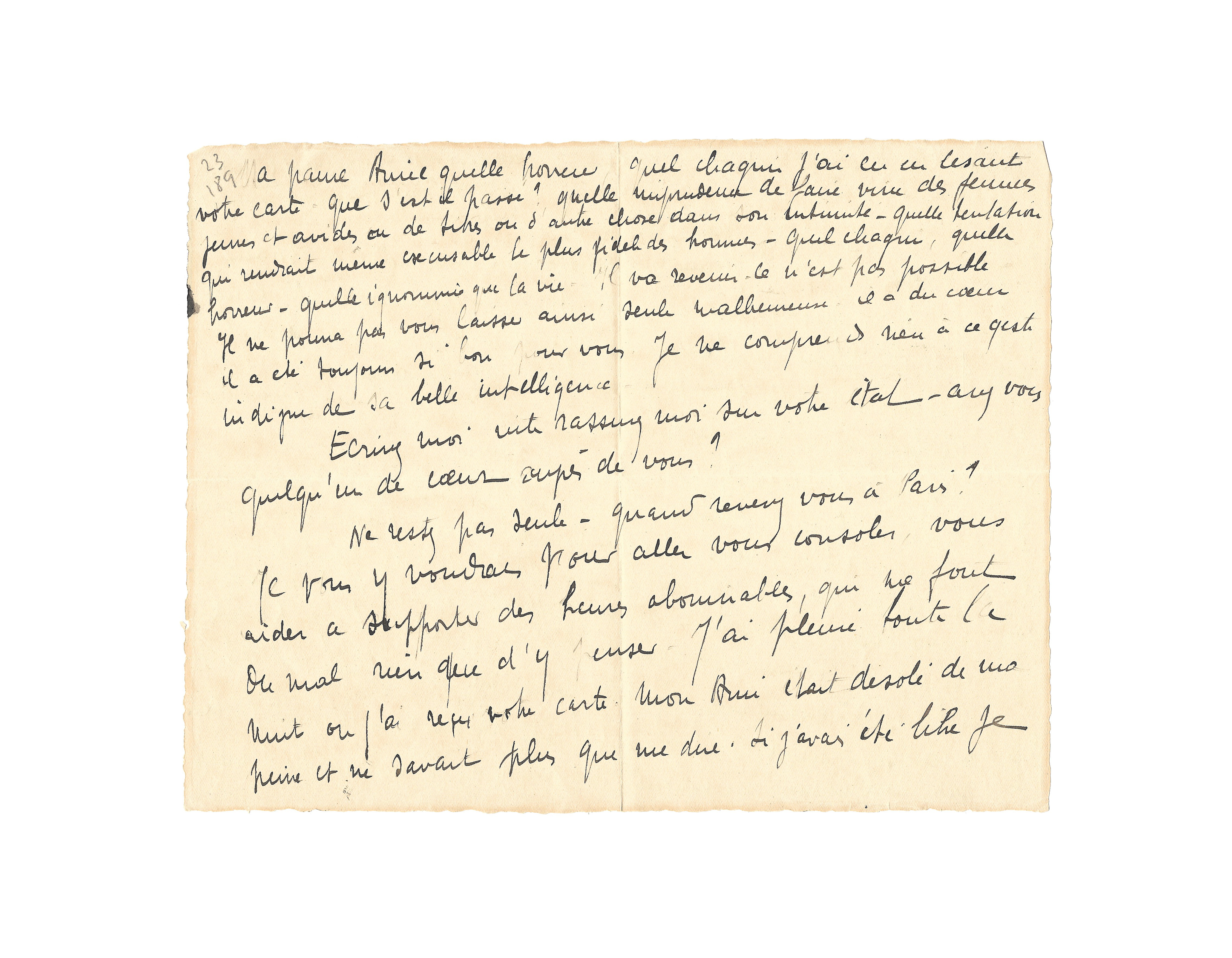 “Je n’ai rien de particulier à vous dire… seulement ceci; que je vous trouve adorable non seulement belle, mais bonne et indulgente encourageante pour tout ceux qui luttent et veulent faire quelque chose de beau […]”