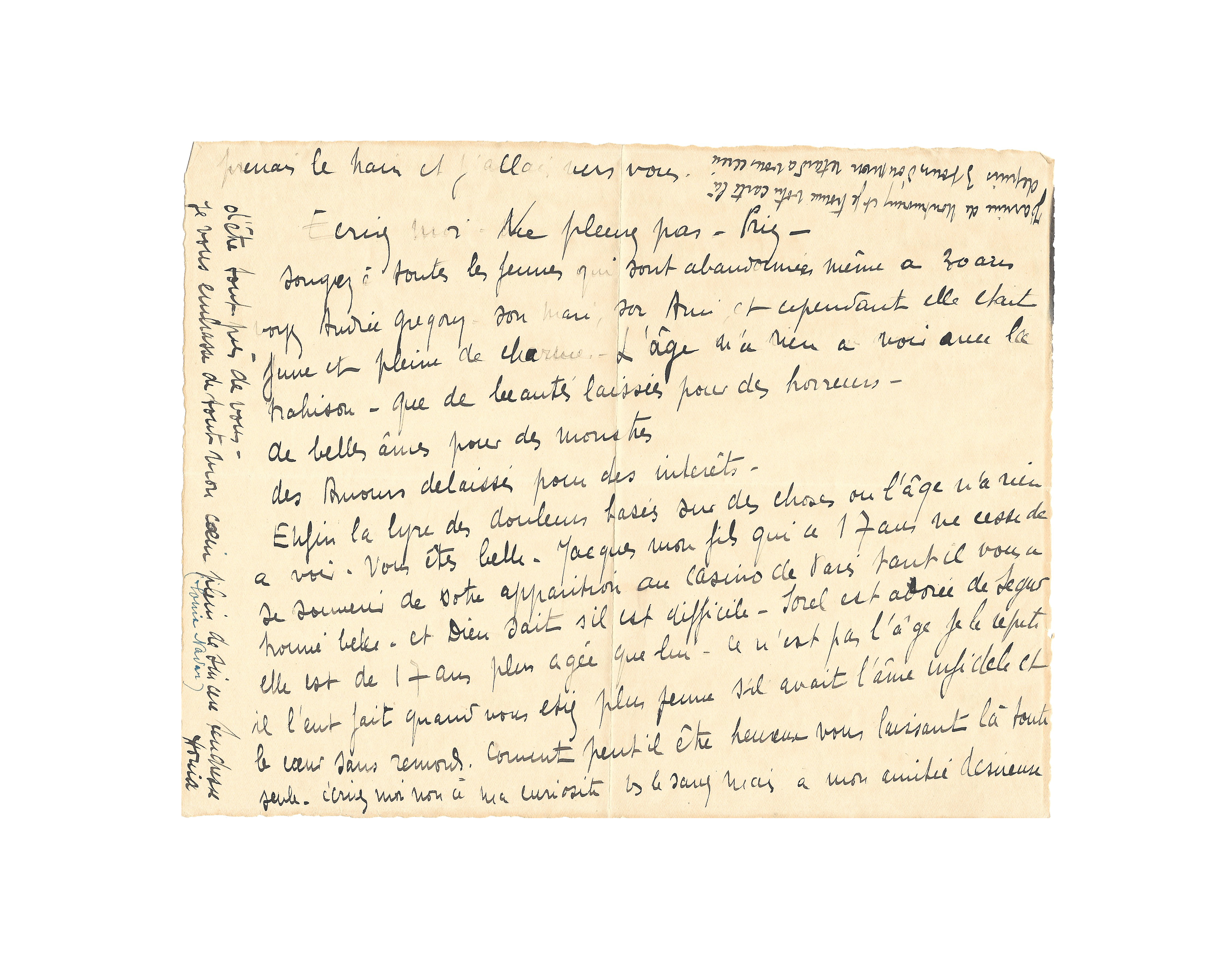 “Ecrivez-moi, ne pleurez pas, priez. Songez à toutes les femmes qui sont abandonnées même à 30 ans […] Vous êtes belle […]