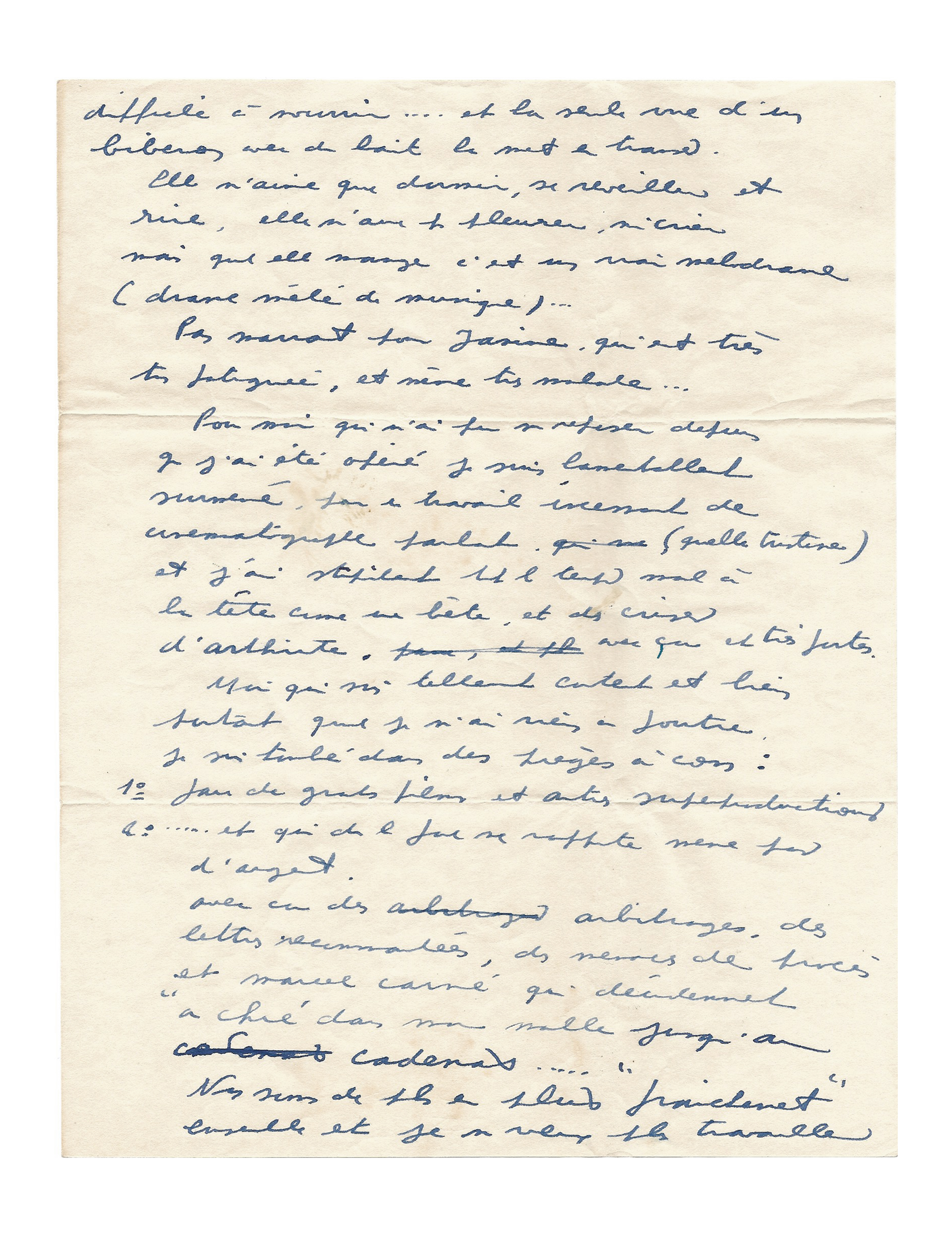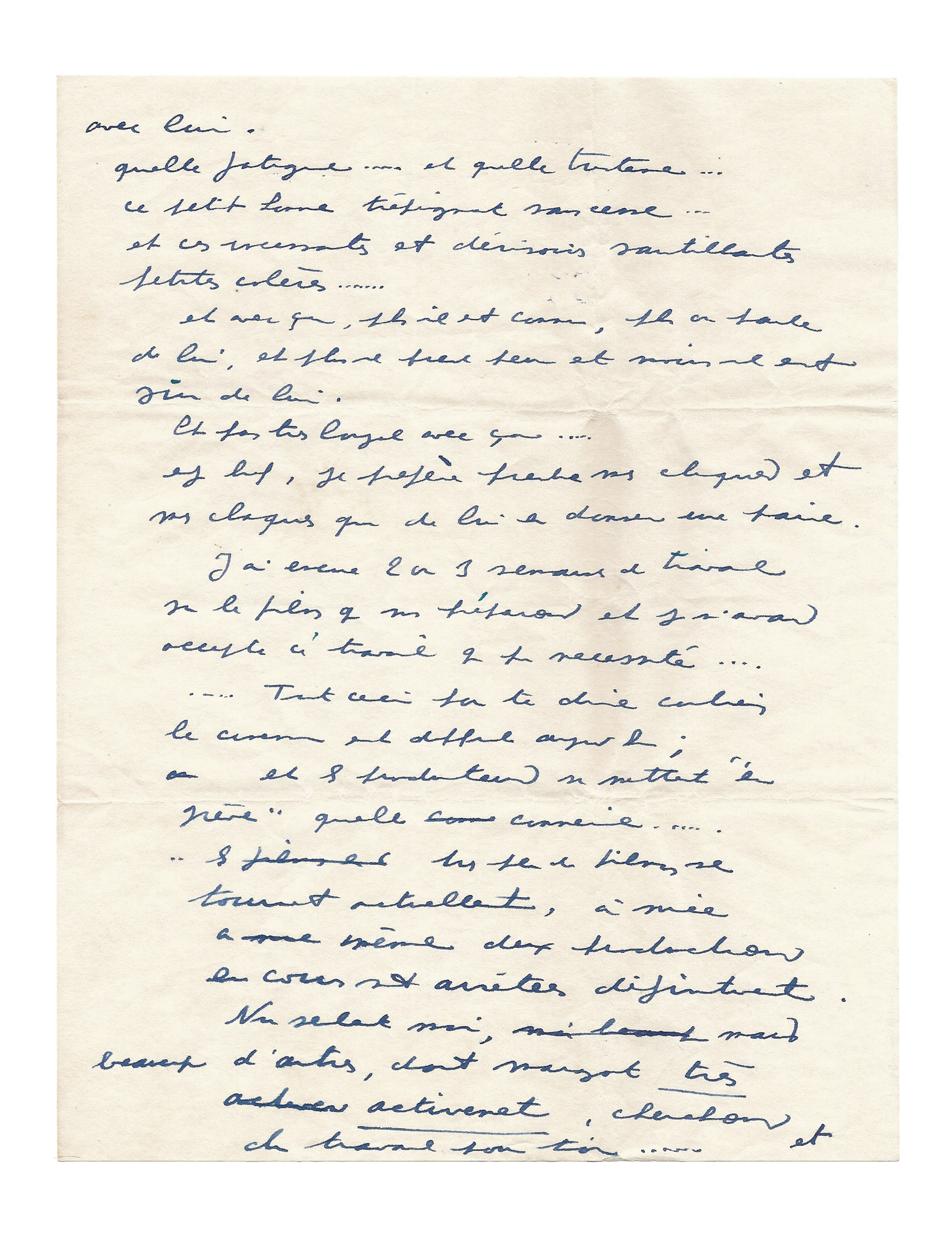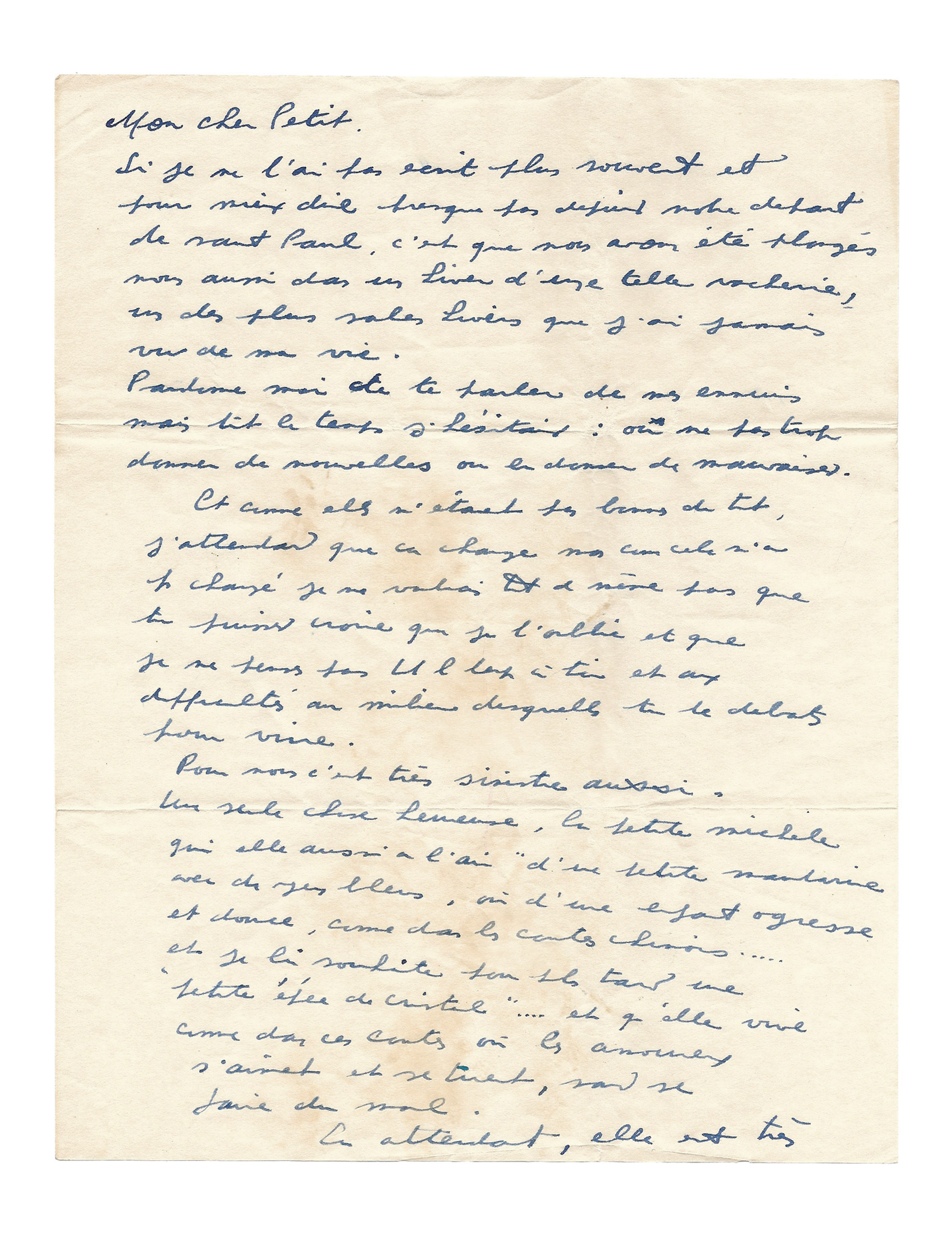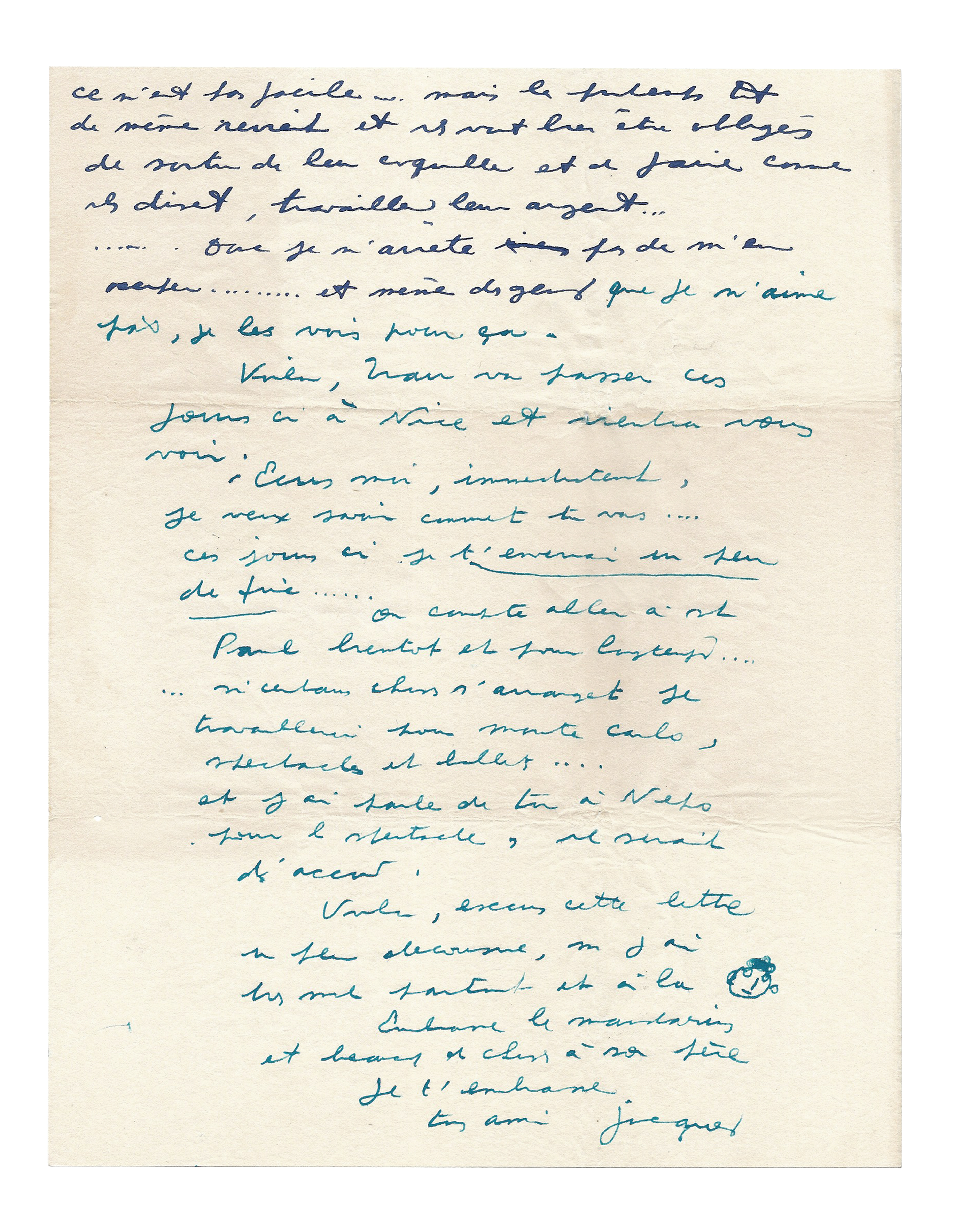 Claudy Emanuelli was a very young actress of 15 years old when she met Prévert at the end of the 30s, he who was already at the height of his fame. They experienced a great passion for love that ended before the poet met his second wife Janine Fernande Tricotet in 1943. This letter testifies to Prévert’s affection for his former love, for whom he has great affection and tries to help in his professional career.