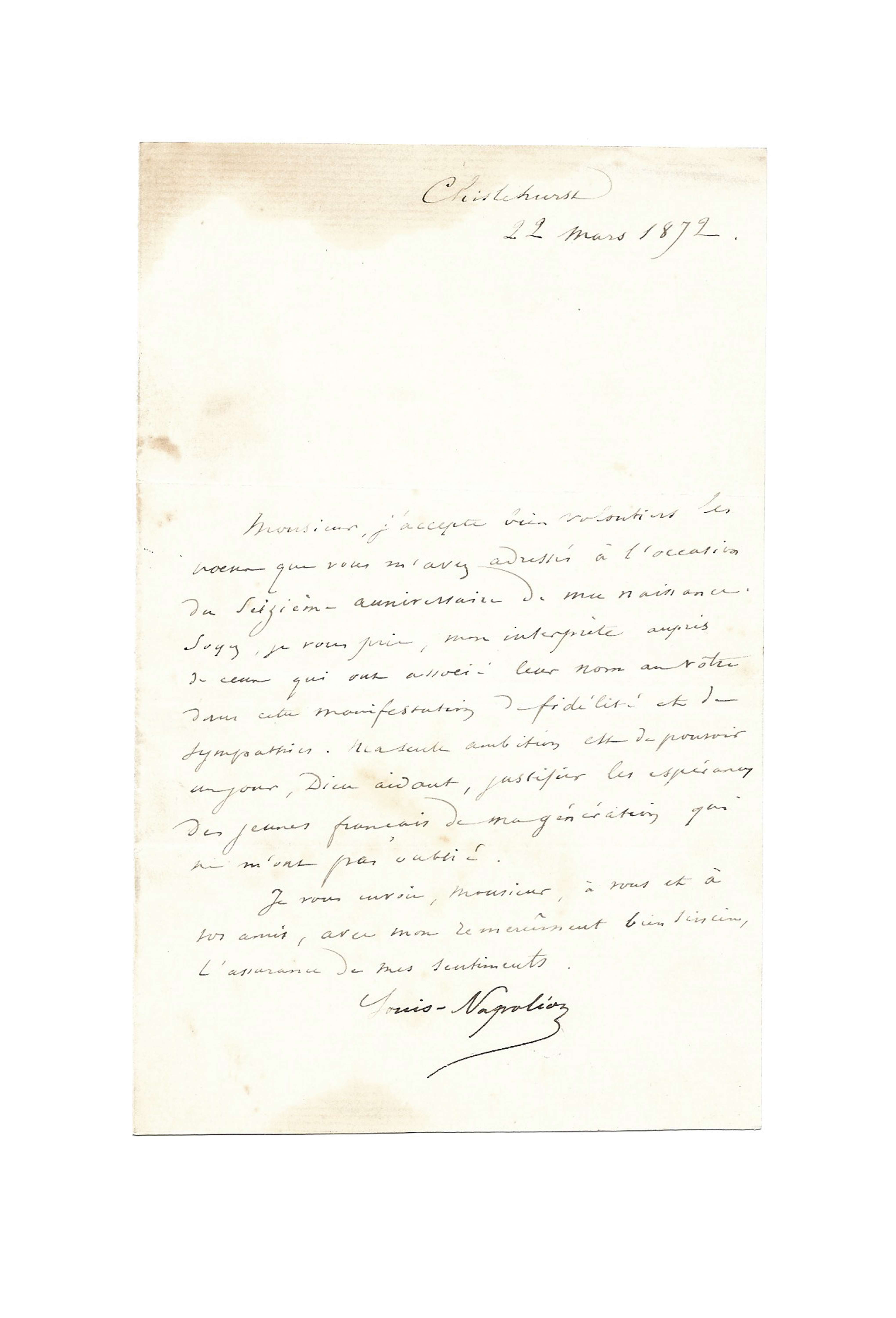 The letter was dictated to his tutor Augustin Filon (1841-1916) and then signed by the Prince Imperial.