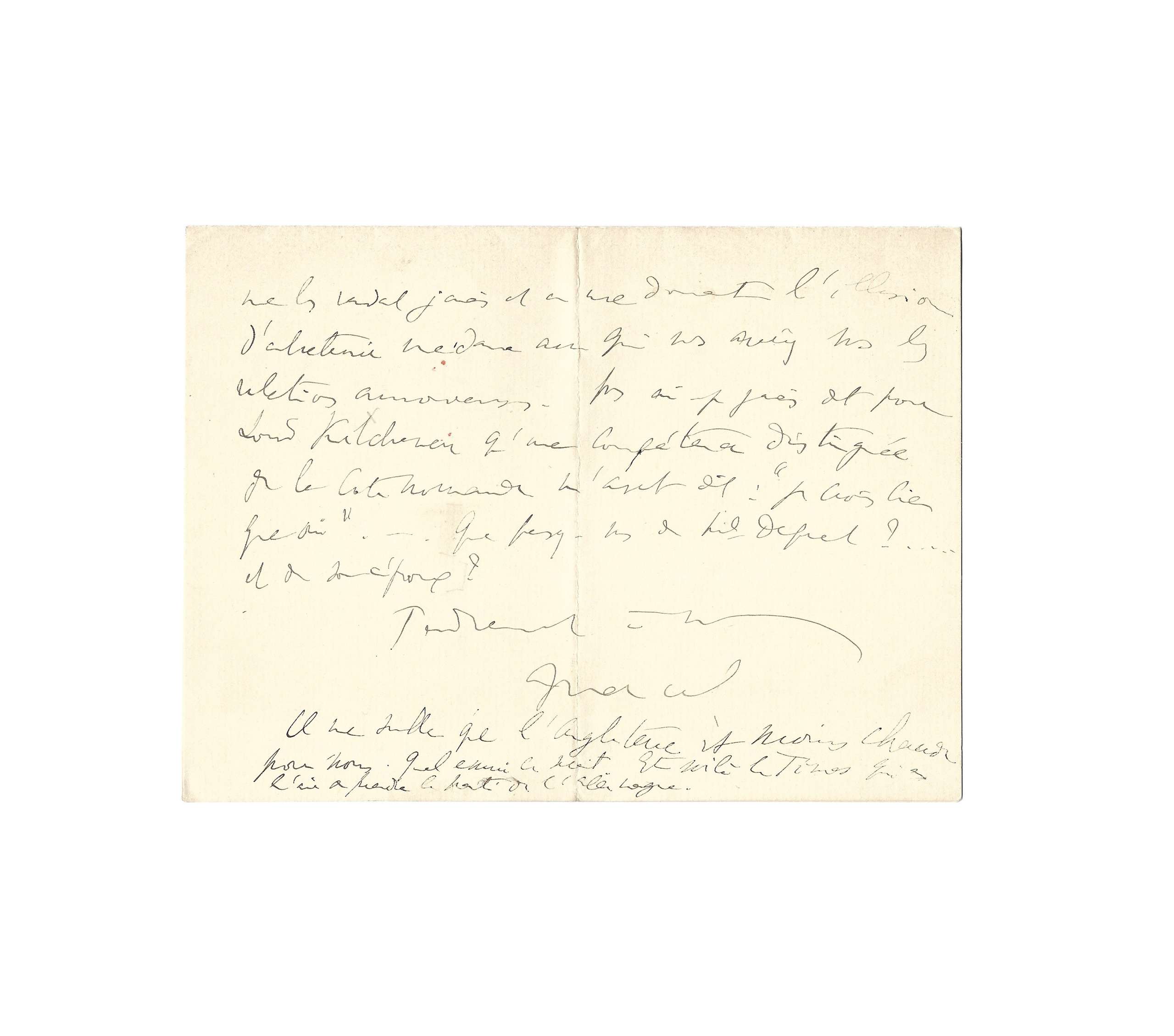 [Rothschild]. J’ai trouvé un peu d’argent pour attendre un peu, et j’espère ne pas avoir de difficultés pour mon terme. Mais ce sera tout juste. Inutile de vous dire que si vous aviez besoin d’argent, il me serait facile de vendre une valeur et de vous en envoyer le montant. Mais comme je viens précisément de me livrer à cette opération avec une Bourse déplorable, j’aimerais mieux ne recommencer que si cela était utile. Or je suppose qu’il vous est absolument indifférent que j’envoie cet argent. Je vous supplie de ne pas croire qu’il y a nonchalance de ma part et indifférence. Si vous me dites de le faire je le ferai instantanément. Et ce n’est pas parce que j’aurais distrait 500 fr. de l’équilibre instable de mes dettes (quel style !) que cela changera grand chose. Mais enfin, tâchant d’être raisonnable, peut’être serait-ce mieux pas en ce moment. Surtout ne me renvoyez pas les précédents 500. Vous me les rendrez quand vous viendrez, ou me feriez un plaisir sentimental en ne me les rendant jamais et en me donnant l’illusion d’entretenir une dame avec qui vous auriez vous les relations amoureuses. Vous ai-je jamais dit pour Lord Kitchener qu’une compétence distinguée de la côte normande m’avait dit : « je crois bien que oui »(1). Que pensez-vous de Me Depret ?(2)… et de son époux ?(3)