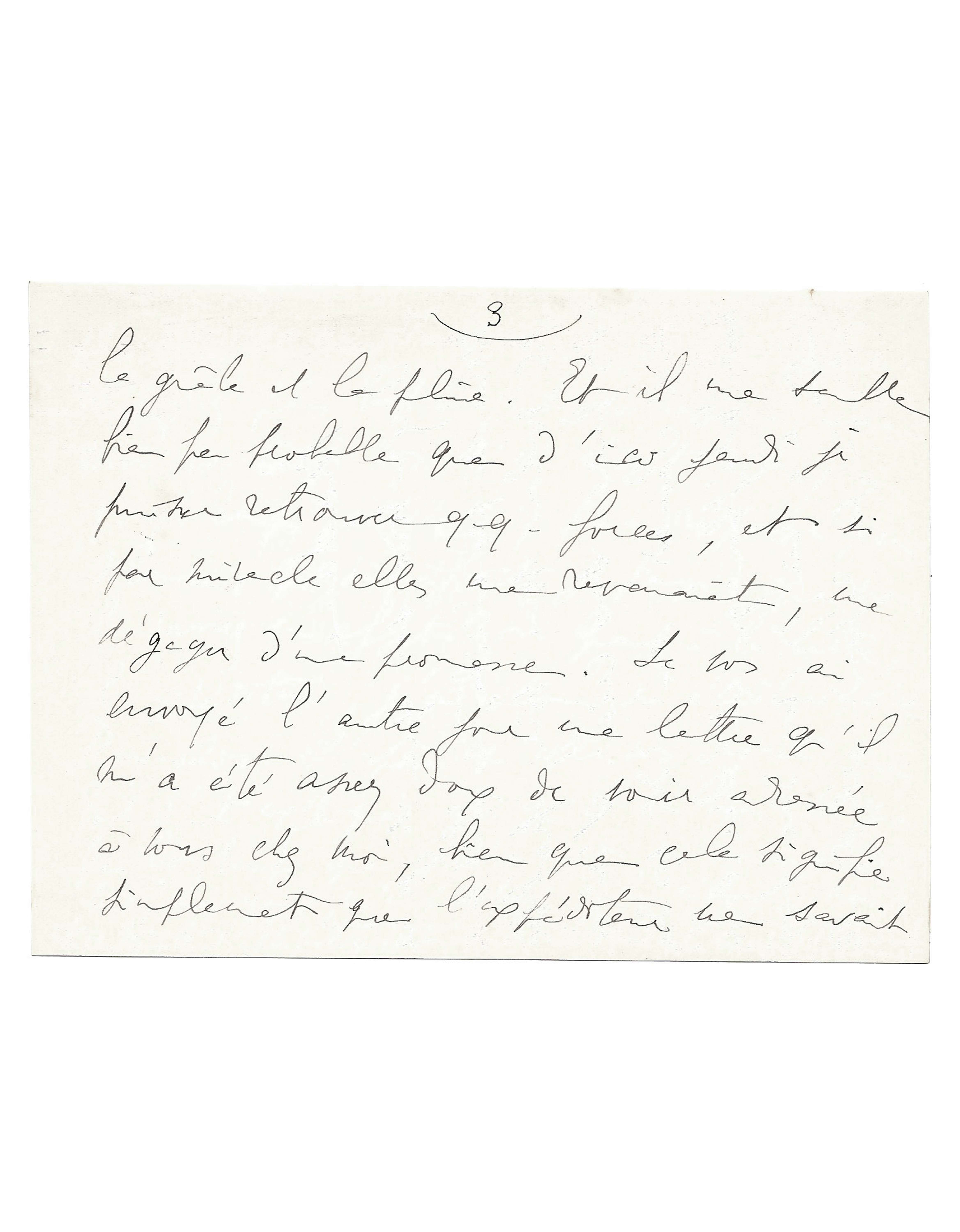 Je rentre aussi fort souffrant, dans la grêle et la pluie. Et il me semble bien peu probable que d’ici jeudi je puisse retrouver q[uel]q[ues] forces, et si, par miracle, elles me revenaient,