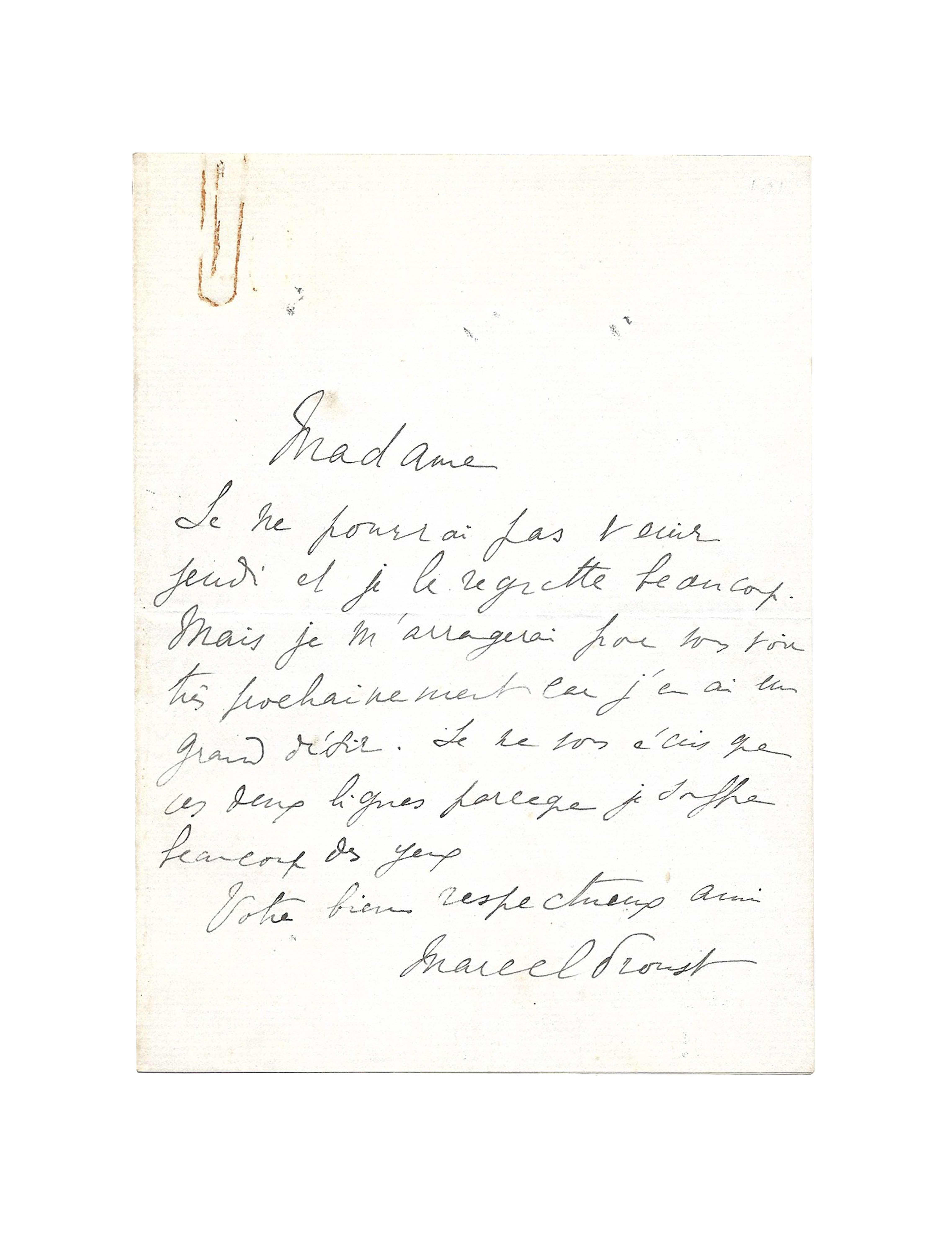 Affectionate letter from Marcel Proust to Marie Scheikévitch in which the writer must, with regret, postpone the appointment made with her
