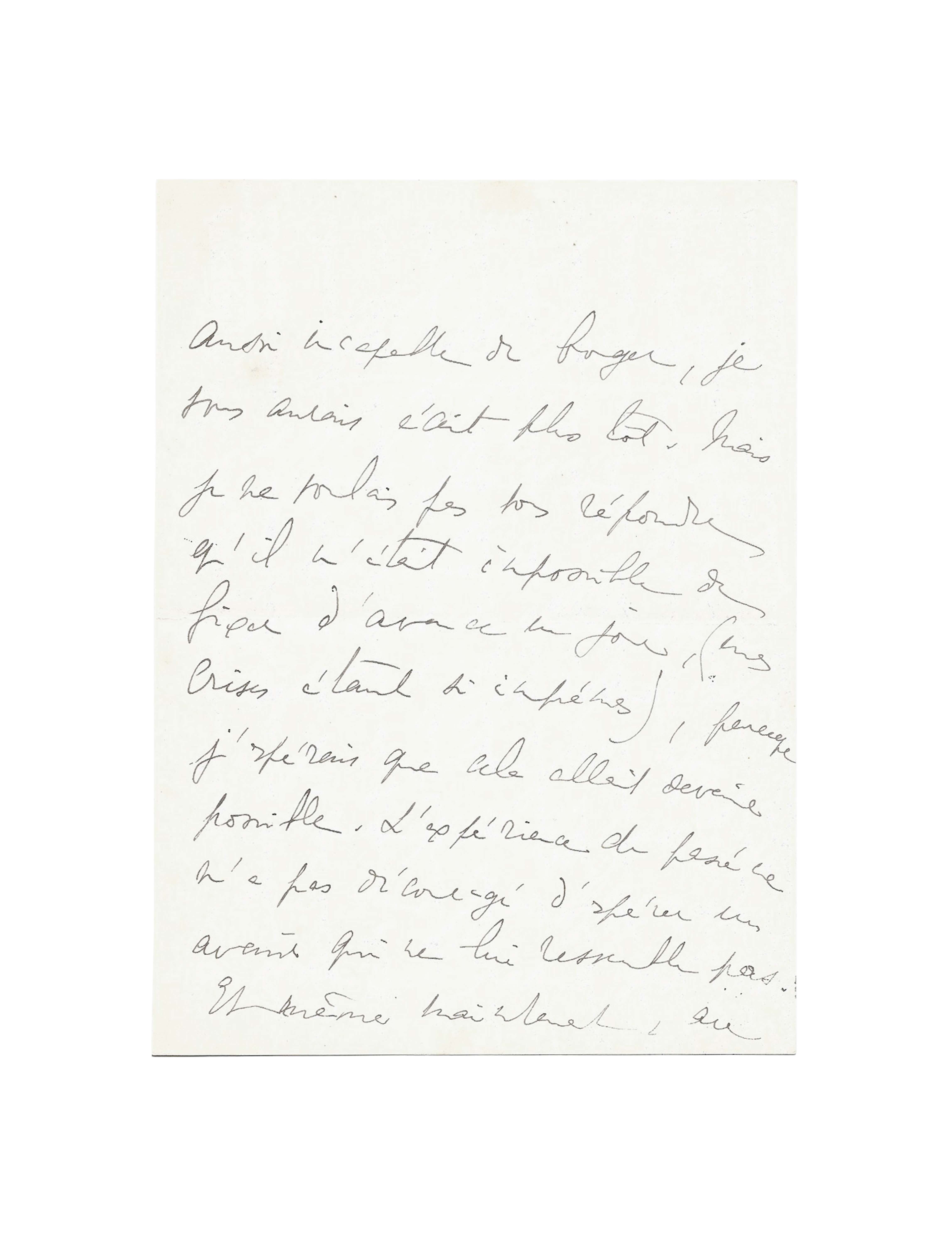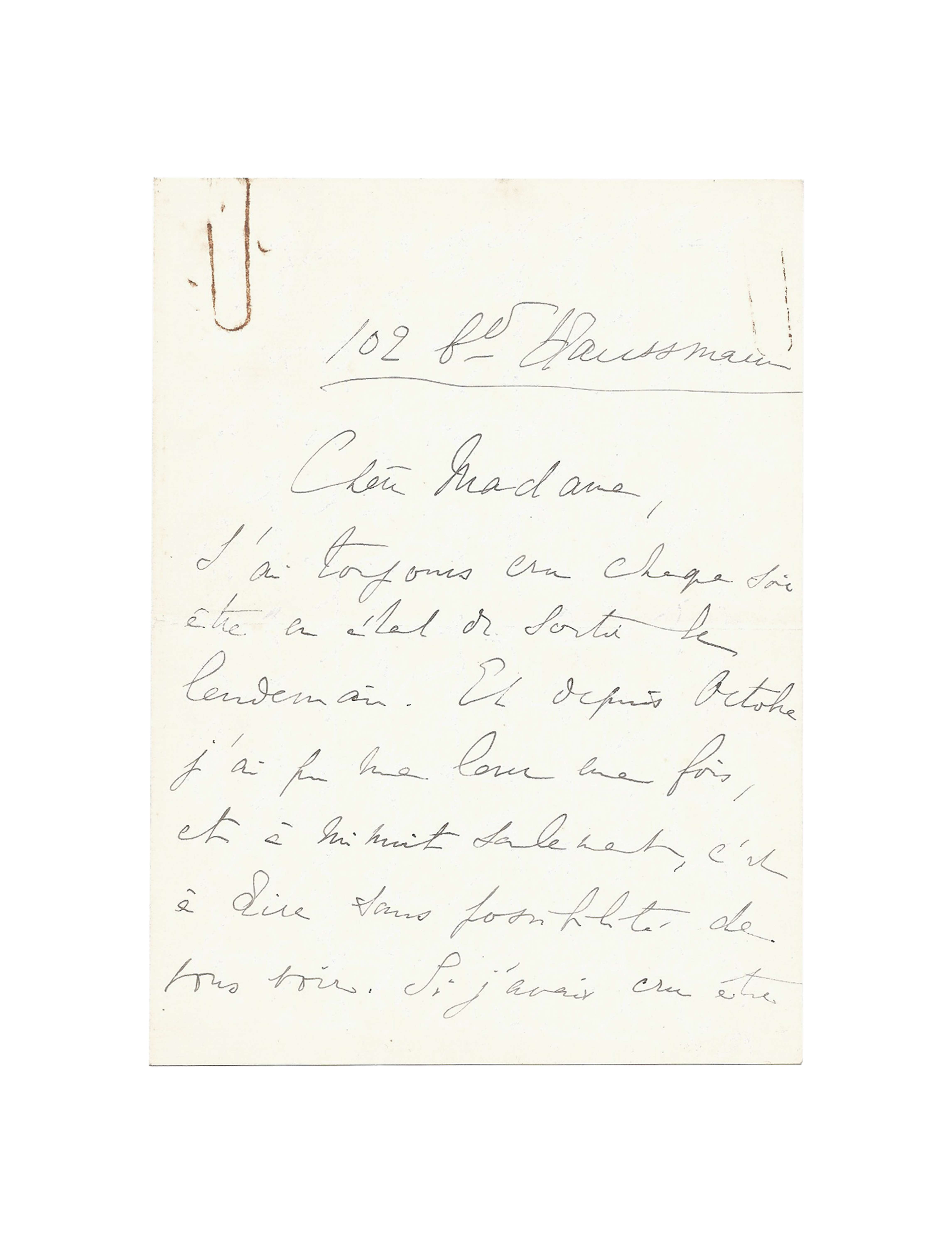 [Paris], 102 b[oulevar]d Haussmann, 1st February 1915 (post mark), 4 p. in-8° in black in on laid paper