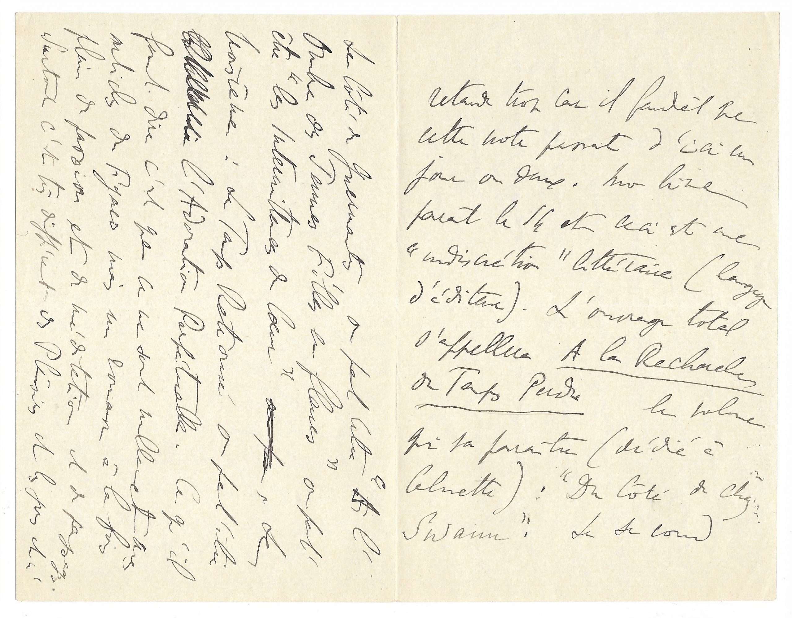 Mon livre paraît le 14 et ceci est une « indiscrétion » littéraire (langage d’éditeur). L’ouvrage total s’appellera A la Recherche du Temps Perdu [ ;] le volume qui va paraître (dédié à Calmette) : « Du Côté de chez Swann ». Le second Le Côté de Guermantes, ou peut’être « A l’ombre des Jeunes Filles en fleurs » ou peut’être « les Intermittences du Cœur » (4) ou peu. Le troisième : Le Temps Retrouvé ou peut’être l’Adoration l’Adoration Perpétuelle (5). Ce qu’il faut dire c’est que ce ne sont nullement mes articles du Figaro mais un roman à la fois plein de passion et de méditation et de paysages.