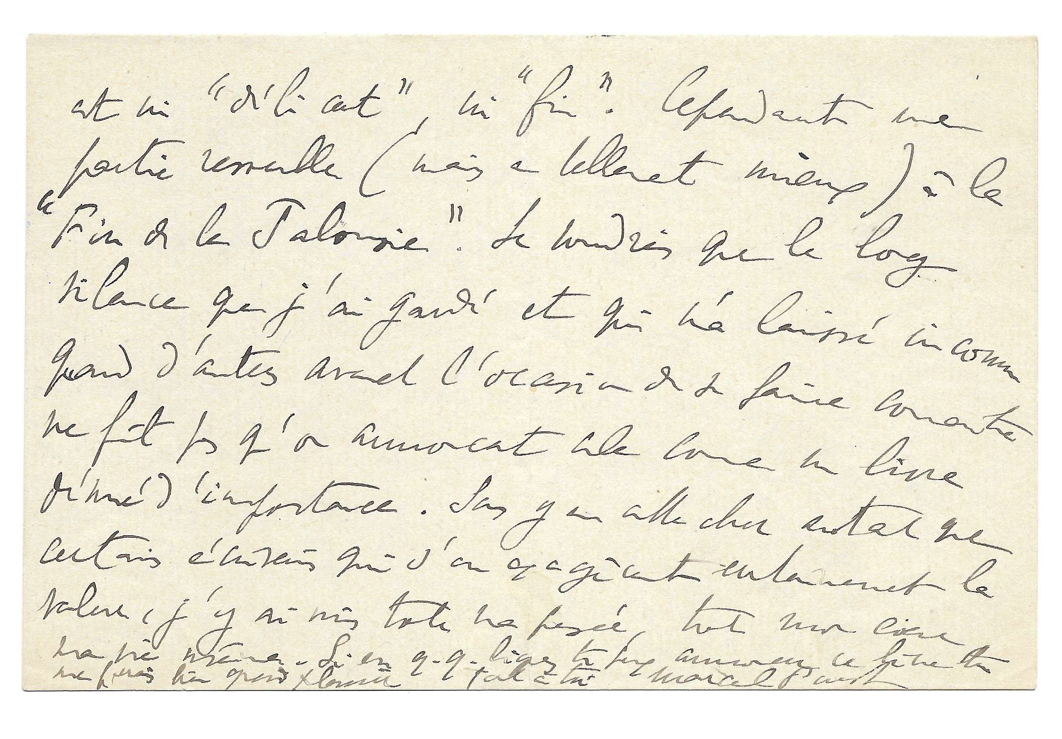Surtout c’est très différent des Plaisirs et les jours et n’est ni « délicat » ni « fin ». Cependant une partie ressemble (mais en tellement mieux) à la Fin de la Jalousie (6). Je voudrais que le long silence que j’ai gardé et qui m’a laissé inconnu quand d’autres avaient l’occasion de se faire connaître ne fît pas qu’on annonçât cela comme un livre dénué d’importance. Sans y en attacher autant que certains écrivains qui s’en exagèrent certainement la valeur, j’y ai mis toute ma pensée, tout mon cœur, ma vie même. Si en q.q. [quelques] lignes tu peux annoncer ce livre tu me ferais bien grand plaisir. Tout à toi. Marcel Proust »