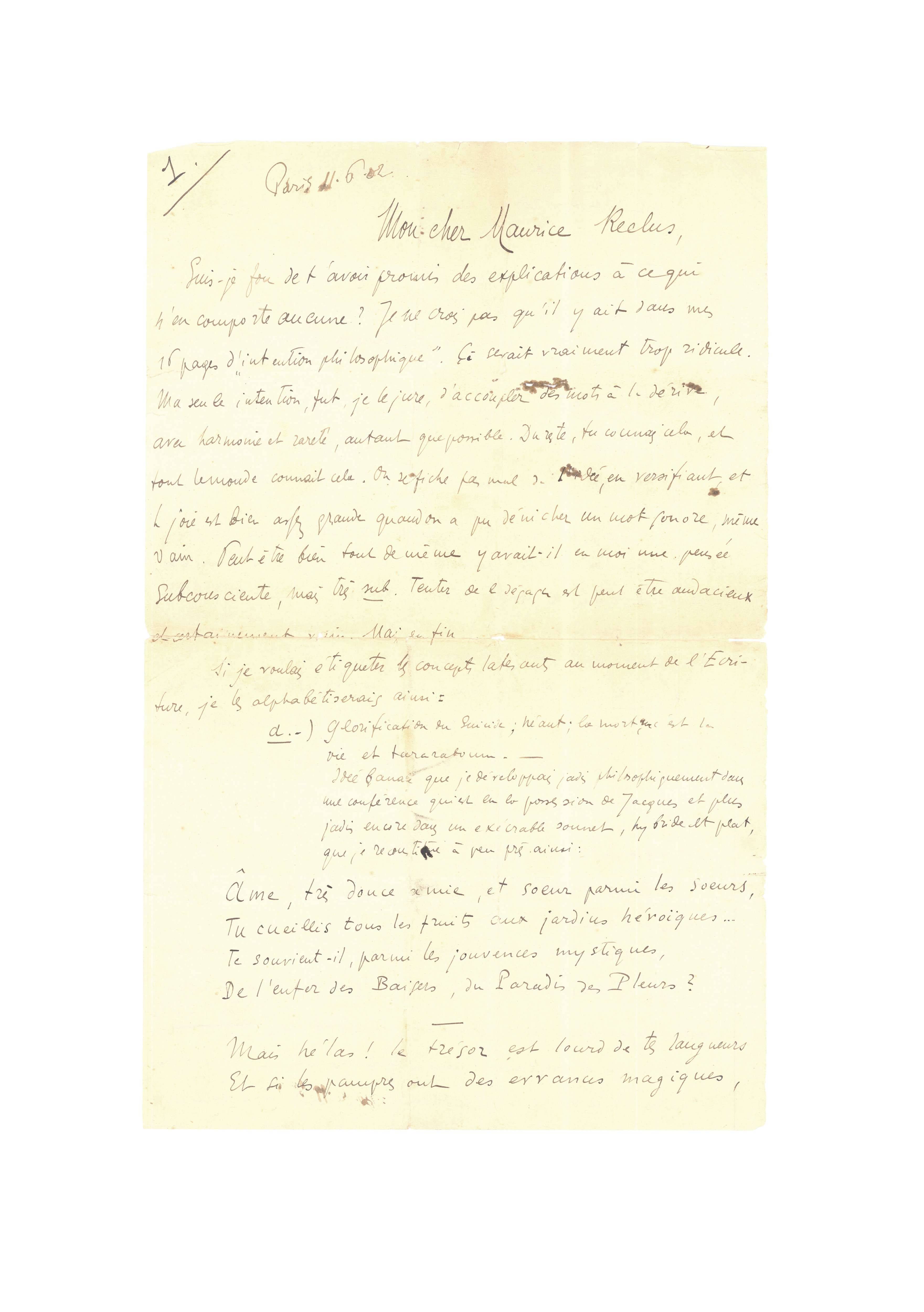 Psichari was 19 years old at the writing of this letter, dated June 11, 1902. He is going through a particularly troubled period. According to his biographer, Frédérique Neau-Dufour “It is partly a disappointed love that leads Ernest to [a] depressive state [p. 96]”, love for Jeanne Maritain, sister of Jacques and daughter of Geneviève Favre, the daughter of Jules Favre.