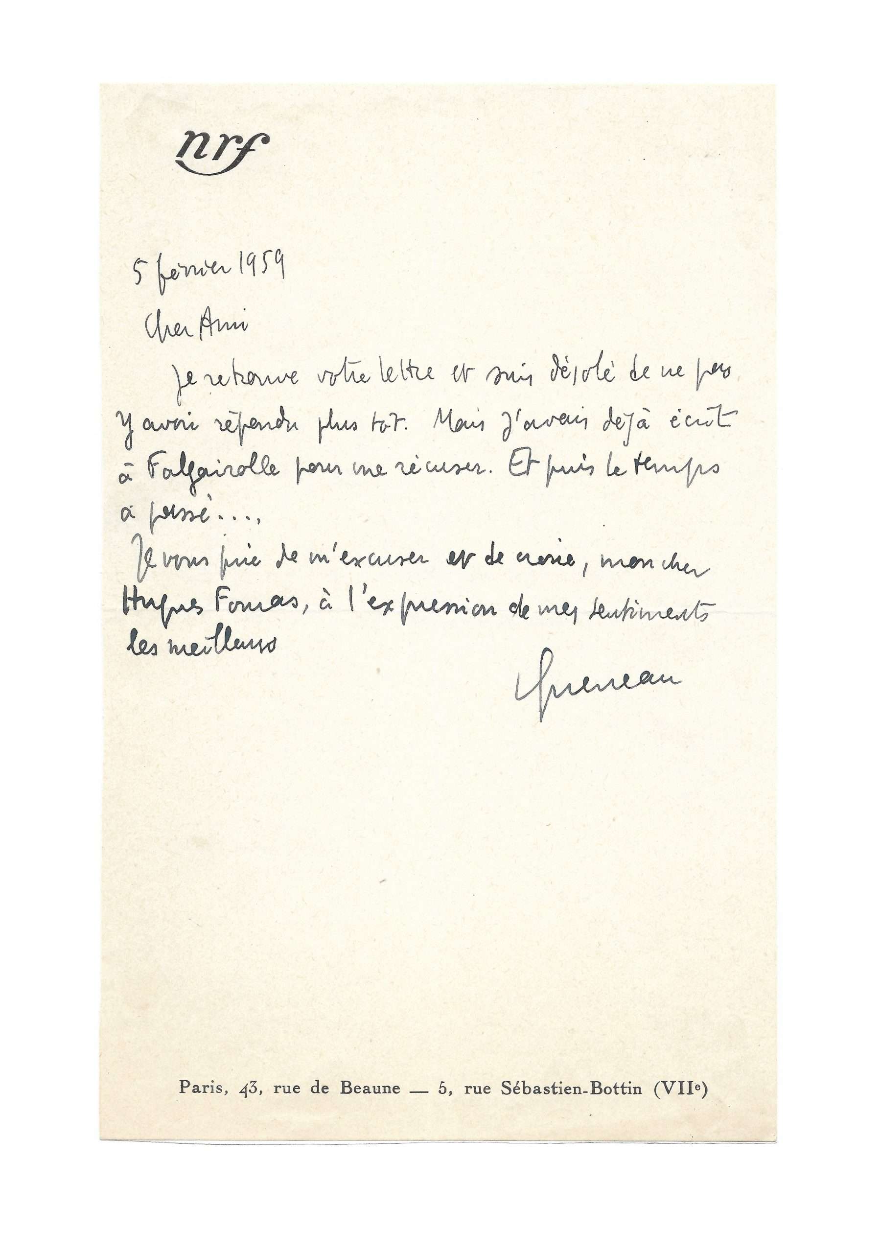S.L, 5 February 1959, 1 page in-8 with Nrf letterhead