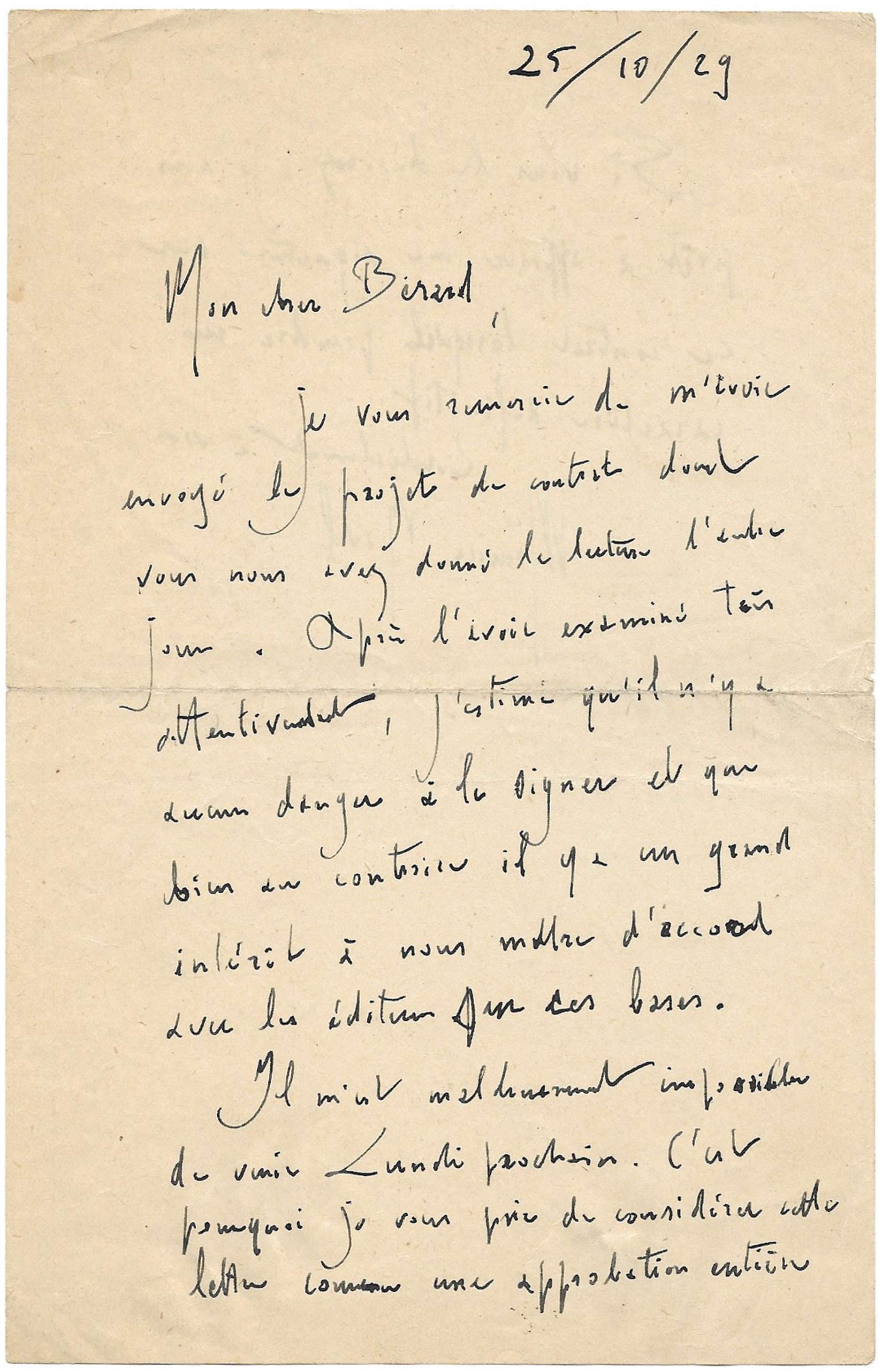 Je vous remercie de m’avoir envoyé le projet de contrat dont vous nous avez donné la lecture l’autre jour. Après l’avoir examiné très attentivement, j’estime qu’il n’y a aucun danger à le signer et que bien au contraire il y a un grand intérêt à nous mettre d’accord avec les éditeurs sur ces bases.