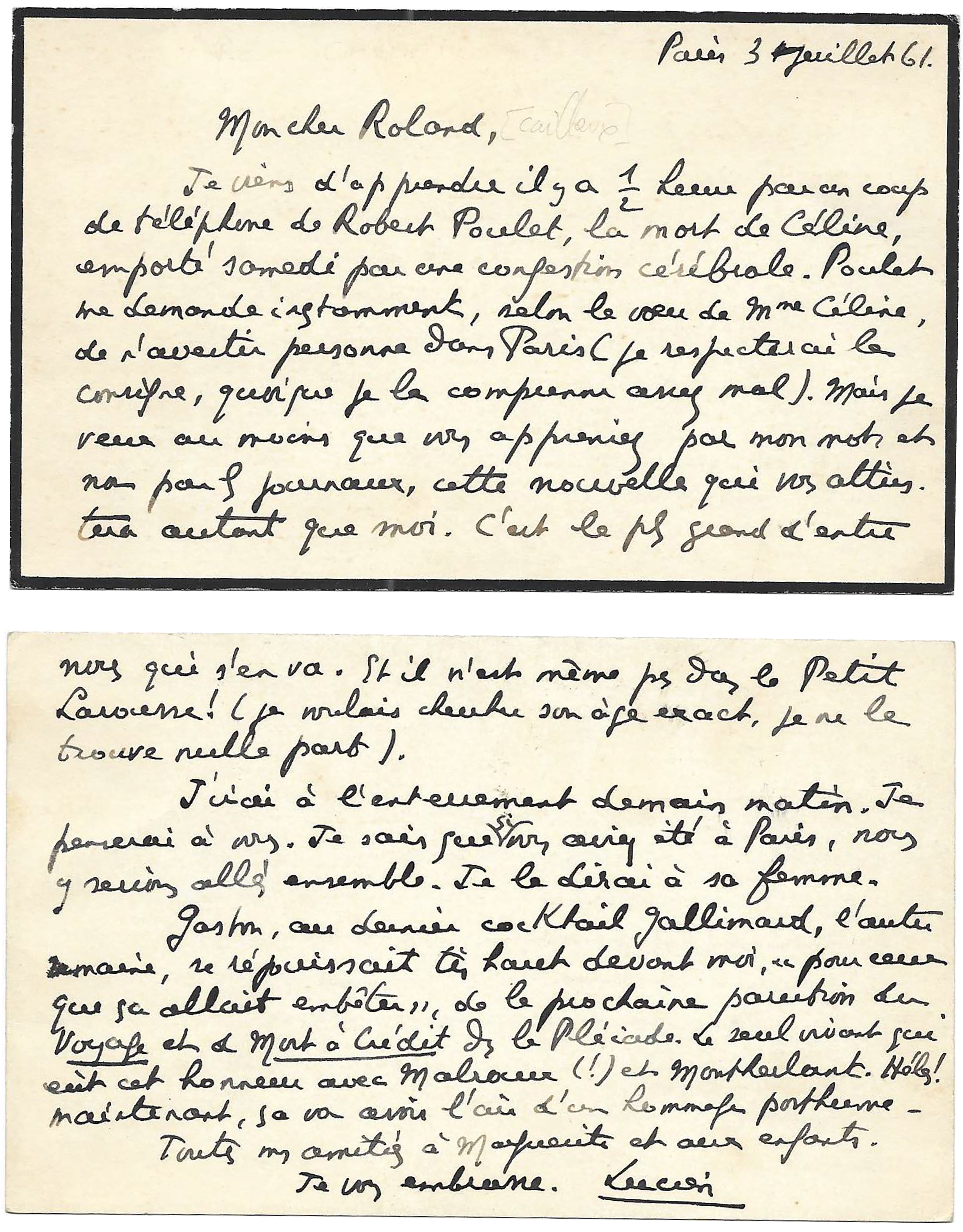 Je viens d’apprendre il y a 1/2 heure par un coup de téléphone de Robert Poulet, la mort de Céline, emporté samedi d’une congestion cérébrale. Poulet me demande instamment, selon le vœu de Mme Céline [Lucette Destouches], de n’avertir personne dans Paris (je respecterai la consigne, quoique je la comprenne assez mal). Mais je veux au moins que vous appreniez par mon mot et non par les journaux, cette nouvelle qui vous attristera autant que moi. C’est le plus grand d’entre nous qui s’en va. Et il n’est même pas dans le Petit Larousse ! (Je voulais chercher son âge exact, je ne le trouve nulle part).
