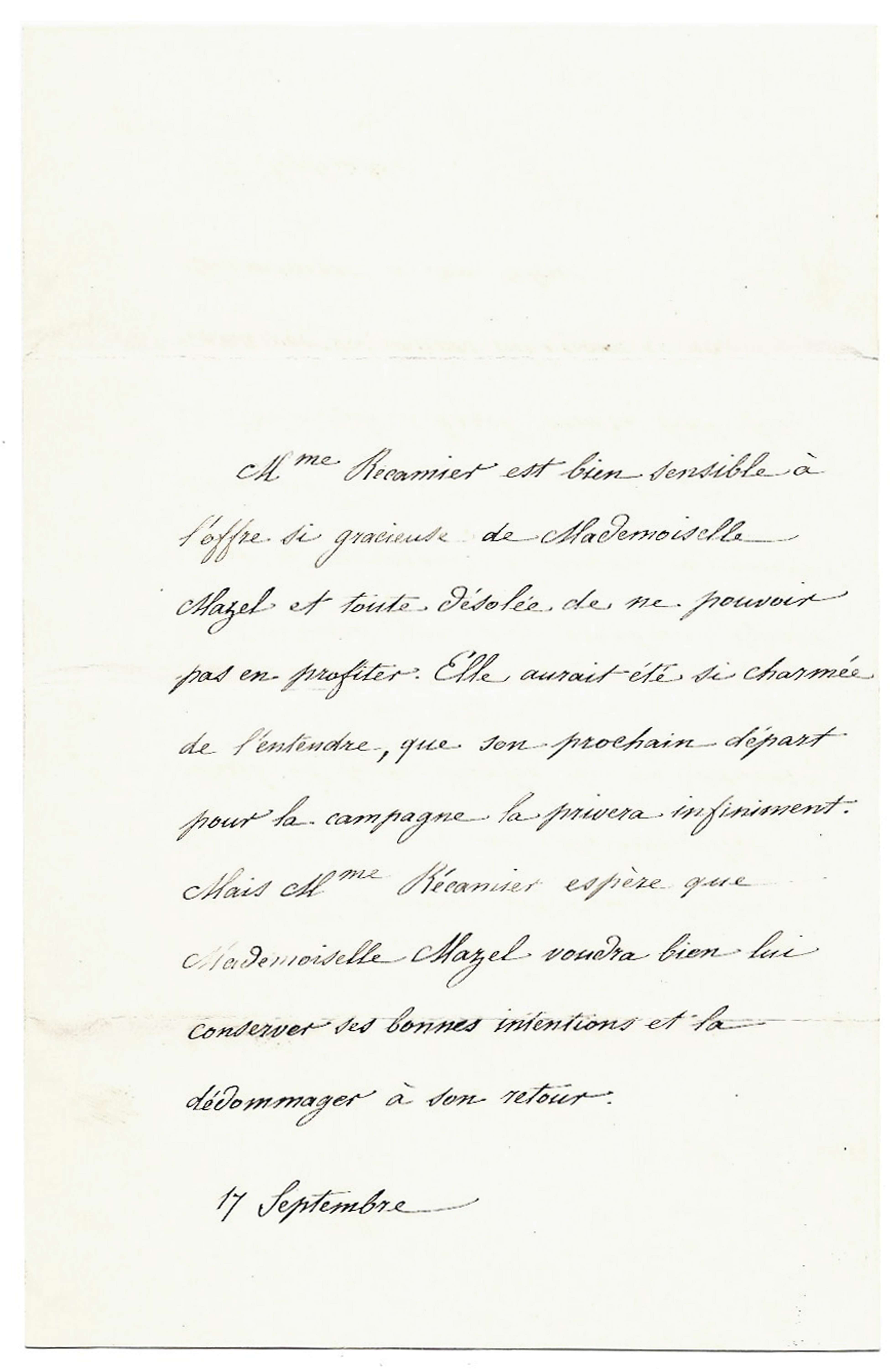 « Mme Récamier est bien sensible à l’offre si gracieuse de Mademoiselle Mazel et toute désolée de ne pouvoir pas en profiter […] Mais Mme Récamier espère que Mademoiselle Mazel voudra bien lui conserver ses bonnes intentions […] »