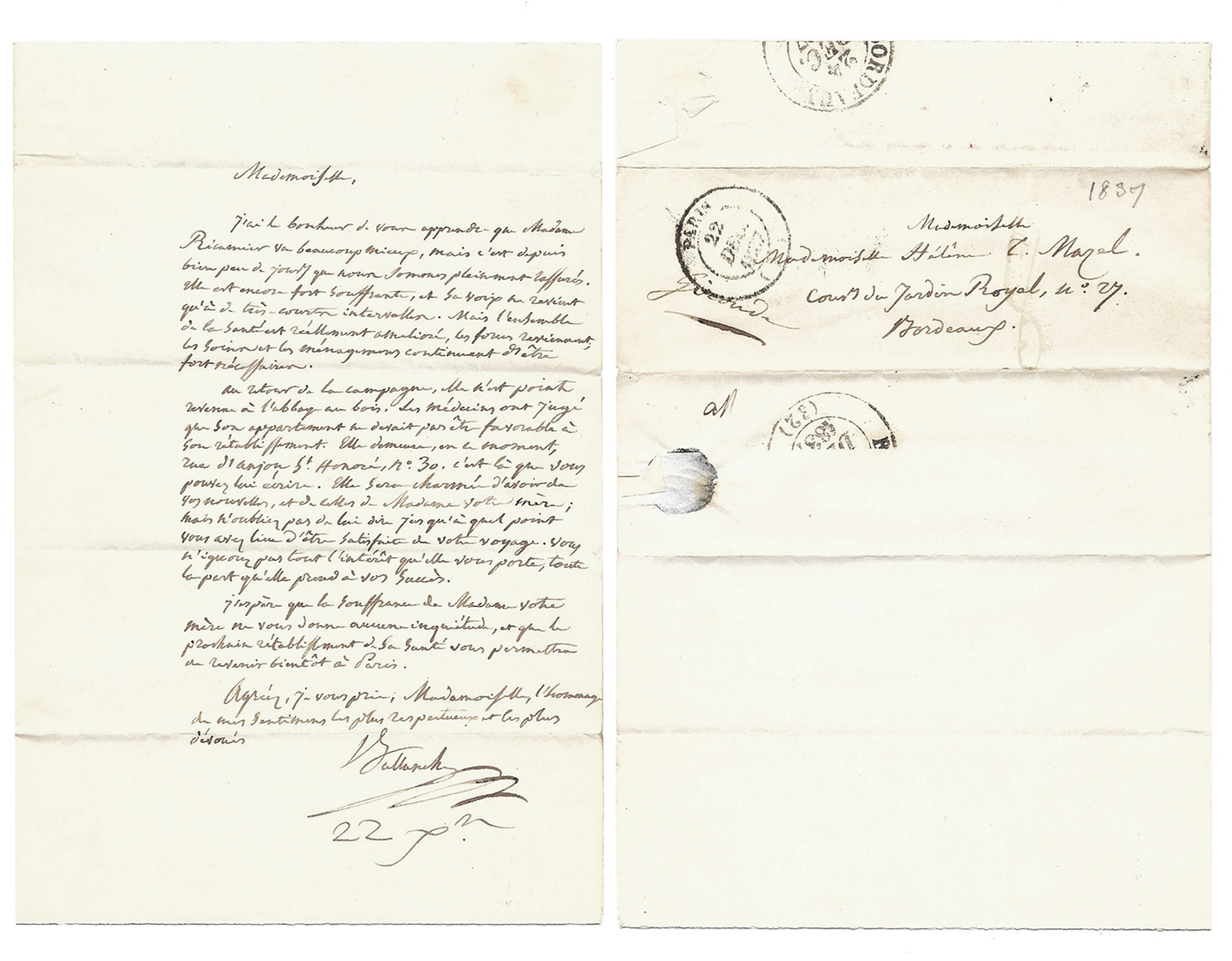 « Mademoiselle, Madame Récamier me charge de vous dire combien elle a été sensible à l’intérêt que vous voulez bien prendre de sa santé et à votre aimable souvenir. Ses yeux on déjà éprouvé une amélioration par suite de deux opérations et l’on attend un succès complet de la troisième qui aura lieu d’ici quelques semaines […] rien ne pourra guérir le chagrin inconsolable que lui a causé la perte de ses amis [Chateaubriand était mort dans ses bras l’année précédente].