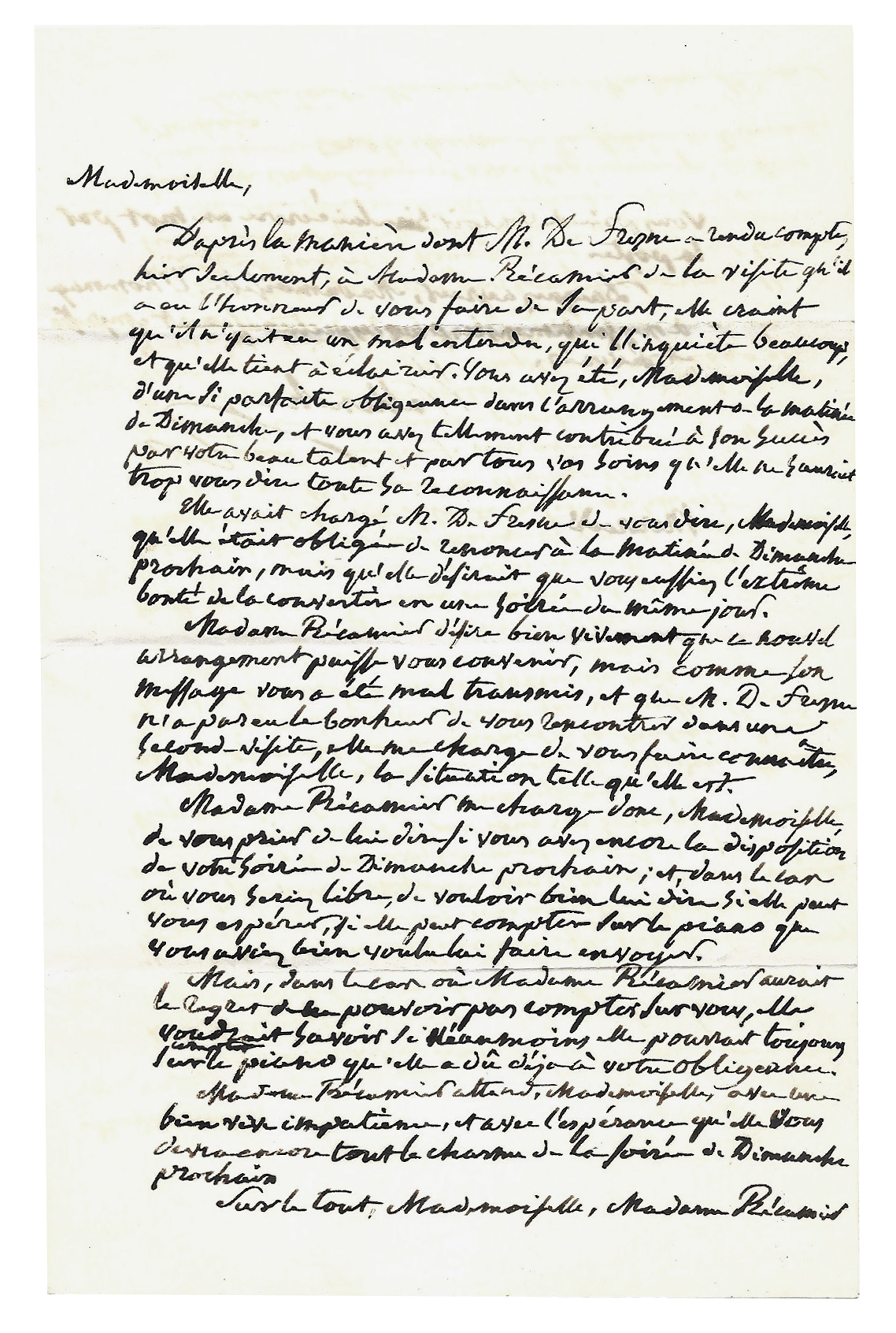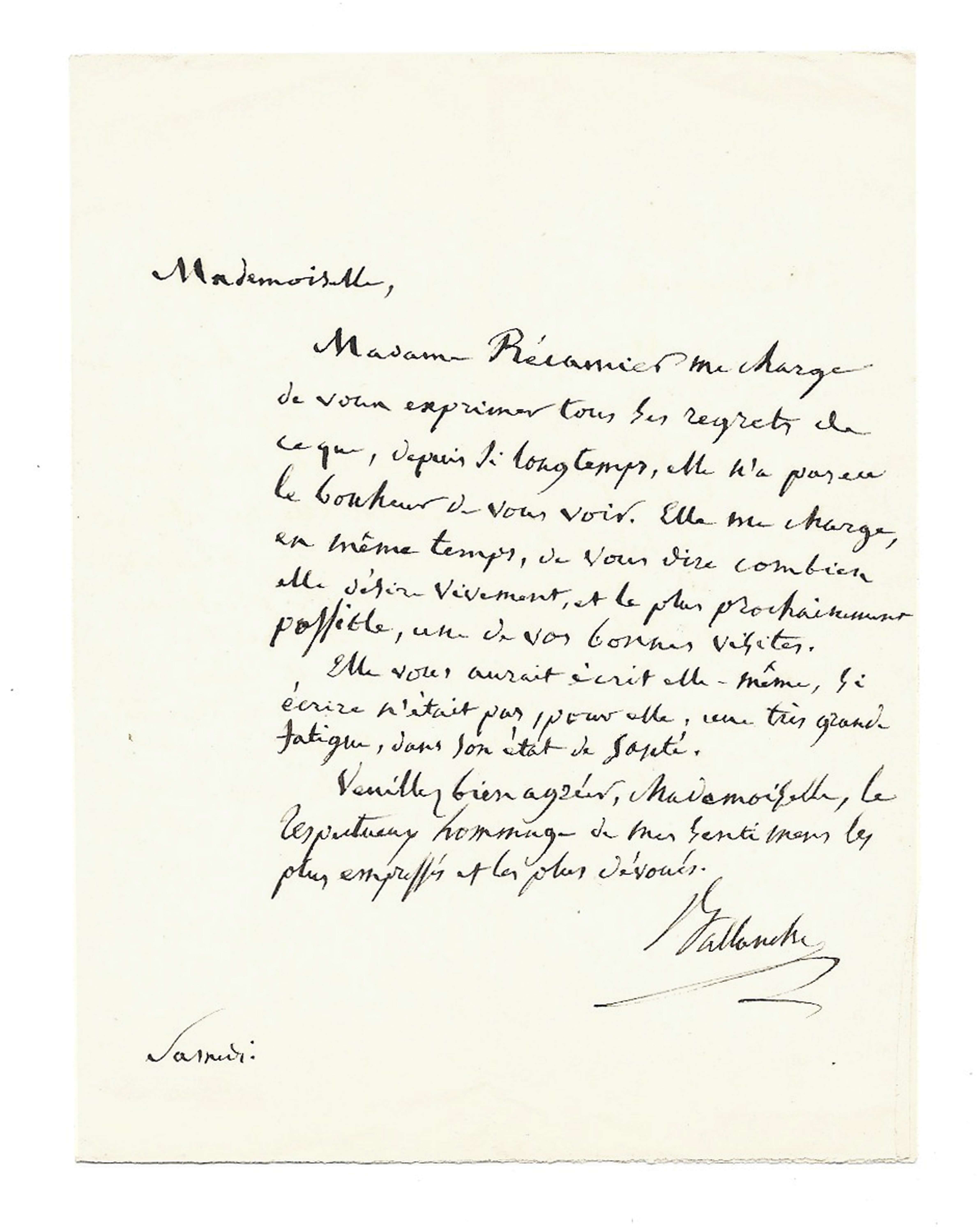 « Mademoiselle, Madame Récamier me charge de vous exprimer tous ses regrets de ce que, depuis si longtemps, elle n’a pas eu le bonheur de vous voir. Elle me charge, en même temps, de vous dire combien elle désire vivement, et le plus prochainement possible, une de vos bonnes visites.