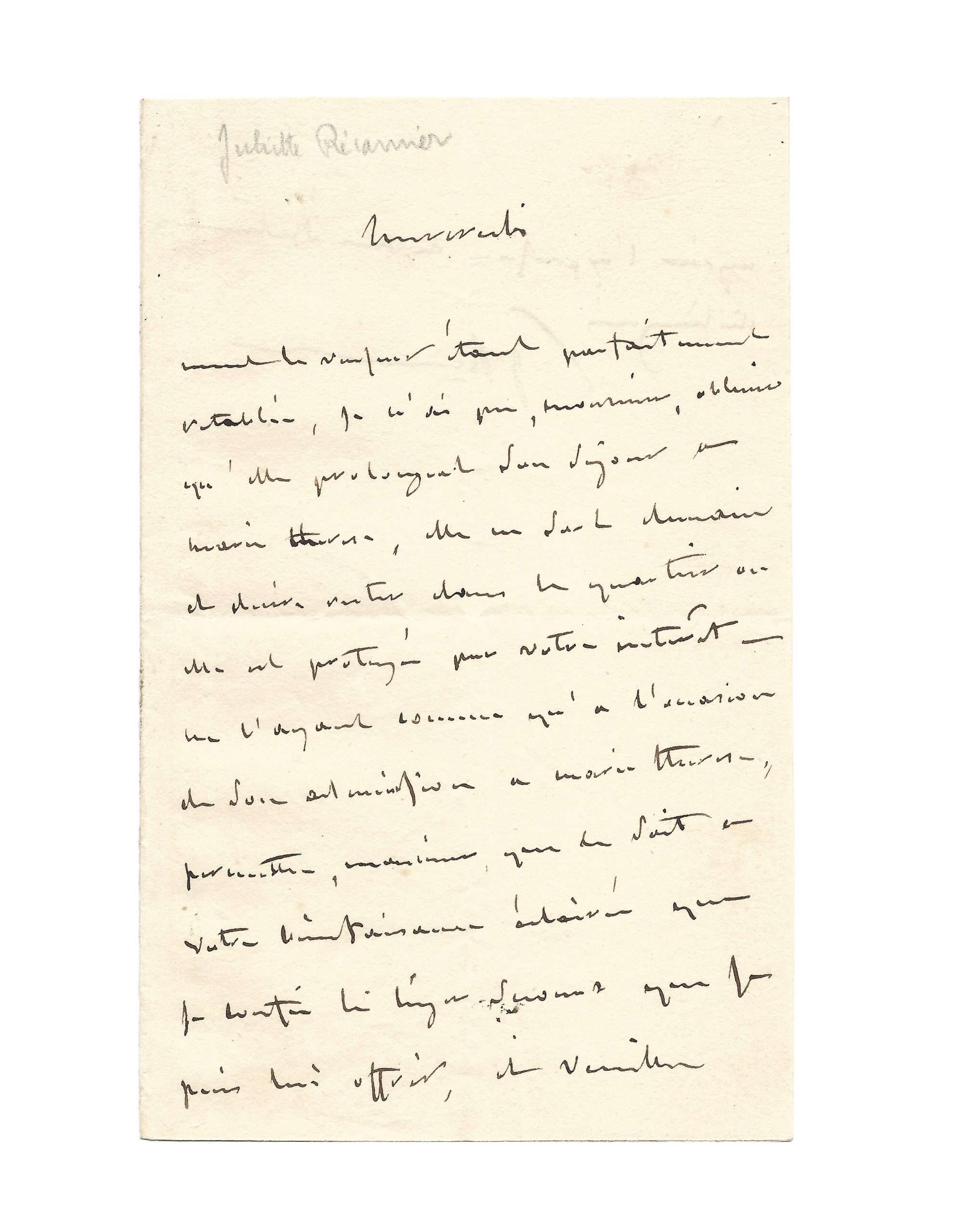 “Mad[ame] Le Vasseur étant parfaitement rétablie, je n’ai pu, Monsieur, obtenir qu’elle prolongeât son séjour à Marie-Thérèse, elle en sort demain et désire rester dans le quartier où elle est protégée par votre intérêt. Ne l’ayant connue qu’à l’occasion de son admission a Marie-Thérèse, permettez, Monsieur, que ce soit à votre bienfaisance éclairée que je confie le léger secours que je puis lui offrir, et veuillez agréer l’expression de mes sentiments distingués.