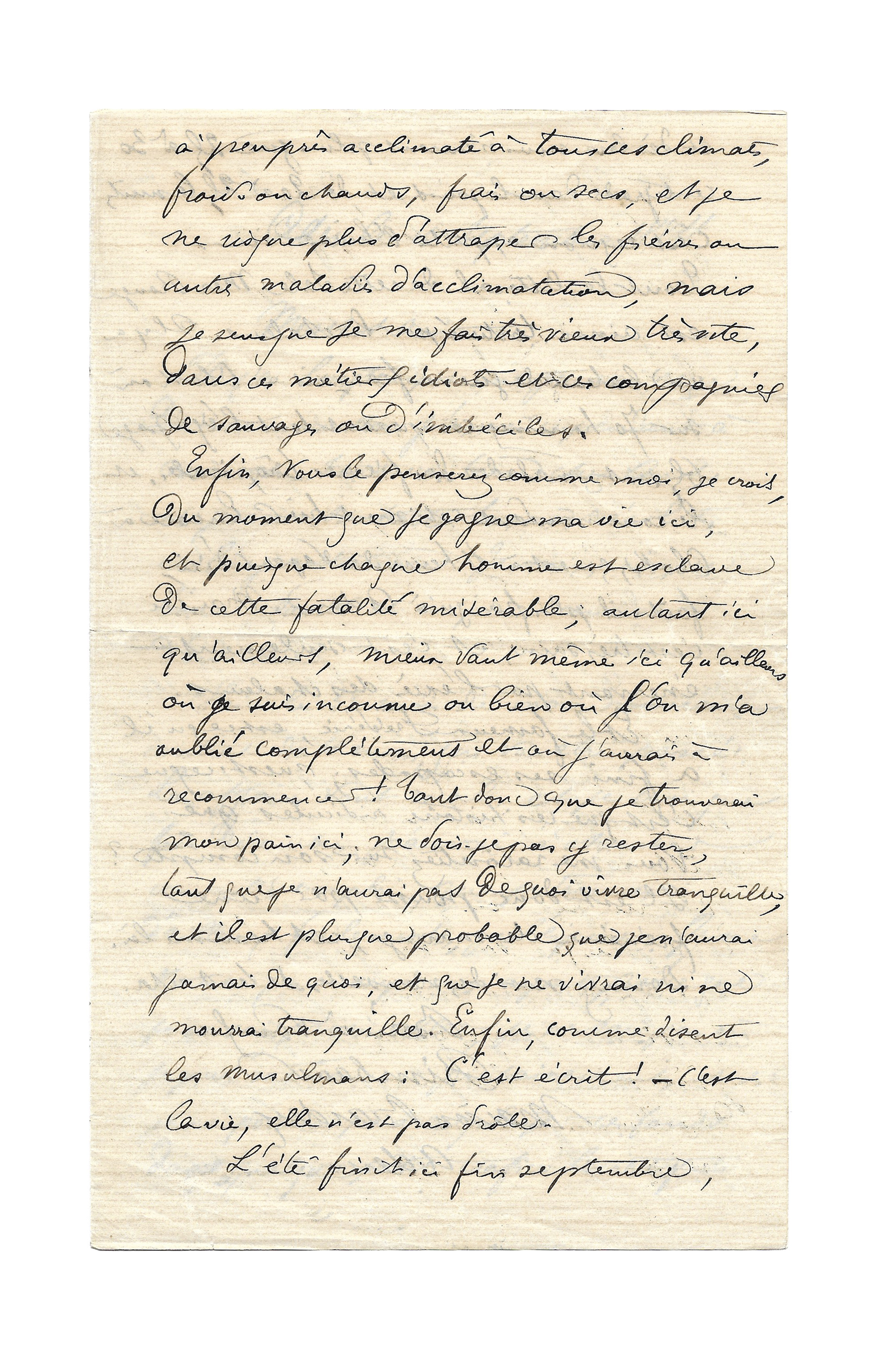Enfin, vous le penserez comme moi, je crois, du moment que je gagne ma vie ici, et puisque chaque homme est esclave en cette fatalité misérable, autant ici qu’ailleurs où je suis inconnu ou bien où l’on m’a oublié complètement et où j’aurai à recommencer ! Tant donc que je trouverai mon pain ici, ne dois-je pas y rester, tant que je n’aurai pas de quoi vivre tranquille et il est plus que probable que je n’aurai jamais de quoi, et que je ne vivrai ni ne mourrai tranquille. Enfin, comme disent les musulmans : C’est écrit ! – C’est la vie, elle n’est pas drôle.