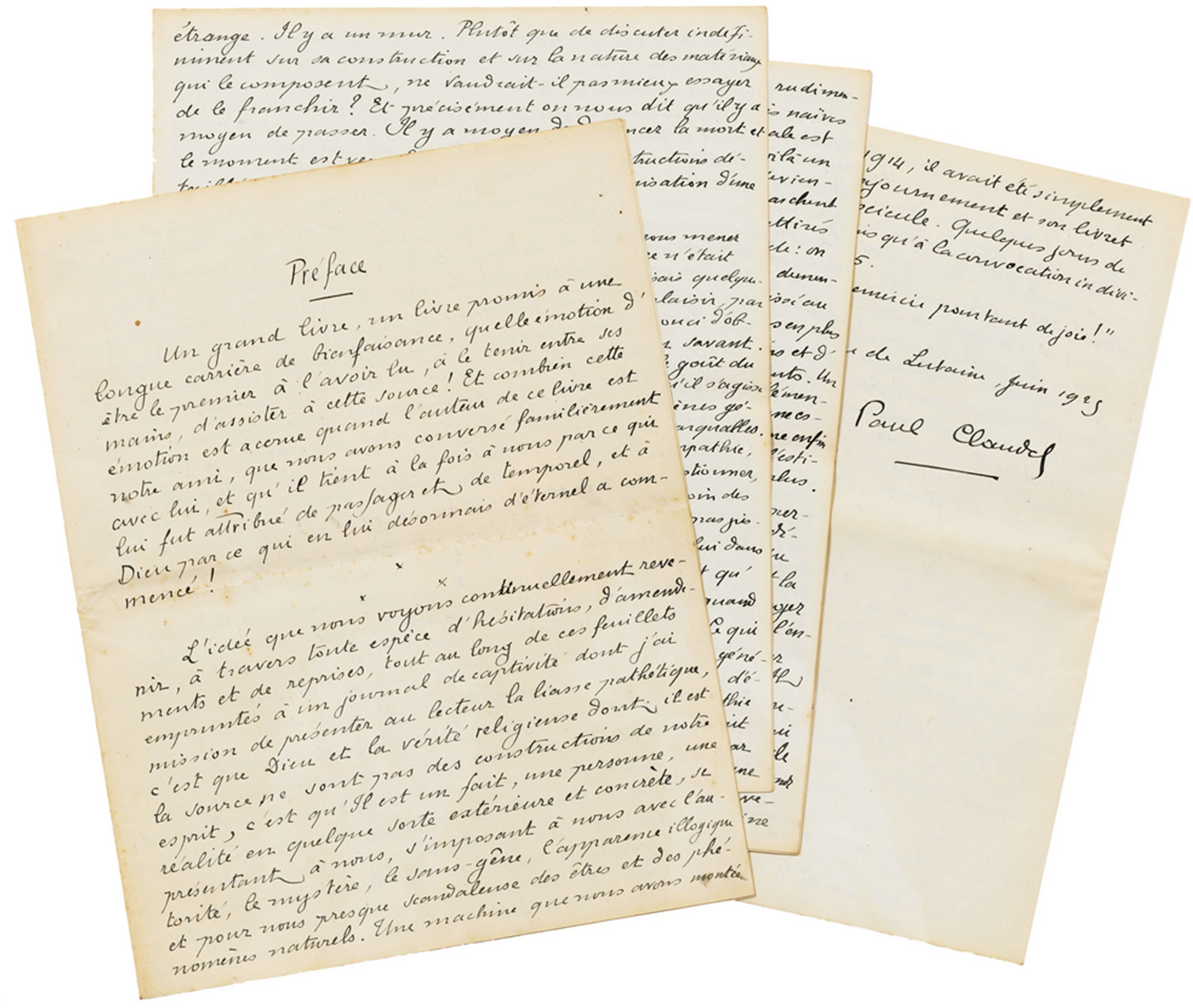 Complete manuscript of his preface to Jacques Rivière’s novel: À la trace de Dieu